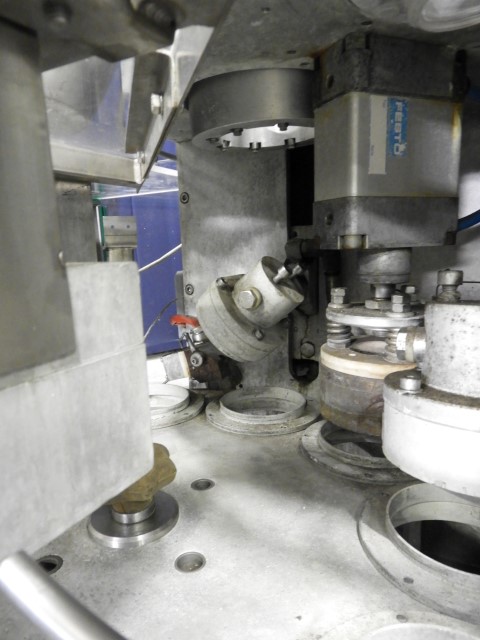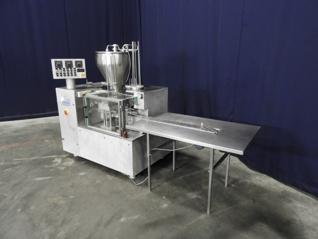 Rotary cup filling and sealing machine with 1 piston filling head. 10-Steps. Cup size round: 95 mm. Stations: cup destacking, piston main doser for viscose products with double jacketed hopper with spraybowls for cleaning without agitator, dispending by vacuum of preformed seals, heat sealing, snap cap cover station and outfeed conveyor with packing table. Manual packaging in tray. Control panel with relay controls. Machine enclosed with plexiglass guards.