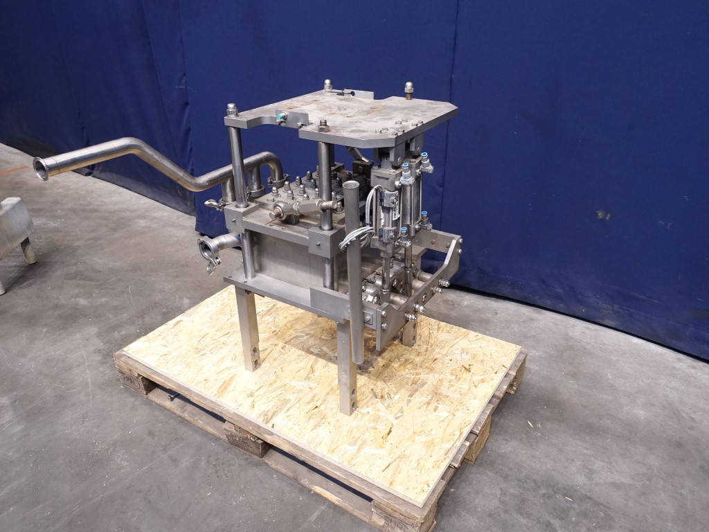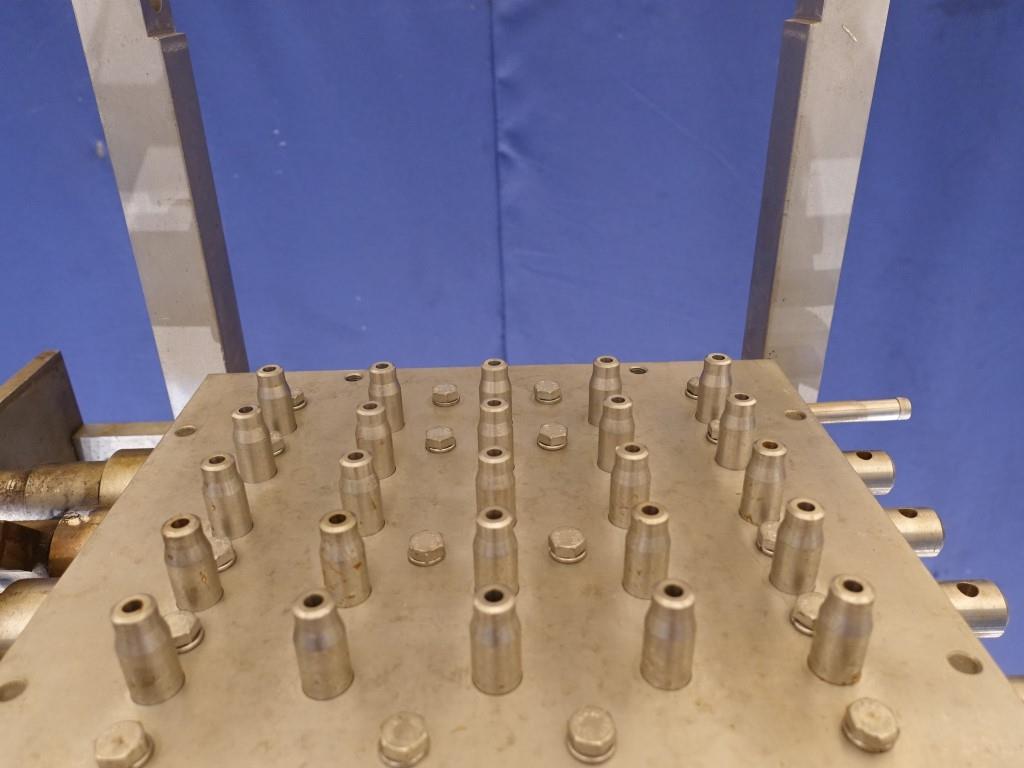 Hassia dosing head for a form fill seal machine for hotel/mini portions. Execution: 5 x 5. Distance between filling nozzles 4 mm (between lines) and 5,4 mm (between heads). Total dimensions: 70 x 60 x 90 cm. Dosing head with 3 connections to fill 3 different products in 1 doser 2x5,2x5 and 1 x 5, suitable for sauses up to 20,4ml