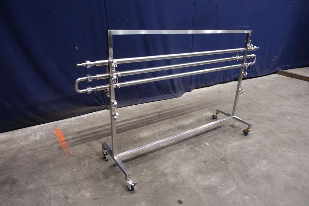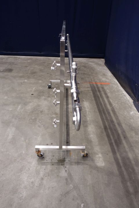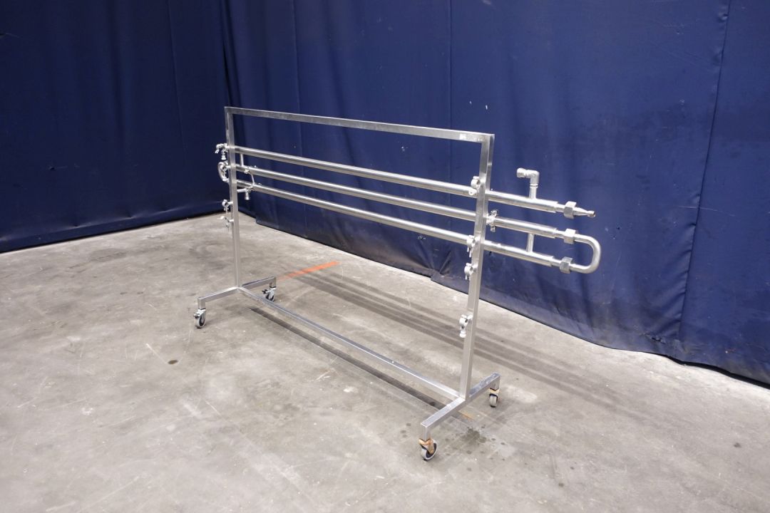 Tubular heat exchanger, sanitary (THE). Monotube, 1 compartments, Straight design, 3 tubes, 1 section. Length inner tube: 200 cm, length outer tube 180 cm. Outer diameter 38 mm, inner diameter: 22,5 mm. Connections: product: 1" SMS, Service: 16 mm SMS (measured inside). Including bends, on stainless steel mobile frame. static mixer - by swirl shapped inner part, 5 pieces - 2x1mtr per tube so 1 missing. Total dimensions: 225 x 50 x 116 cm. Weigth: 30 kg's. Designed for viscose products mixing and heating.