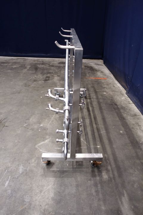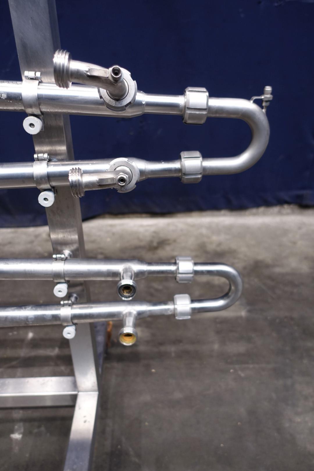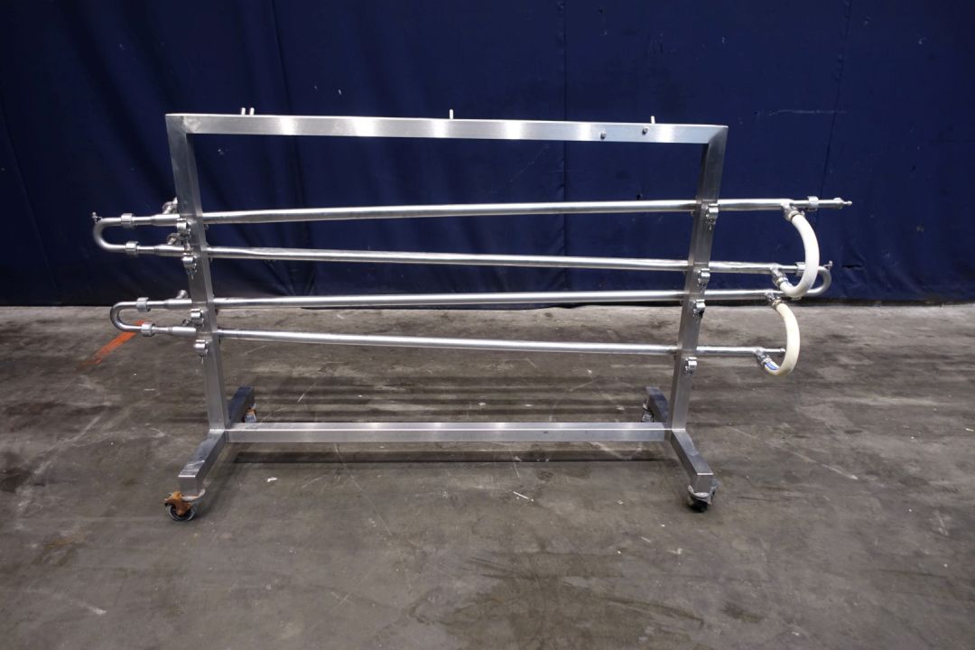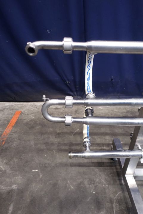 Tubular heat exchanger, sanitary (THE) and static mixer to have optiomal heatexchanging. Monotube, 1 compartment, Straight design with swirls, 4 tubes, 1 section, Length: 2 mtr, outer diameter 38 mm, inner diameter: 25,8 mm. surface: 0,162m2/tube = 0,64m2 total. Connections product 8 x 1"SMS, Service: 2 x 18,7 mm DIN, including bends, Stainless steel mobile frame. Total dimensions: lxwxh: 237 x 60 x 116 cm. Weight: 49 kg. Designed for heating or cooling viscose products.