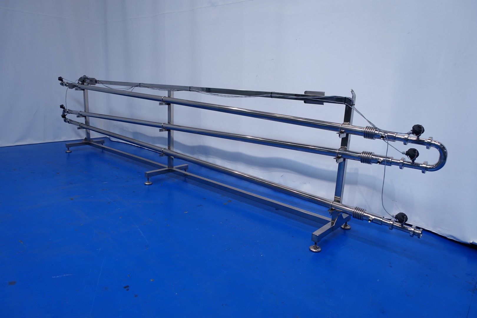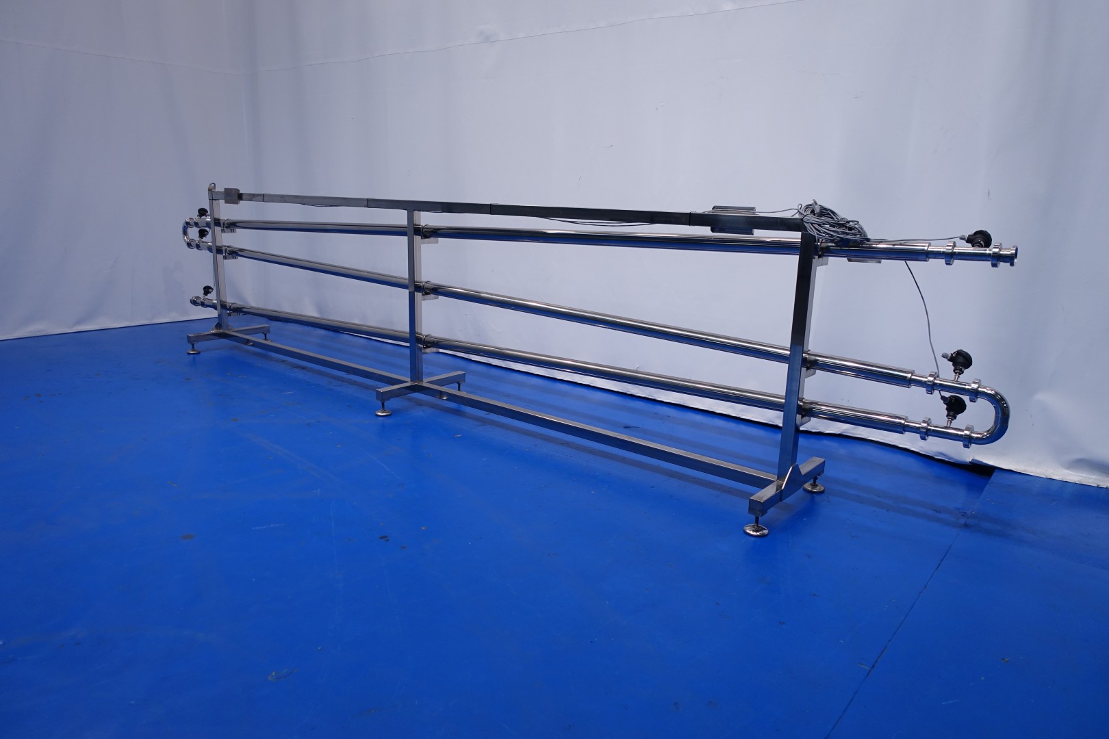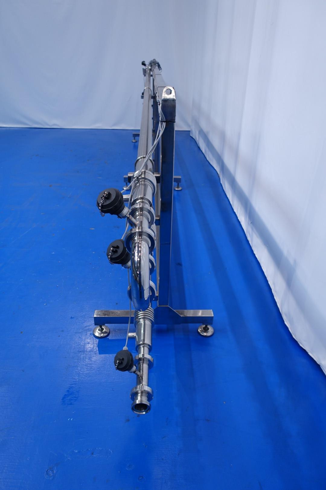 Tubular heat exchanger, sanitary (THE). unused! Monotube, 1 compartment, straight design, 3 tubes, 1 section, Length jacketed part: 5.82 mtr, outer diameter 77 mm, inner diameter: ca. 50 mm. Surface area per tube 0,914 m2. Connection: product: DN50 Din, Service: 24 mm thread coupling. Tubes including bends and 3x expansion piece. On stainless steel frame with 6x adjustable feet. With 6x PT100 temperature sensor. Max pressure shell: 10/1 bar - max pressure tube: 10/1 bar. Volume shell: 14 ltr. Volume Tubes: 11 ltr Total dimensions: 650x70x137 (lxwxh) cm - weight: 220 kg.
