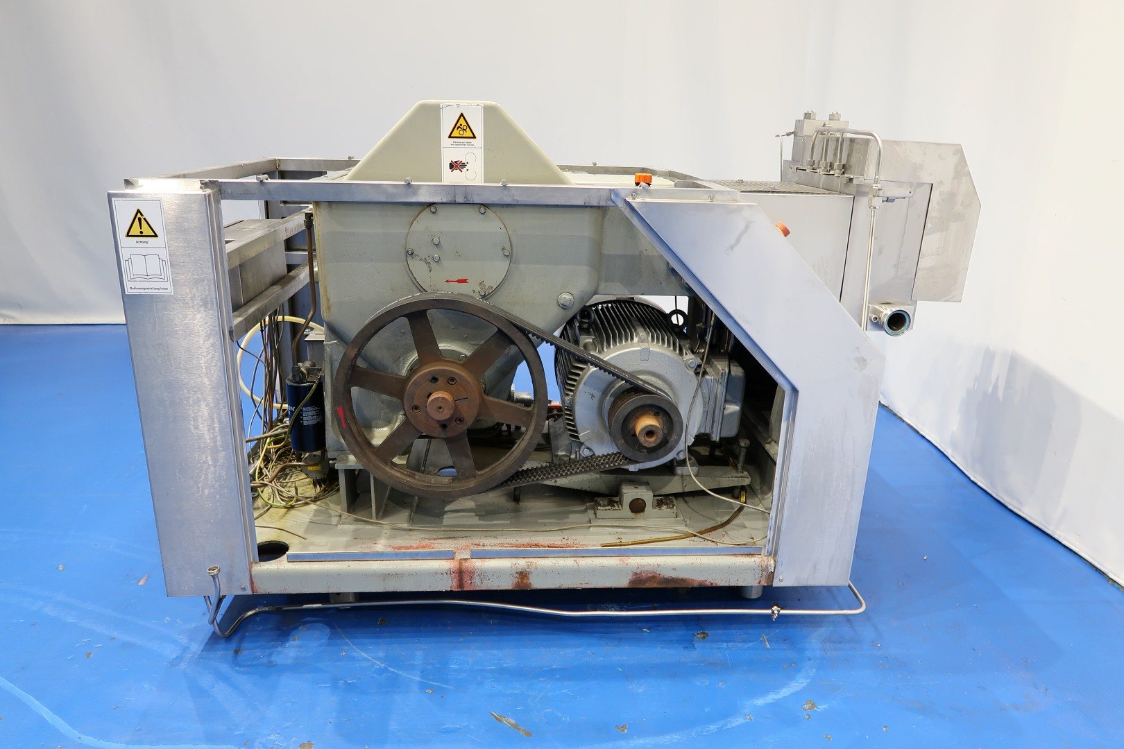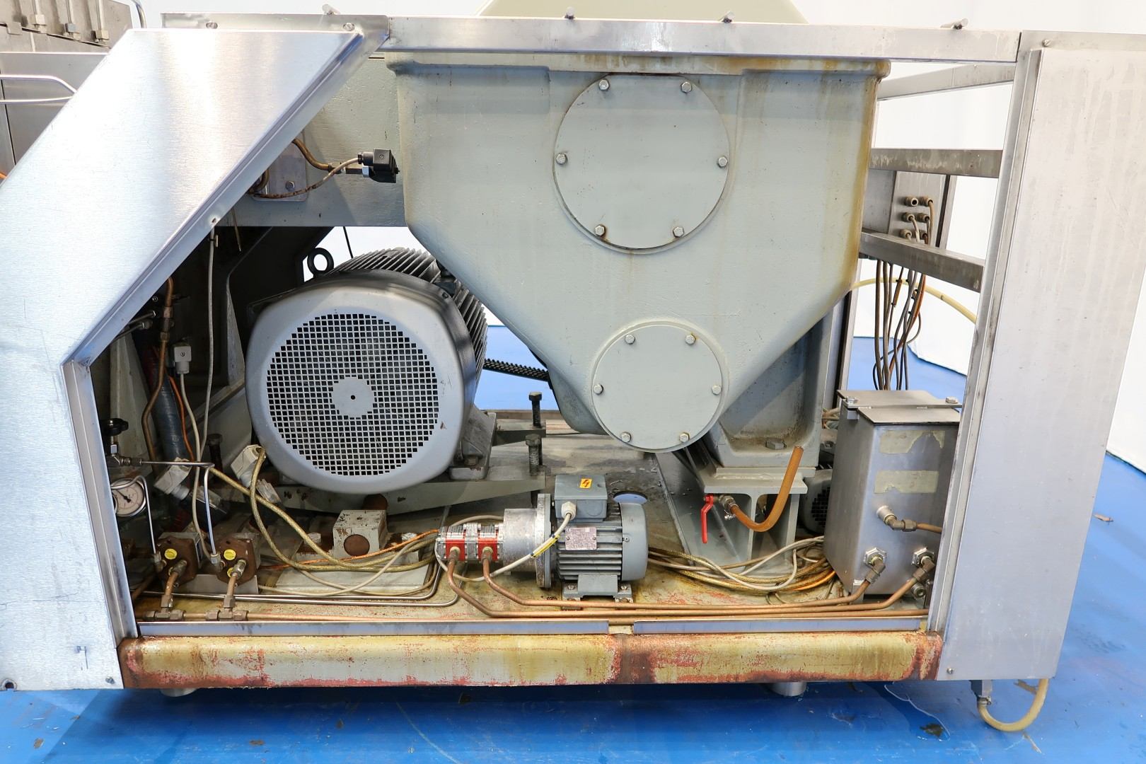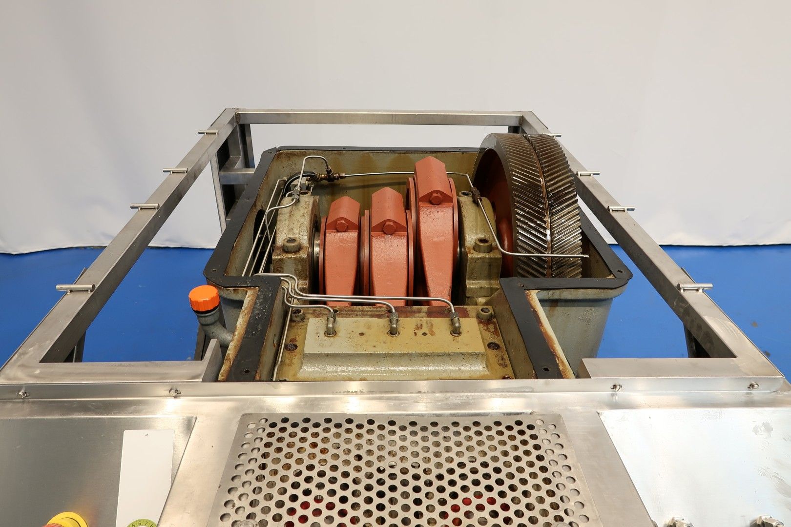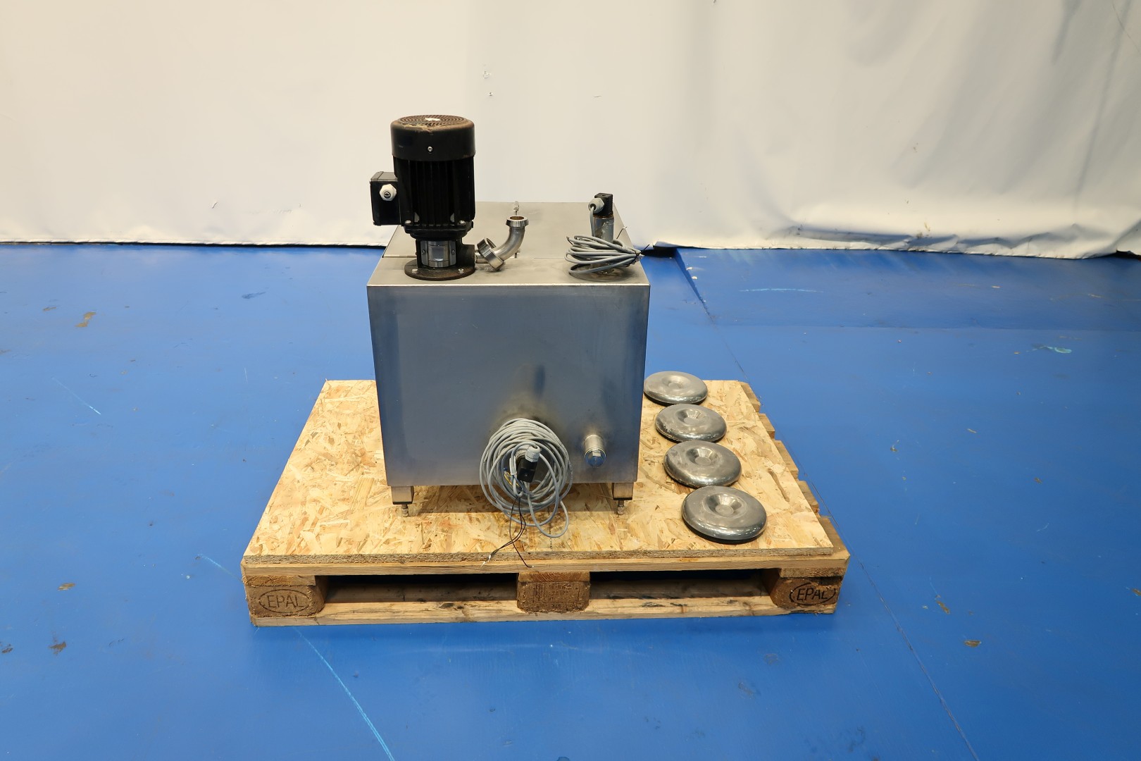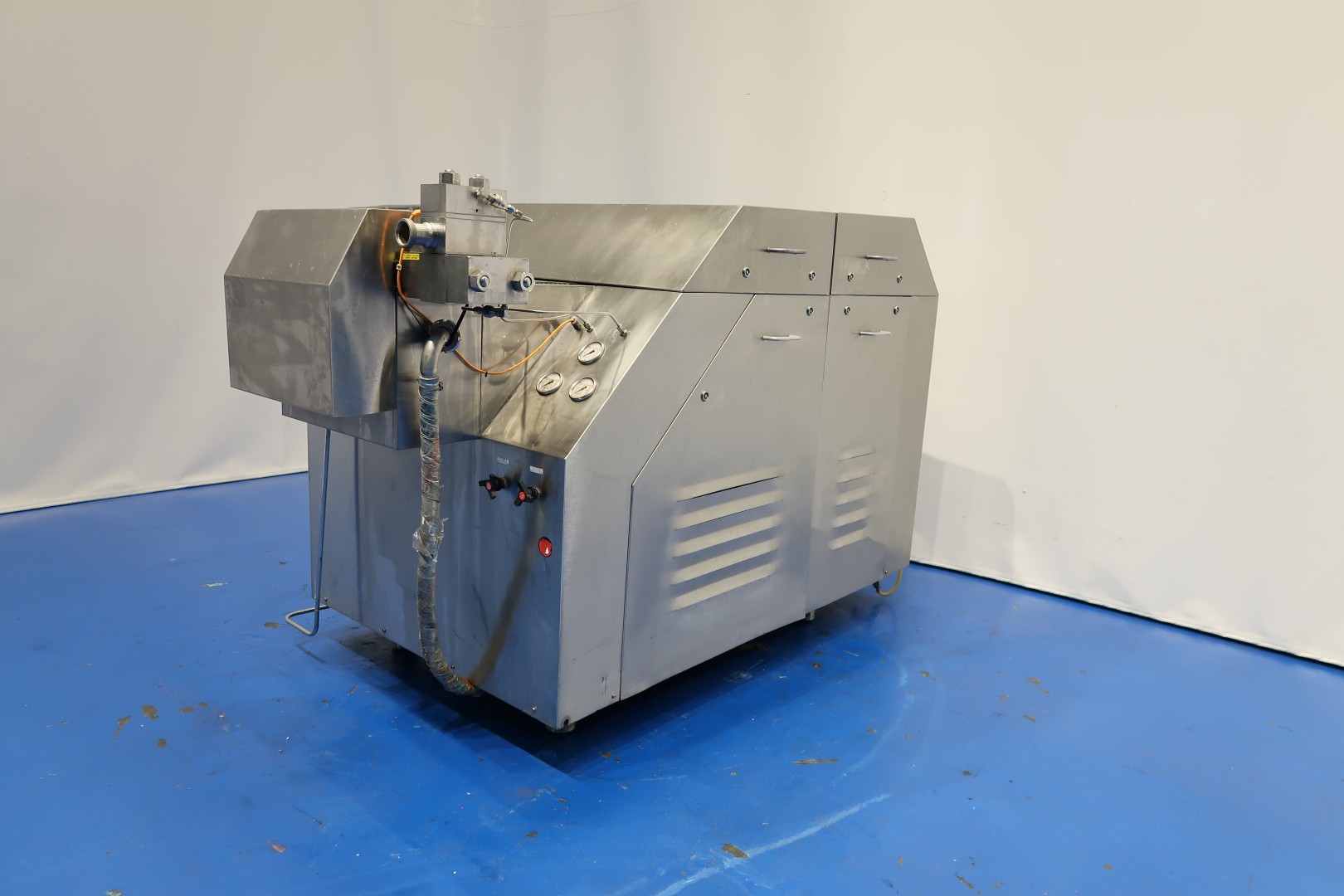 High pressure homogeniser. 2 stages with hydraulic pressure control. 3 Pistons, piston diameter: 2" (50,8mm). Stainless steel cladded. Connections: 1 x 1,5" SMS and 1 x 2" Din. motor power: 37 kW and maximum pressure in current confirguration with this motor 200 bar. Overpressure valve. 1 x Product Pressure transmitter (IFM) with display. 3 oil pressure manometer on machine. Flowswitch on cooling water, 2 oil cooler, 2 oil circulation pumps (pressure and oil circulation). External Water circulation tank with 2 x levelsensor, capacity ca. 90 ltr for lubrication water on the pistons circulation. No controls. including documentation. Total dimensions homogeniser: 204x115x133 (lxwxh) cm - weight: 2.491 kg.
