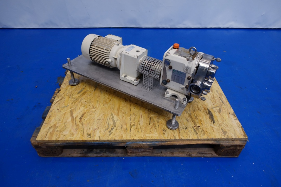 Lobbe pump with duo stainless steel lobbes. Diameter lobbes: 110 mm. Displacement per revolution: 0,22 ltr. Nominal capacity 2.400 ltr/h. Current drive work: motor: 1,5 kW - ca. 3,55 A - 1.430 rpm. Speed 180 rpm. Stainless steel cover over electric motor. Pressure 15,0 bar. Mounted on SS plate with adjustable feet. Connections: (in) 1,5" Din / (out) 1,5" Din. Total dimensions: 97x38x50 (lxwxh) cm - weight: 156 kg.