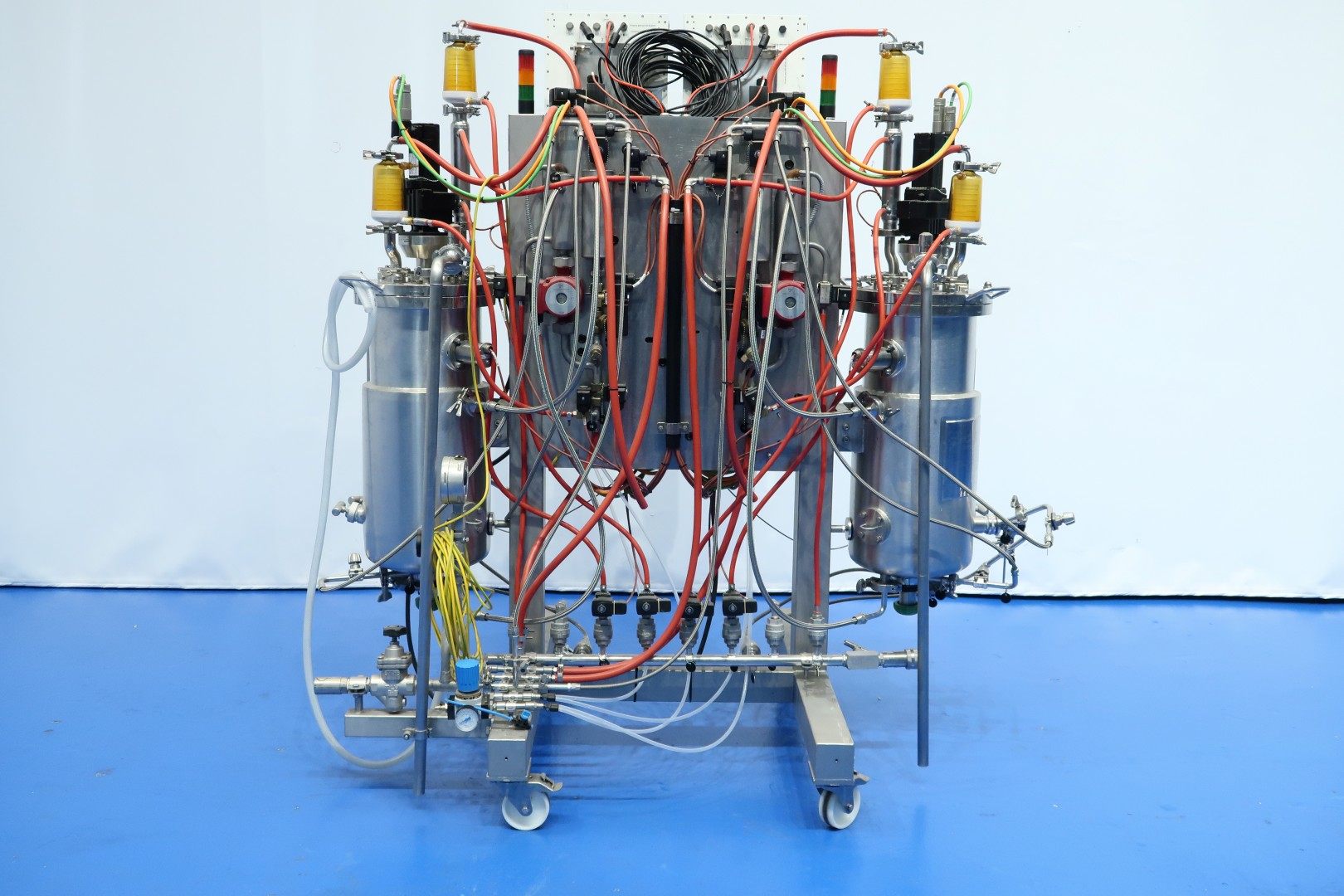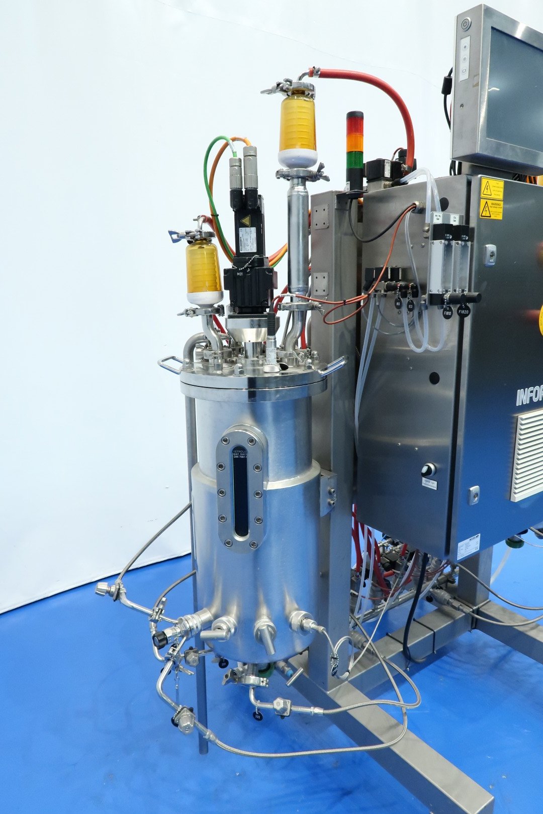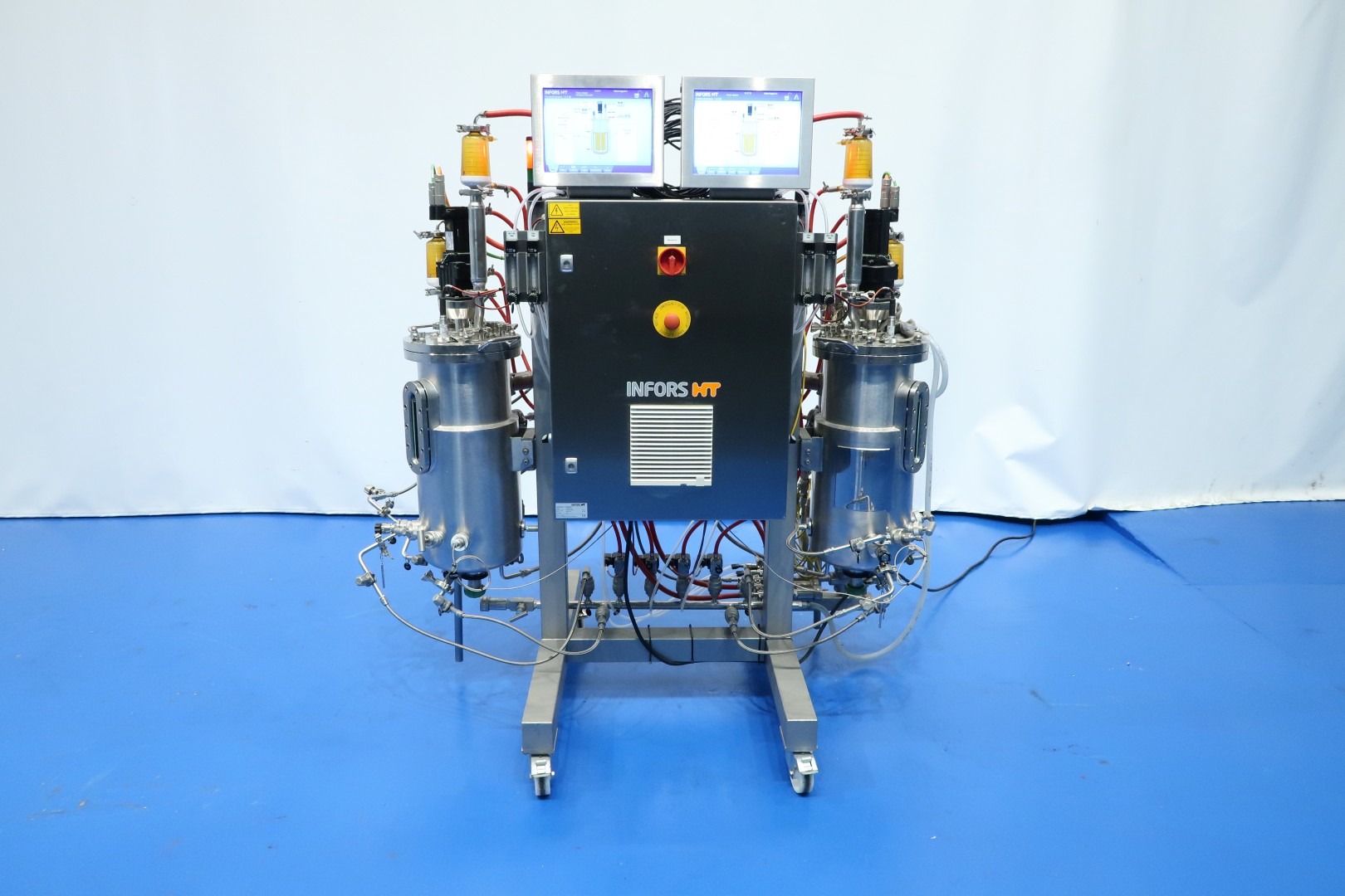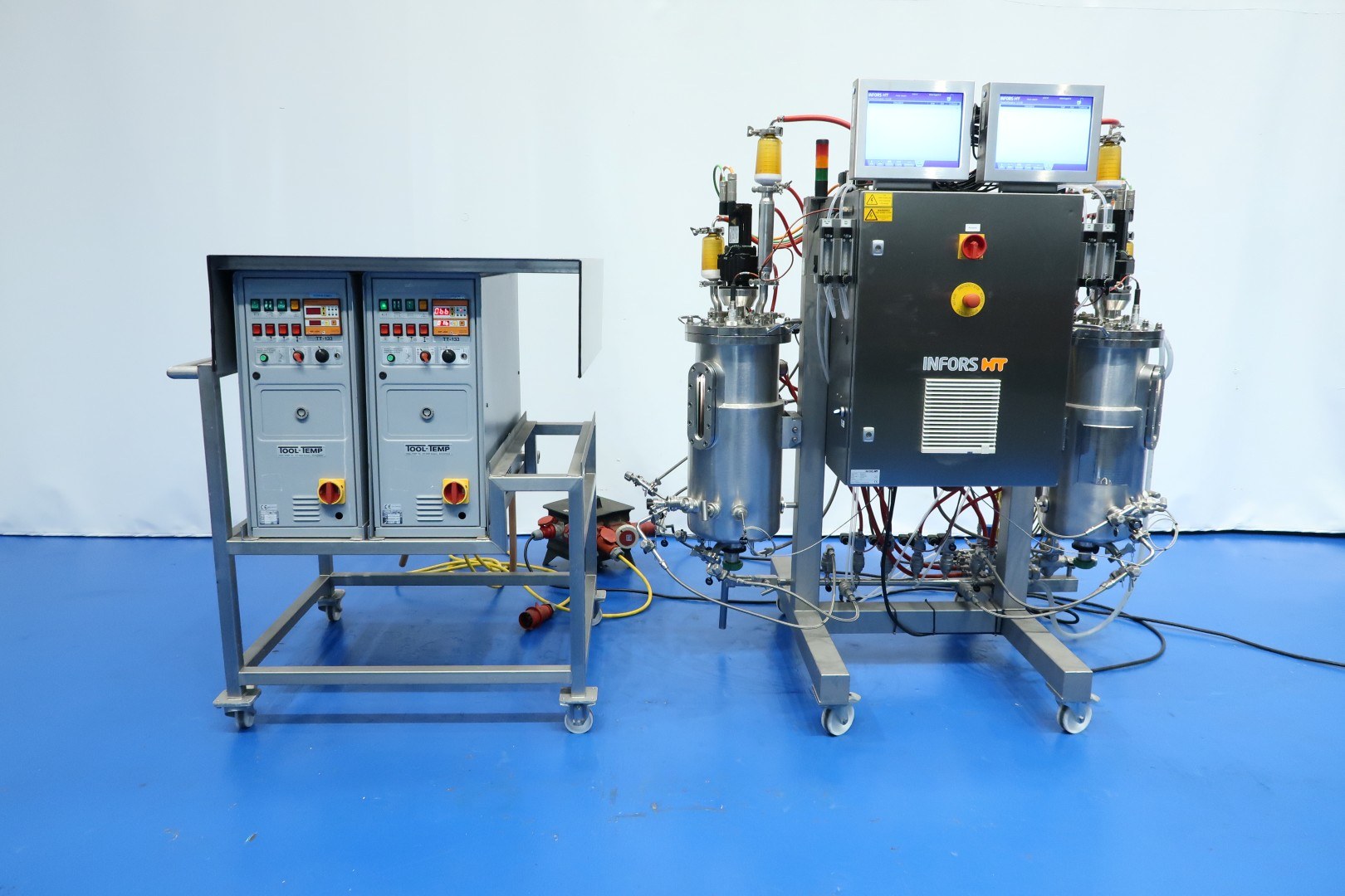 Double bioreactor. Used for fungal applications. Condition: very good. Vessel woking volume 2 x 20 ltr. - jacket 2,0 ltr. - Total volume 2 x 30 ltr. With i.a. following systems/sensors: Air/N2 gas system - Co2 gas system - temperature sensor in vessel and jacket - pressure sensor in lid - both vessels with oval sight glass - both vessels with internal lamp - both vessels with U-shaped agitator (speed frequency controlled servomotor). Material SS 316 (1.4404) and 304L (1.4307). With 2 x Tool-Temp AG, TT-133 pre-heater (water bath) system. Power 2x 13,9 kW. Controls bioreactor: Siemens/Infors with 2 x HMI touch screen. Dimensions bioreactor: 180x100x177 (lxwxh) cm - weight: 237 kg. Dimensions pre-heater: 105x100x132 (lxwxh) cm - weight: 225 kg.