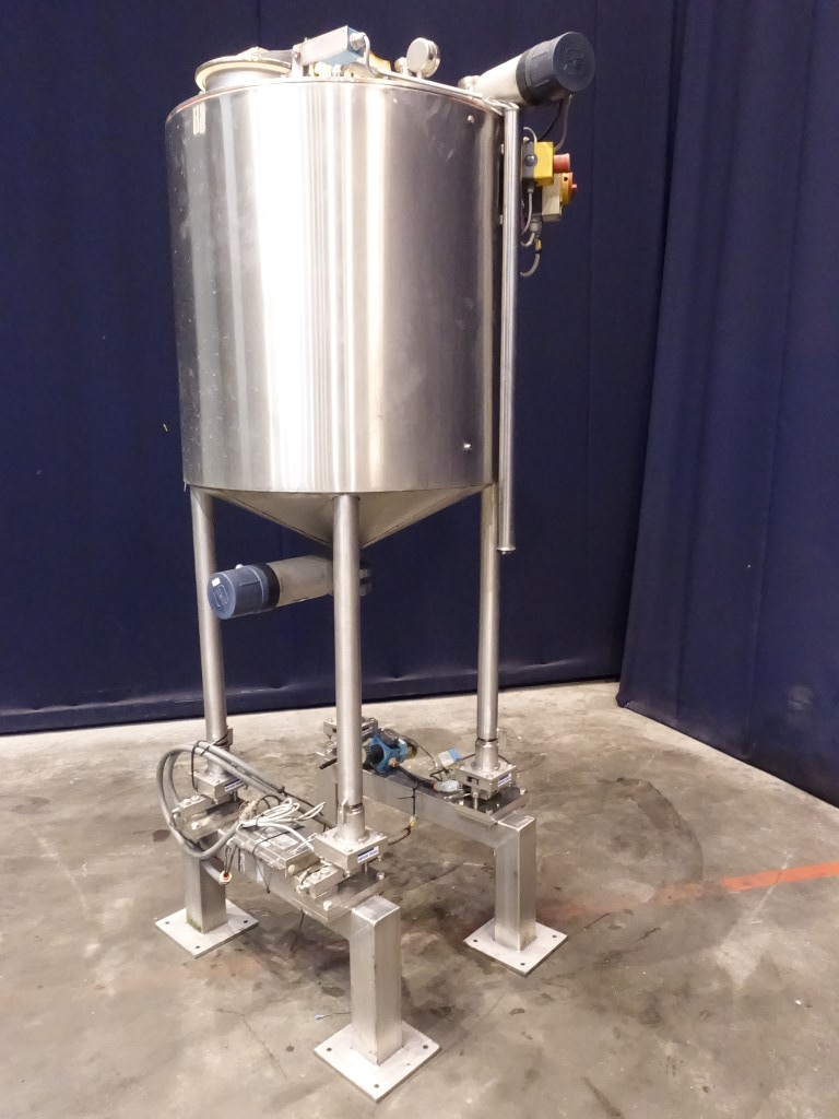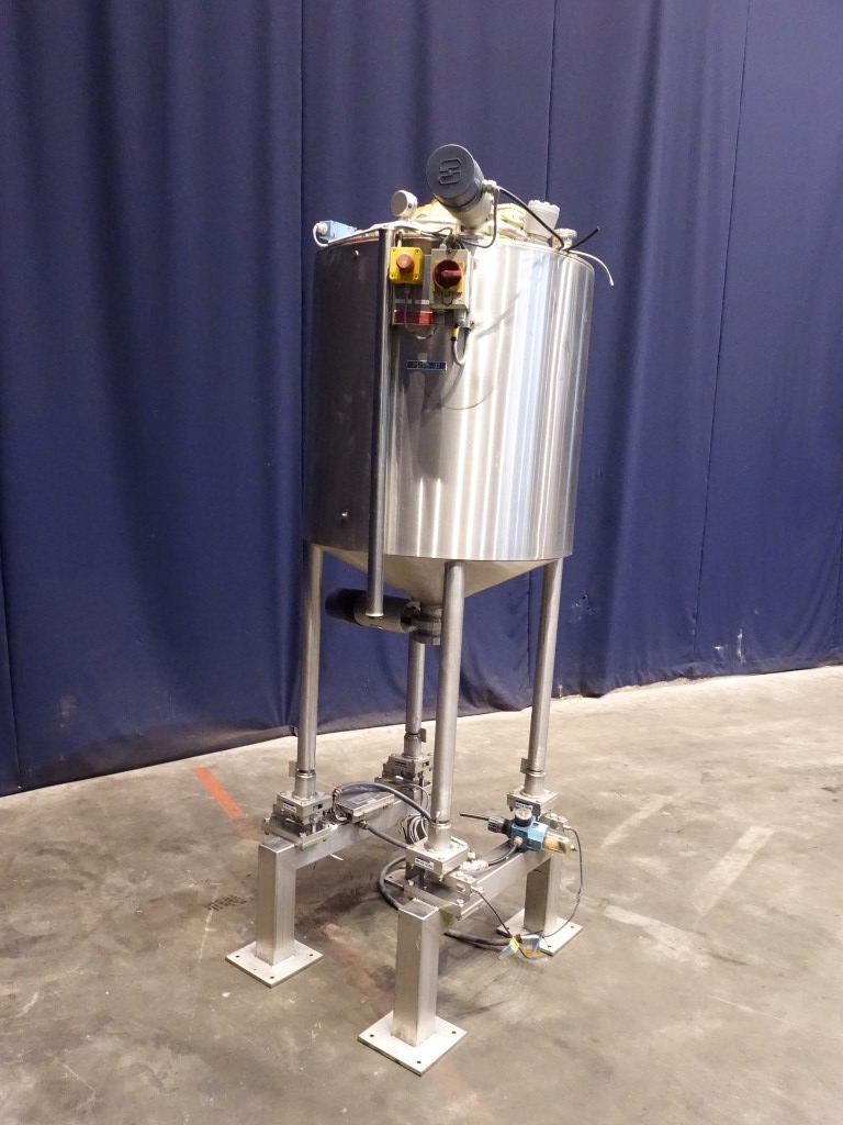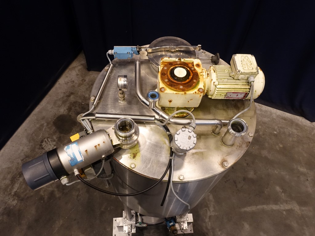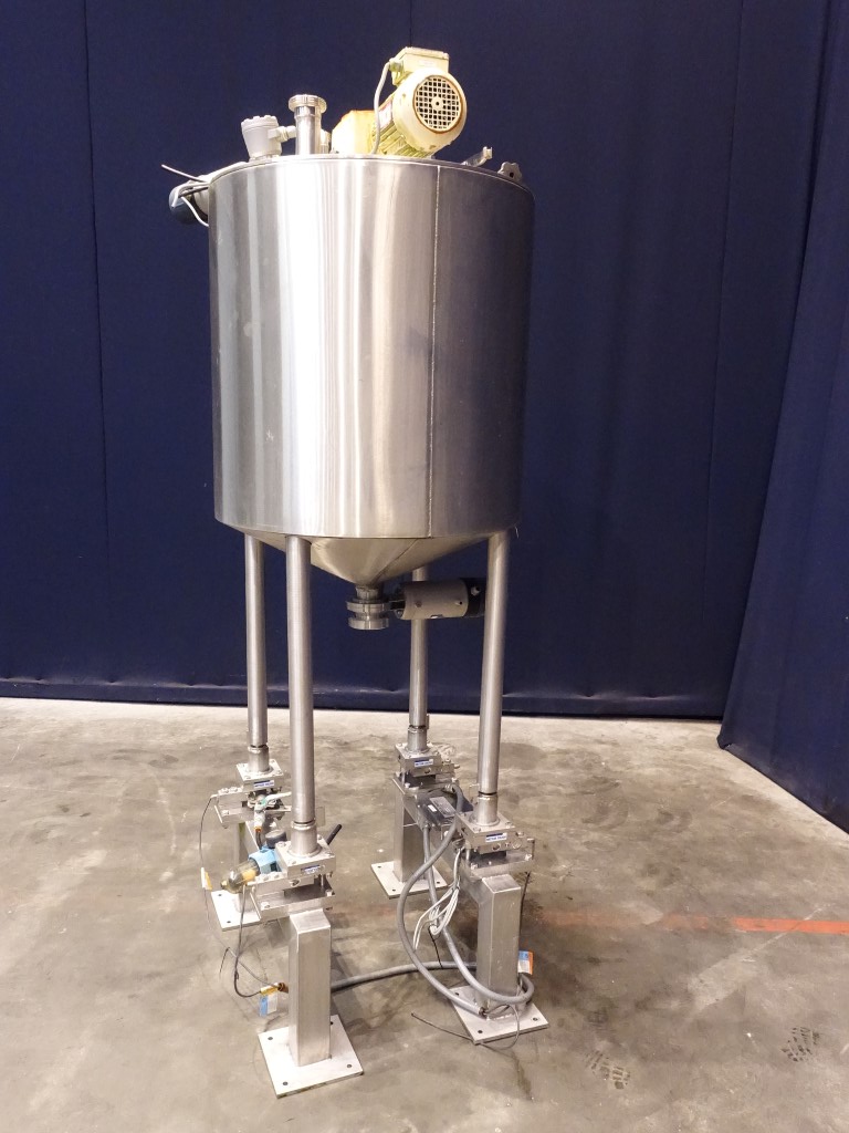 Insulated tank with 'U' shaped agitator - 0,75 kW - 28 rpm - 2,2 A. Flat to the side, product Outlet DIN. With pneumatic valve on top, pneumatic bottom valve, outlet height: ..cm. On top of the tank a pt-100 temp sensor, pressure transmitter, high and low level, 2 cip spray bowls, manhole in top round diameter 19,5 cm. 4 Feet with 4 loadcells, Mettler Toledo weighing system type 0958. Innner dimensions of tank diameter 70 cm, cylindrical height 75 cm, cylindrical and concial height 90 cm. Outer dimensions lxwxh: 97 x 72 x 223 cm.