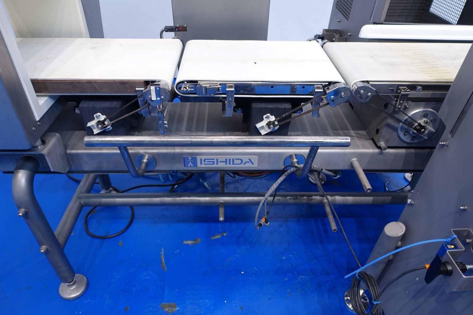Metal detector and check weigher. Max through put, size of product on conveyor: 300x195 (wxh) mm. Max apperture size: 375x250 (wxh) mm. Max product weight 3.300 gram and min product weight: 125 gram. Including conveyor in 3 parts 180x30 (lxw) cm. Ejecting system by 2 x mechanical arm with 2 SS collection bins. Total dimensions: 180x160x160 (lxwxh) - weight: 364 kg.