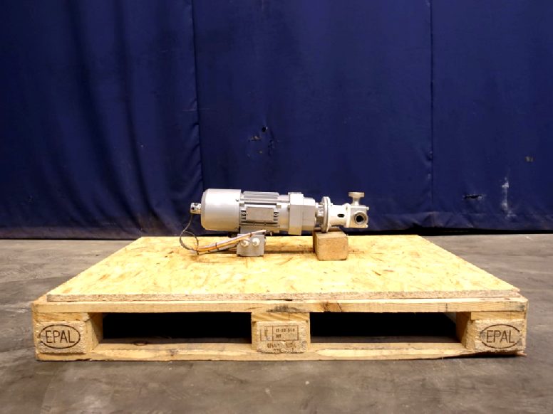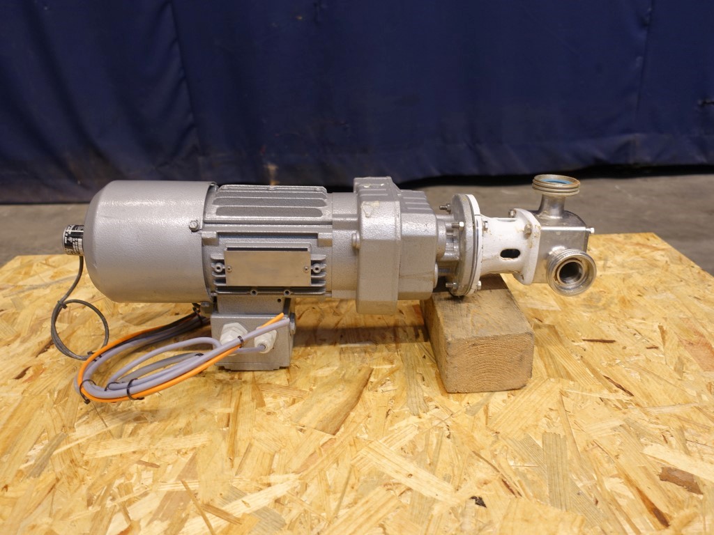 Pureflo' Hygienic Self-Priming Flexible Impeller Pump. Current motor: 0,55 kW -2,68 A - n1: 1370 rpm - n2: 244 rpm. Impellor diameter: 65 mm. Up to 330 litres/minute at 3m head @ 1500 rpm. Max. differential pressure 1 bar. Connections: 1'' / 1'', DIN.