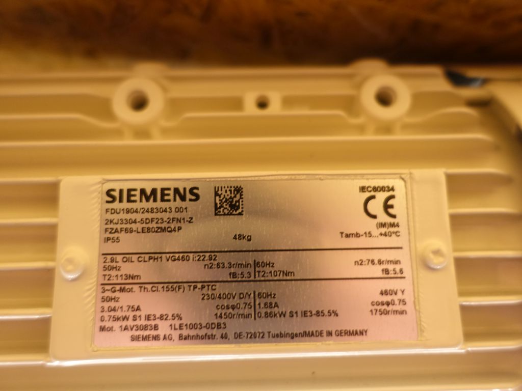 Unused drivework for an agitator in a tank. Motor: 0,75 kW - 1,75 A - n1: 1450 rpm - i: 22,92 - n2: 63,3 rpm.