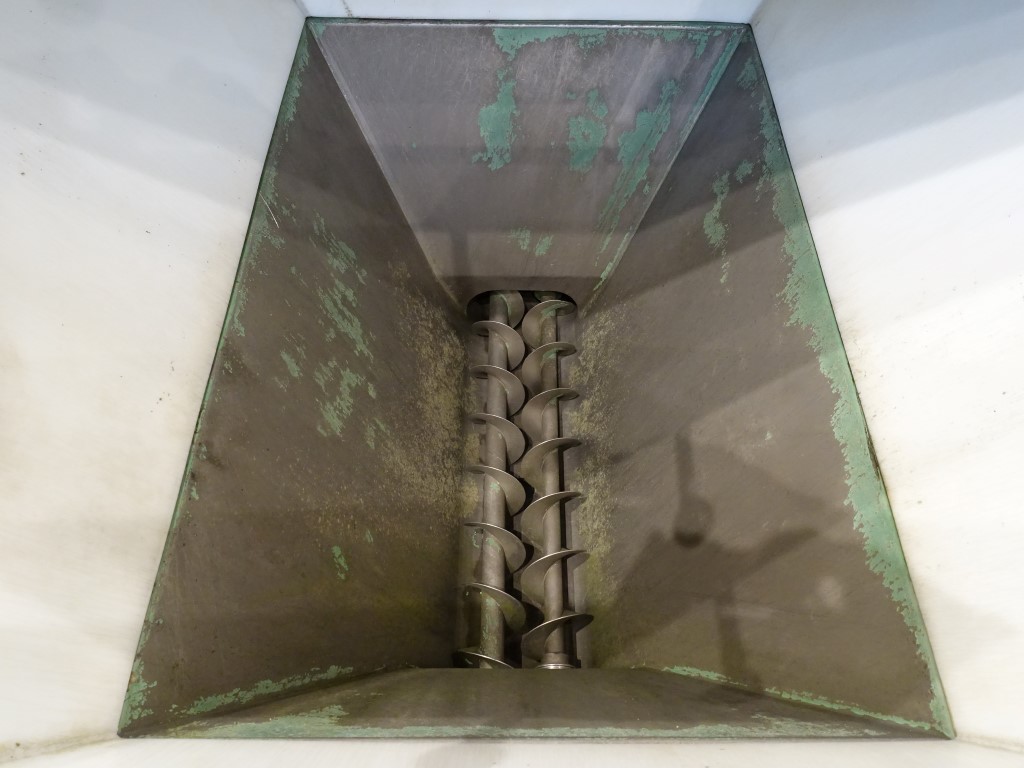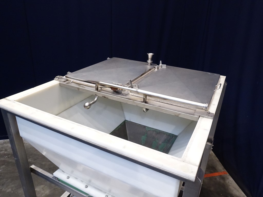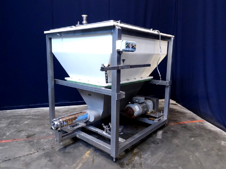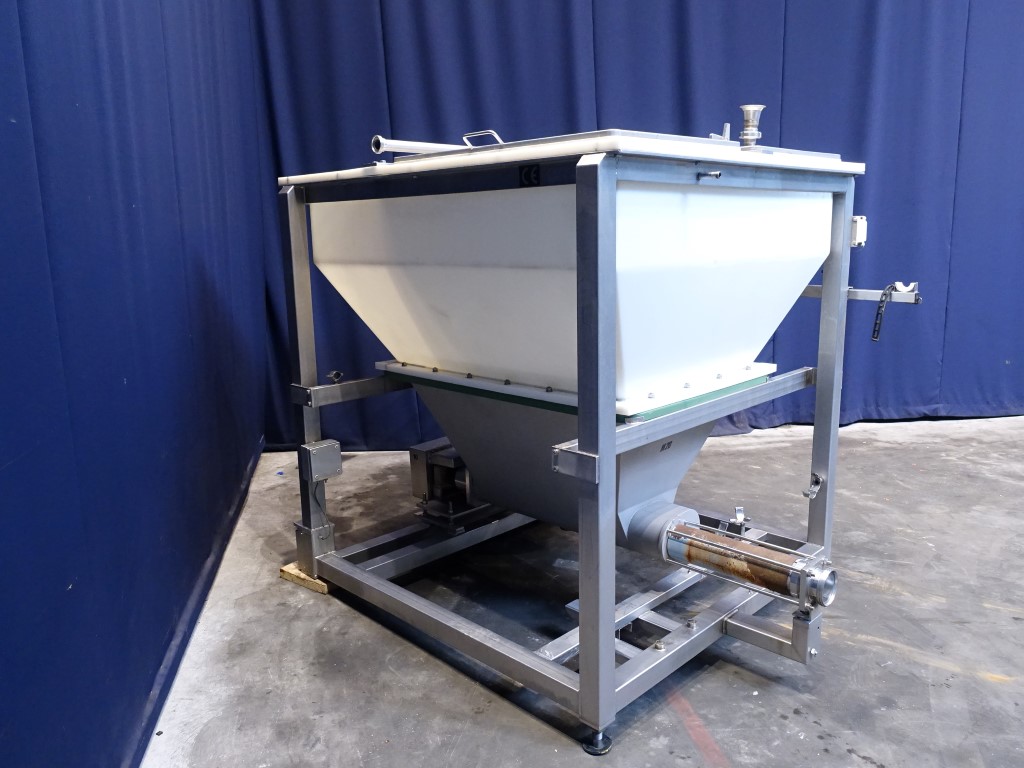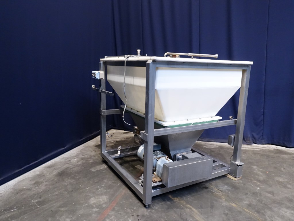 Hopper with 2 augers and excentric screw pump. Bottom of hopper stainless steel with stainless steel augers. Top part of hopper polycarbonate. Open top with 3 covers. 2 CIP spraybowls. Augers and excentric screw pump on 1 motor. Motor: 7,5 kW - 14,7 A - n1: 1430 rpm - n2: 237 rpm. Stator diameter ± 125 mm and stator length: 50 cm. Outlet connection: 4'' DIN. Outlet height: 40 cm. To be used as feed system of blended / grinded cheese after a ribbon or peddle mixer to a cooker. Total dimensions: 180 x 220 x 210 cm.