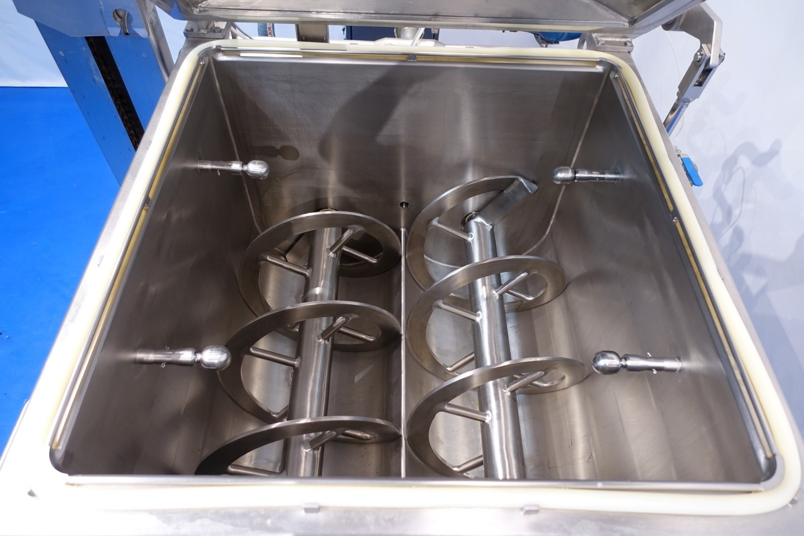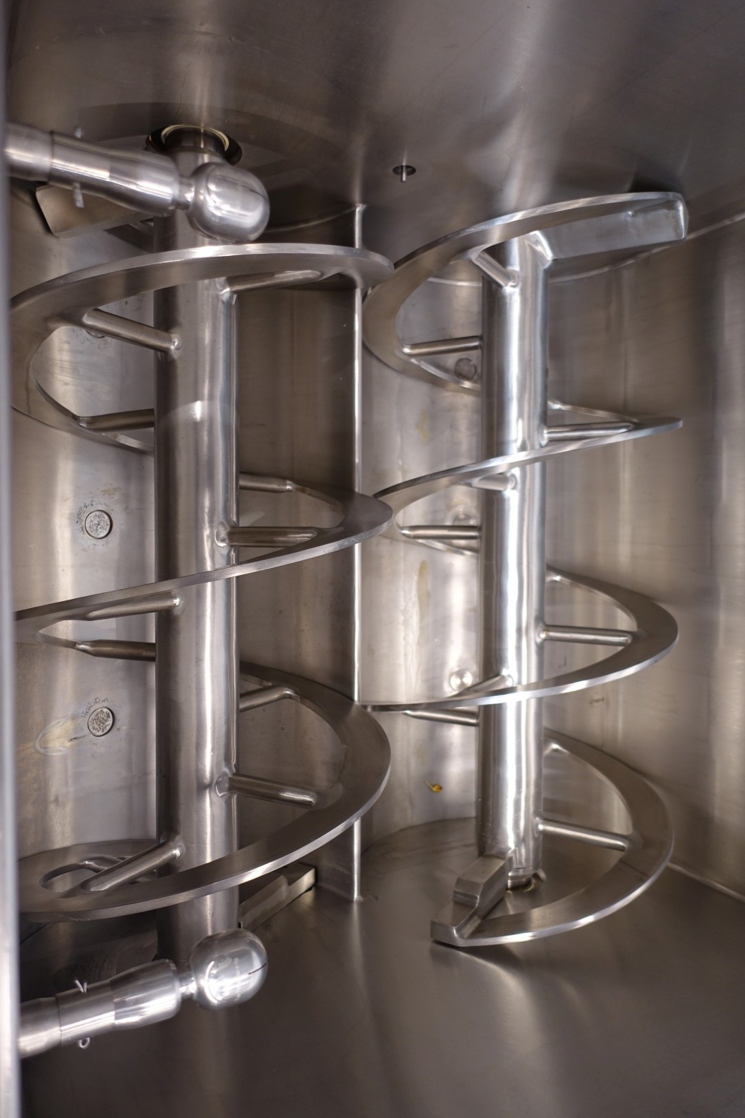 Vacuum Cooker melter, Ribbon Blender, horizontal. Double jacketed for indirect heating or cooling and Direct heating by steam injection, 6 x steam injection ports. Max pressure in jacket 2bar water or steam max 3,5 bar, CIP cleanable by 4 x spray bowls. 2 x Motor for ribbons 2x11kw motor. 1 Outlet hatche pneumatic openable. With vacuum system, Water dosing system with flowtransmitter . Closed cover, pneumatic liftable. Ingredient inlets: manual via bins. integrated liquid ring vacuum pump. Separate elevator, lifting bin arm for standard 200ltr trolleys (KS type 602, 1,1kW - max 250 kg). Control panel with PLC (Siemens S7-300 controls), Freq converters. Display operation panel. Dimensions product room: 100x100x82 (lxwxh) cm. Documentation available. Total dimensions 210x190x323 cm.