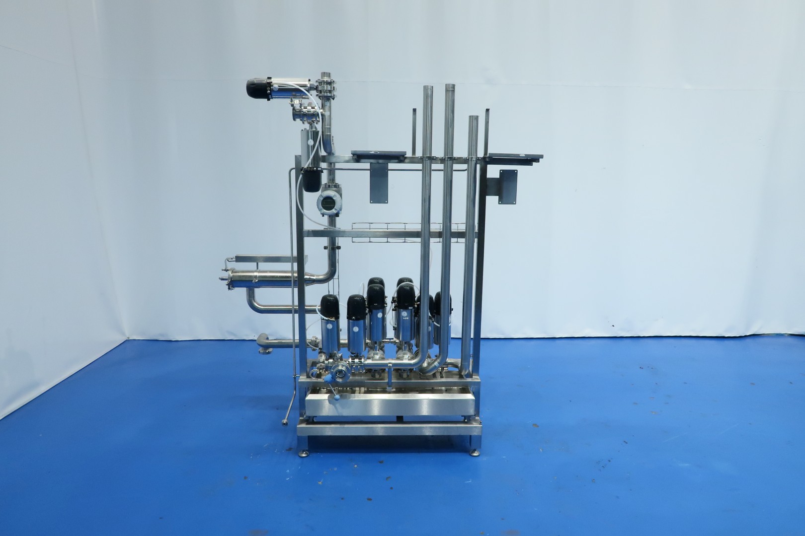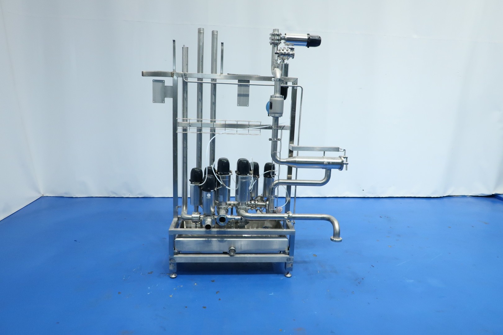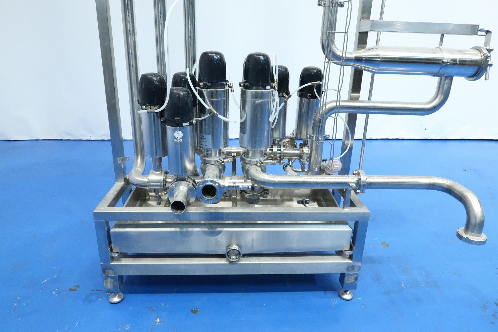 Valve manifold With: 2x 4-Way Mixproof valves with seat lift and smart control-heads, 9x 2-Way valve pneumatic activated (of wich 4 with leakage pipes), 2 mixproof butterfly valves, 1 x manual butterfly valve, 2x pressure sensor and 1 x E&H magnetic flowtransmitter (Promag H and Promag 100). Built on SS frame with 4x adjustable feet and removable drip tray. Connections: 11x DN50 Kieselmann valves - 1x DN50 Din and 1 x DN40 Din. Previously used in a set with pumps and processing tanks for producing quark. Dimensions: 180x90x207 (lxwxh) cm - weight: 223 kg.