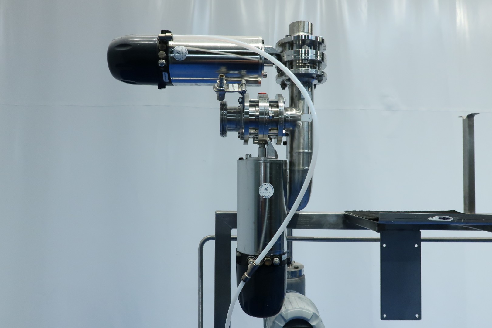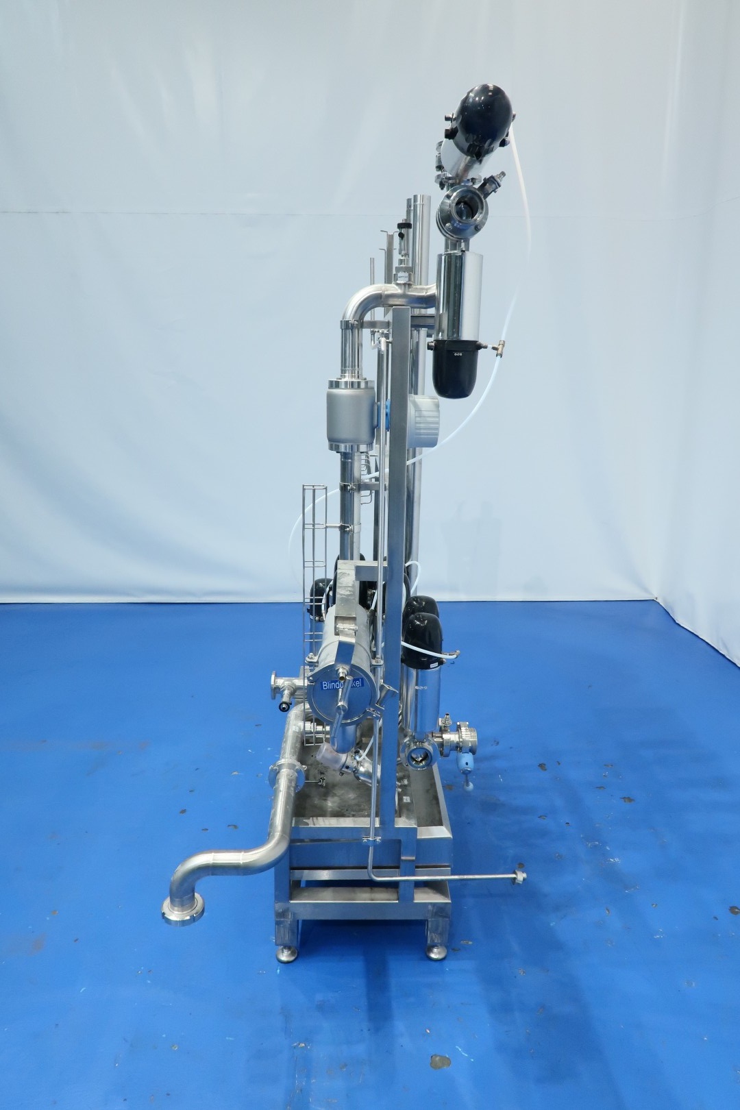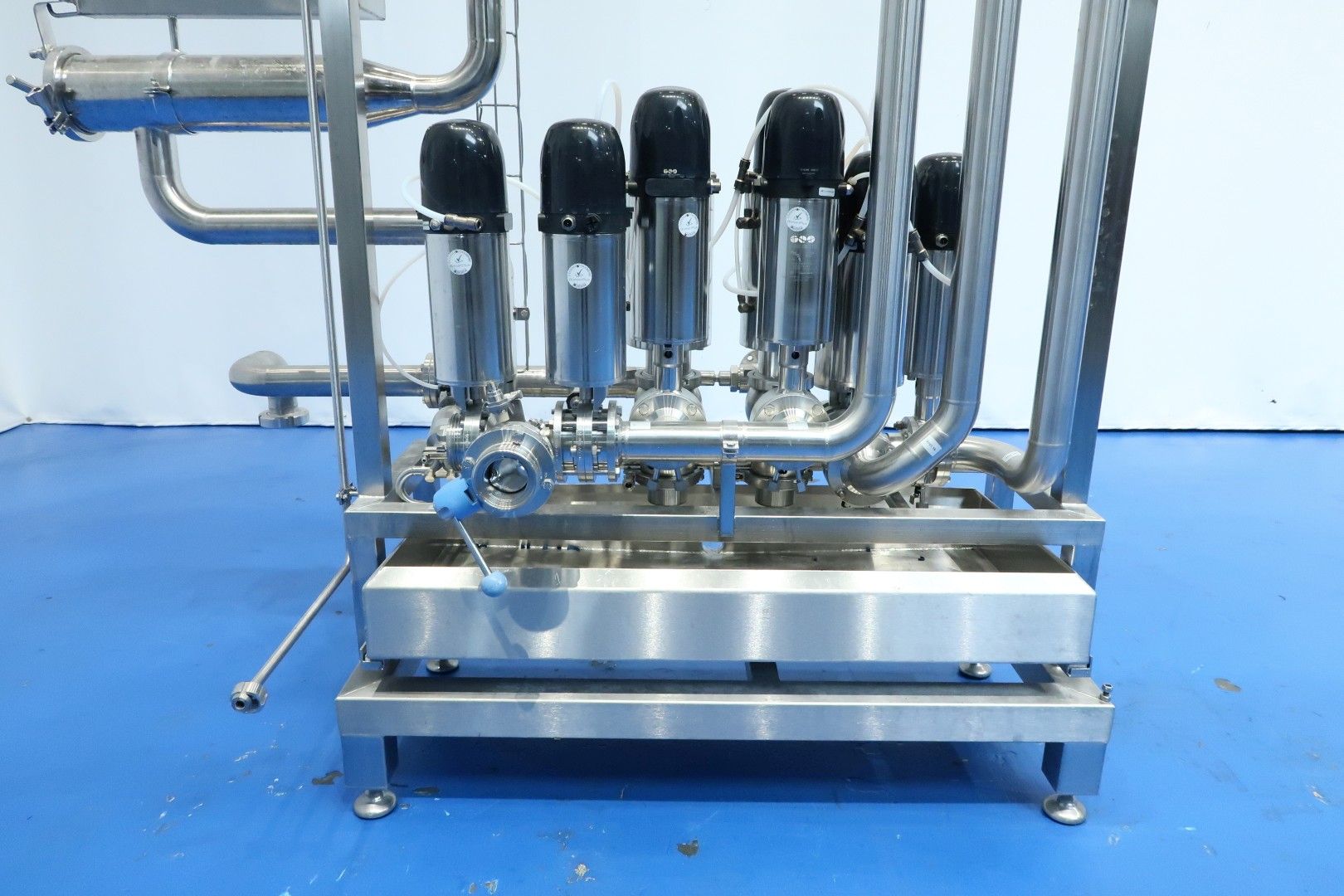 Valve manifold With: 2x 4-Way Mixproof valves with seat lift and smart control-heads, 9x 2-Way valve pneumatic activated (of wich 4 with leakage pipes), 2 mixproof butterfly valves, 1 x manual butterfly valve, 2x pressure sensor and 1 x E&H magnetic flowtransmitter (Promag H and Promag 100). Built on SS frame with 4x adjustable feet and removable drip tray. Connections: 11x DN50 Kieselmann valves - 1x DN50 Din and 1 x DN40 Din. Previously used in a set with pumps and processing tanks for producing quark. Dimensions: 180x90x207 (lxwxh) cm - weight: 223 kg.