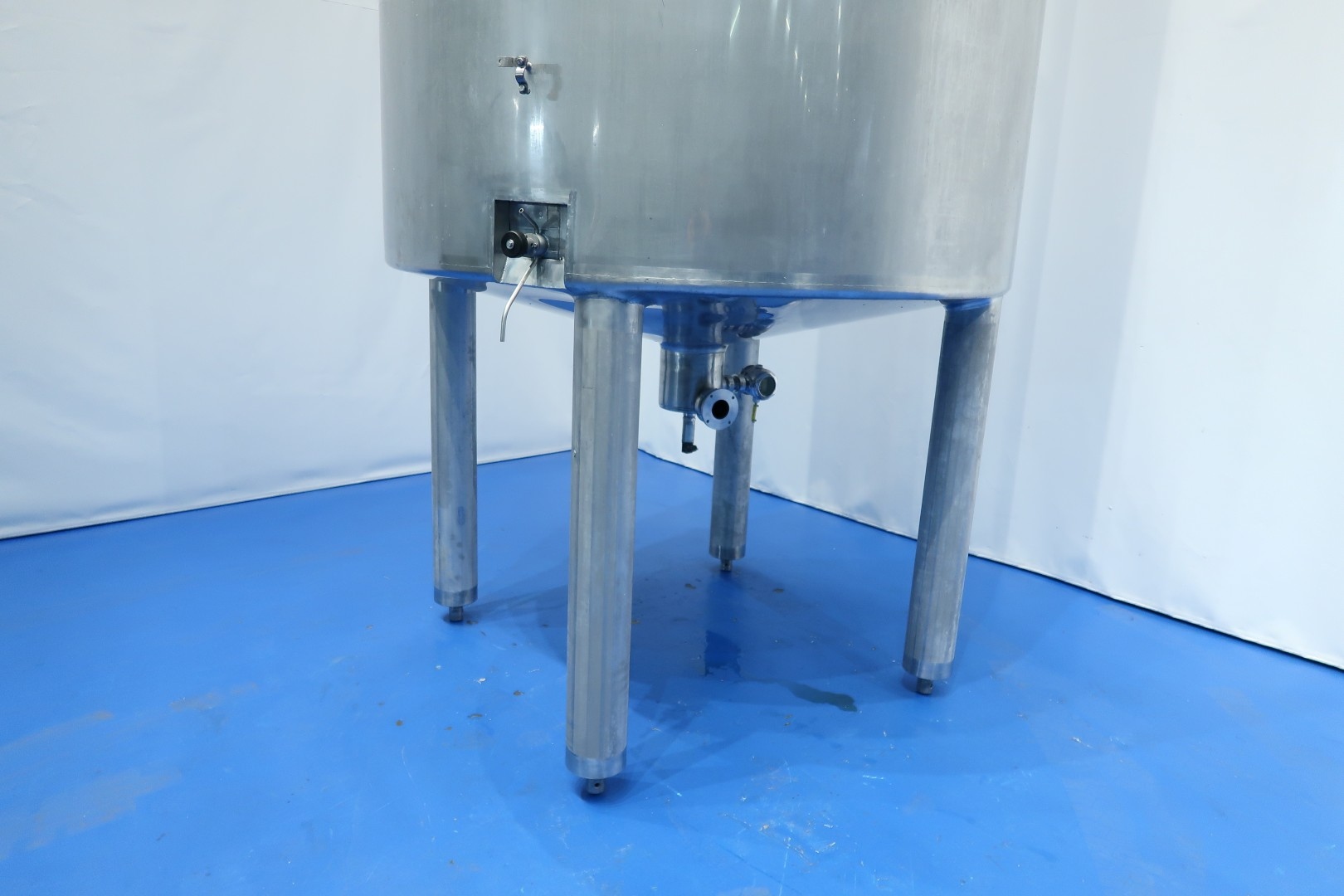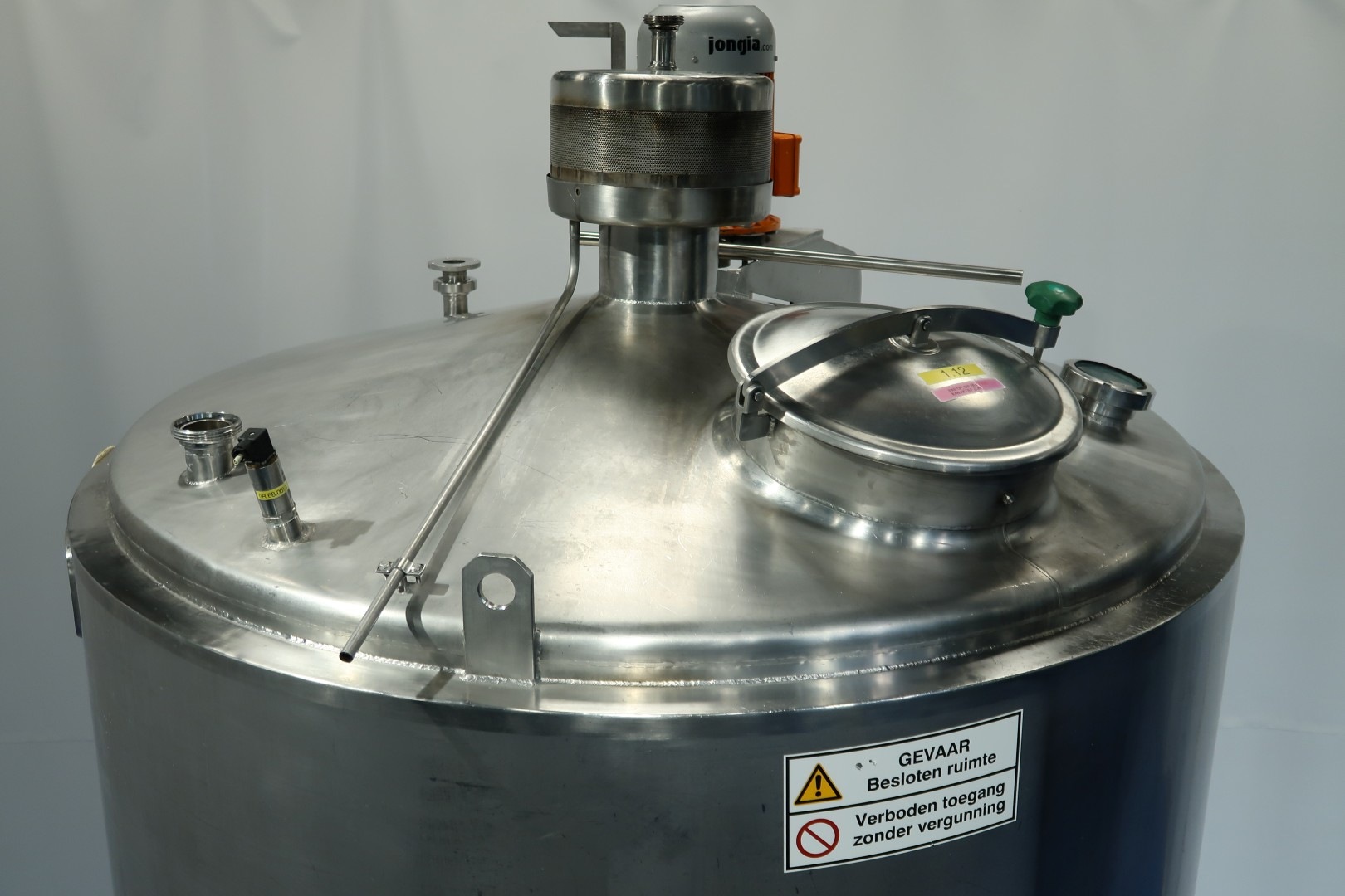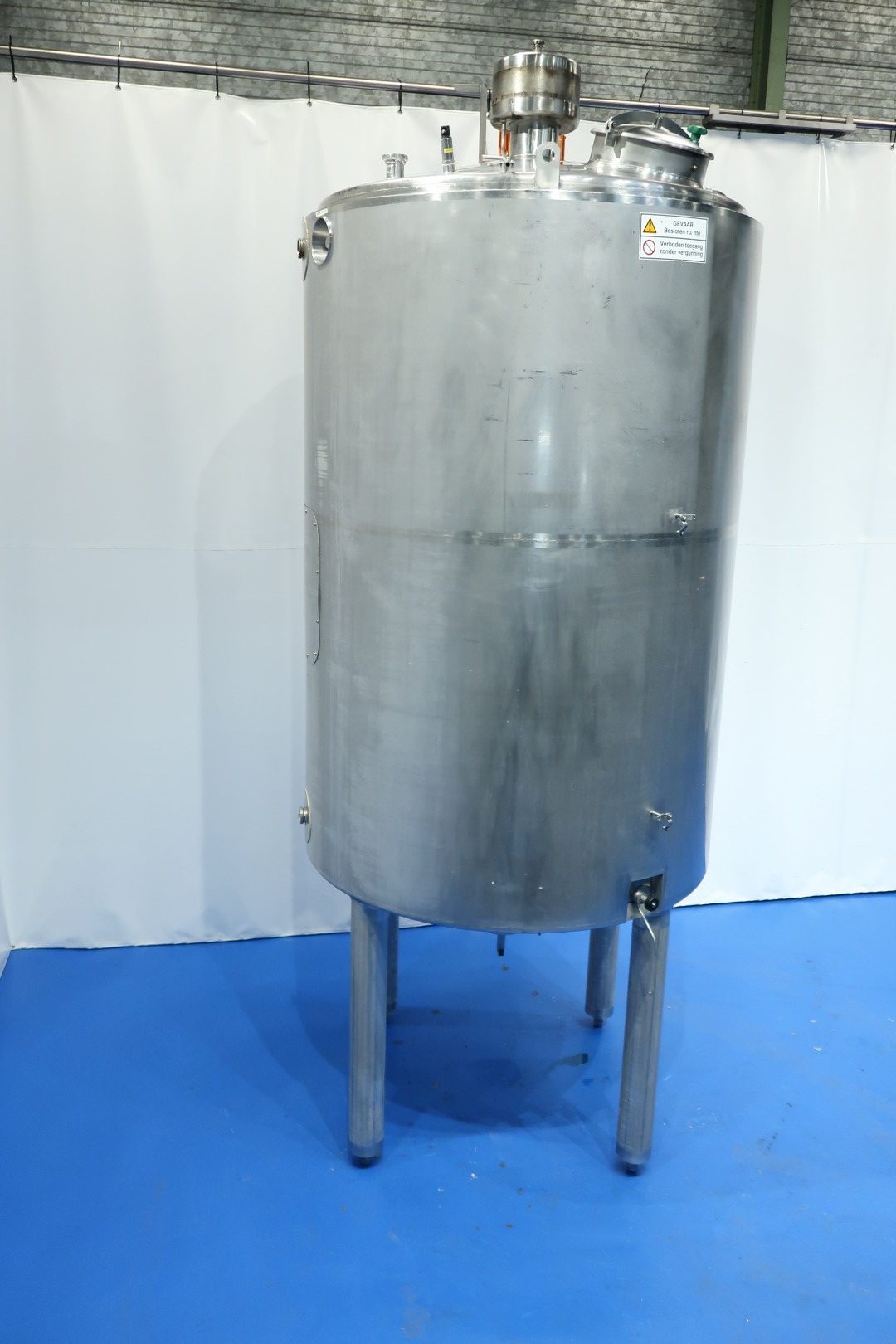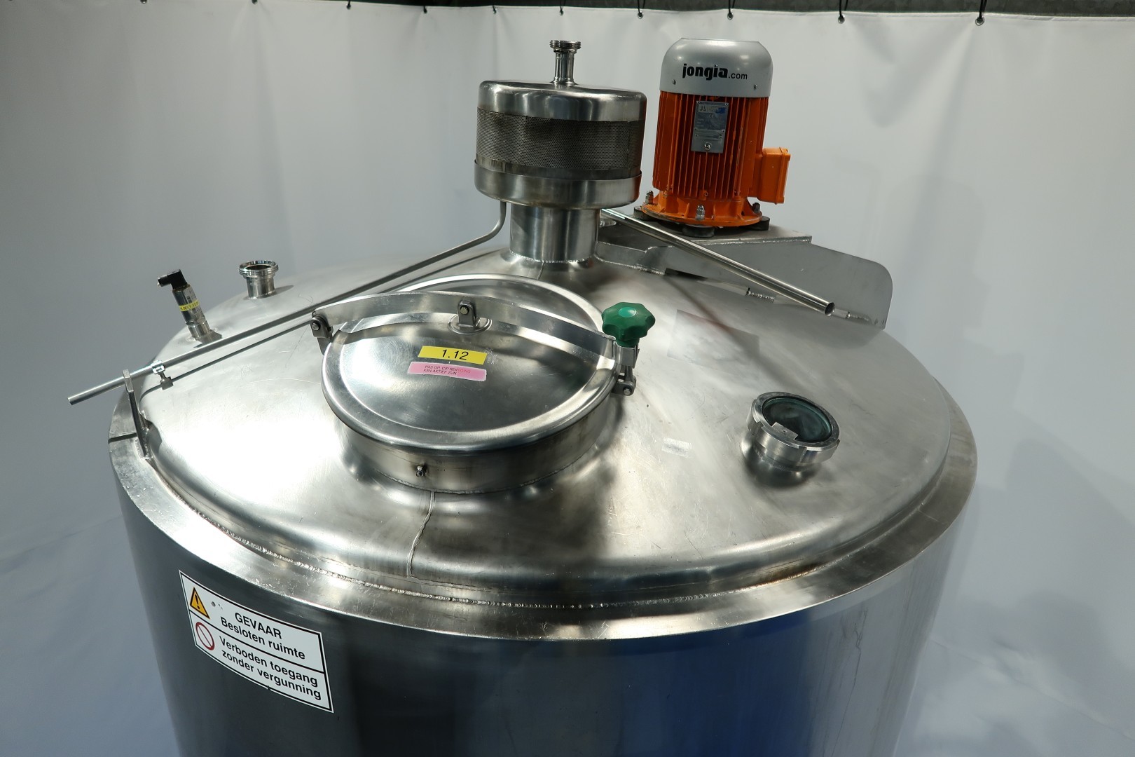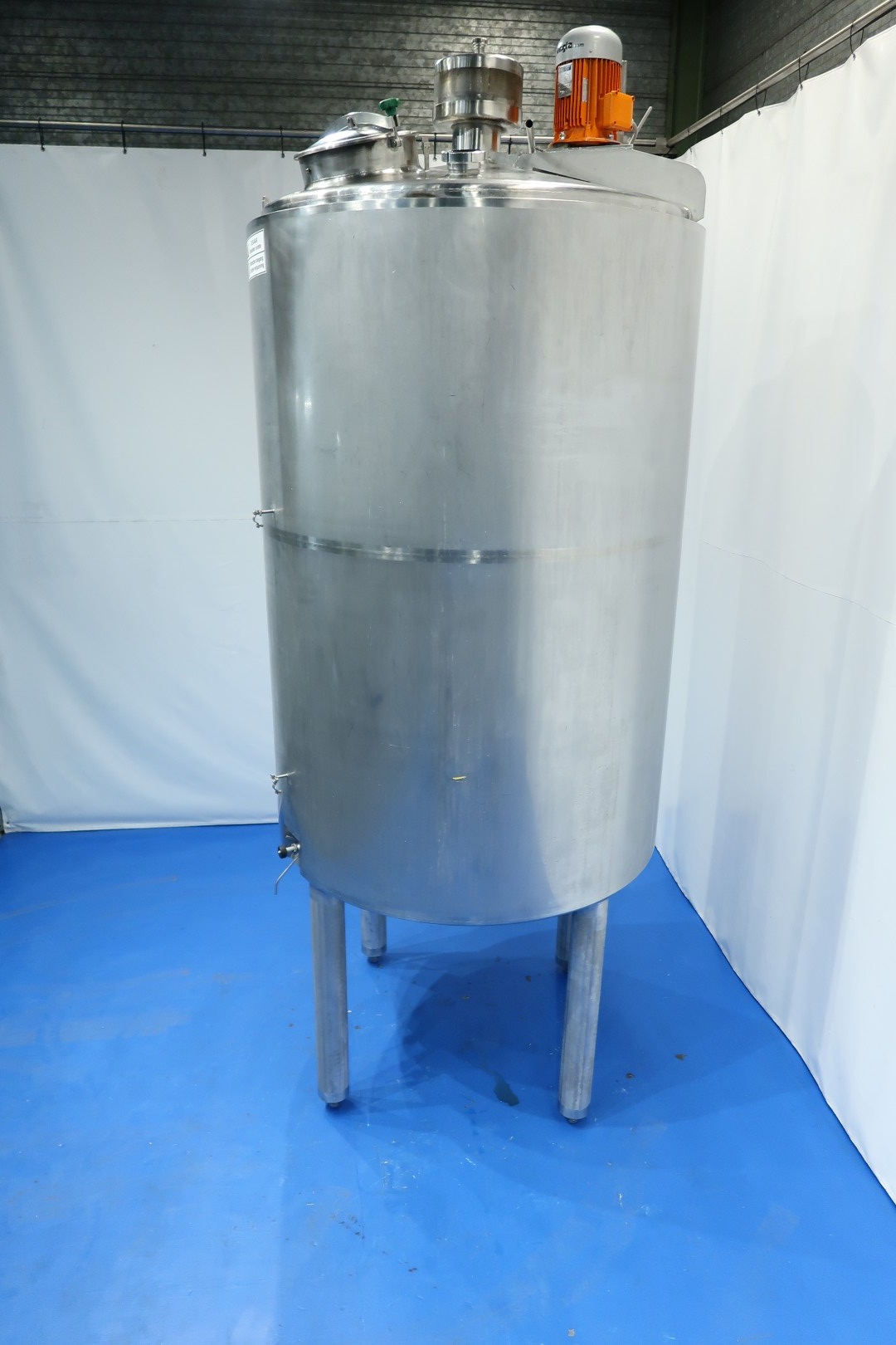 Double jacketed (and insulated) vertical mixtank. Previously used for cooling and mixing cream. Top driven Jongia JDR Propellor agitator: 0,9kW - 3,5A - n460 rpm. Insulated side and bottom. Pressure jacket: design 20 bar - test 10 bar - working 3 bar. Pressure in tank atmospherique. Tank working temperature: 0-85°C, design temperature: 0-100°C. Jacket working temperature: 0-85°C, design temperature: 0-150°C. Cooling surface: 15 m2. Product Outlet 2,5" Din, outlet height: 95cm. With cleanable sample valve. In bottom 1 x temperature sensor, 1 x level sensor and 1 x pressure sensor. In top 1 x level sensor, breather, 1 cip spray bowl, manhole in top round diameter 43 cm. 4 Adjustable feet, innner dimensions of tank diameter 180cm - cylindrical height 265 cm. Documentation including drawings available. Outer dimensions: 192x192x470 (lxwxh) cm - weight: 1.160 kg.