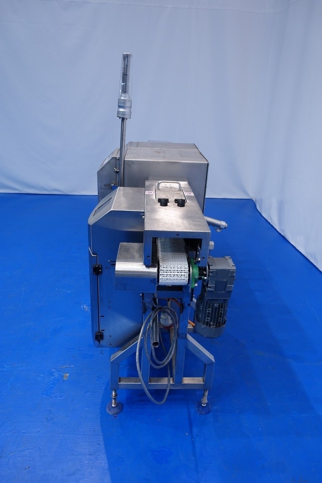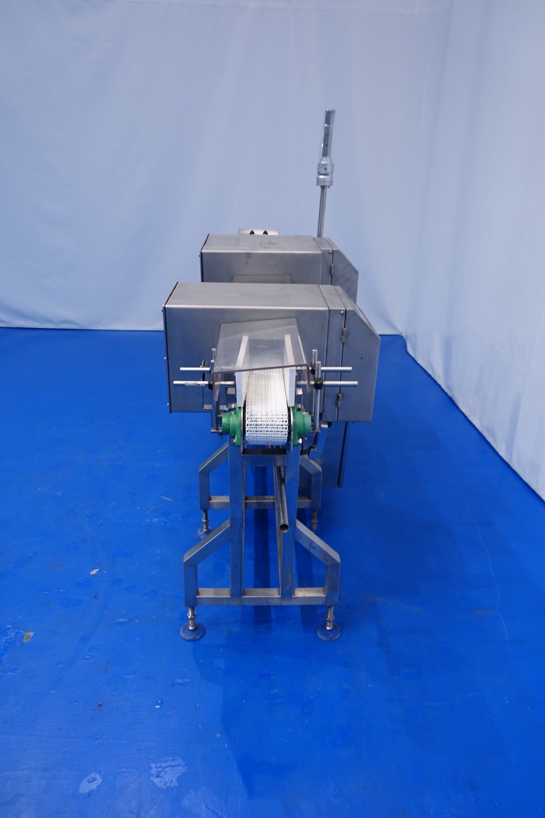 Metal detector, through put, size of product maximum: 15 x 8 (wxh) cm (aperture size 15x12,3 cm). Including conveyor; length 210 cm - width 10 cm, ejecting system by pneumatic arm with collecting tray. Total dimensions: 217x65x166 (lxwxh) cm - weight: 288 kg.