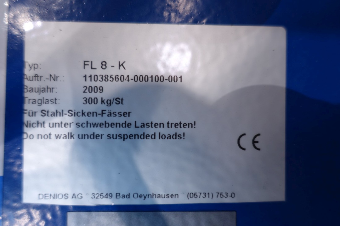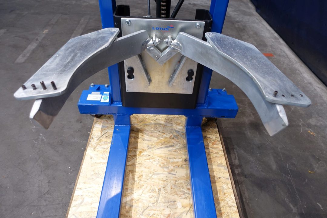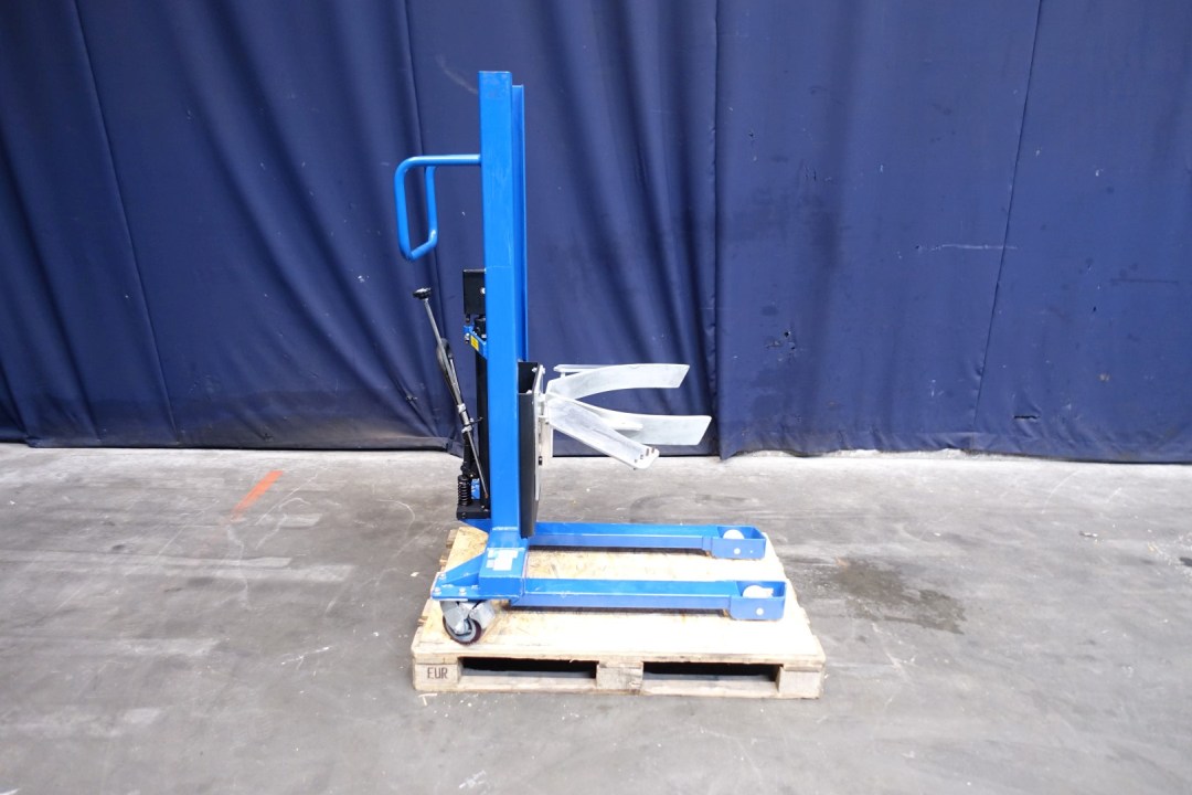 Lotus FL8-K barrel/drum lifter. Capacity up to 300 kg. On mobile wheels, manual use by pumpsystem. Range ca.: 46 - 59 cm. Total outside dimensions: 108x83x155 (lxwxh) cm,. Weight: 152 kg.