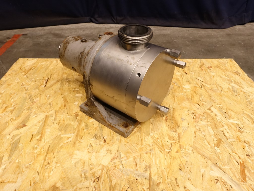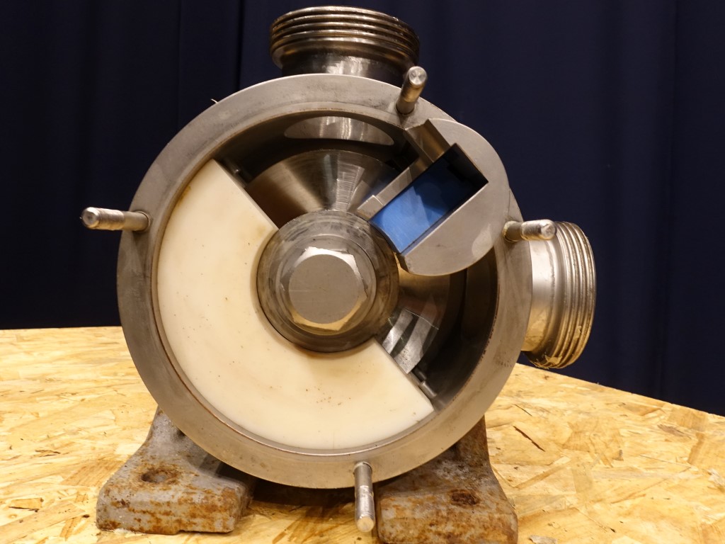 Sine shaped pump. Impellor diameter 160 mm. Displacement per revolution: 0,45 ltr. Maximum particle size: 19 mm. Maximum speed: 600 rpm. Connections: DN100 / DN100, SMS.