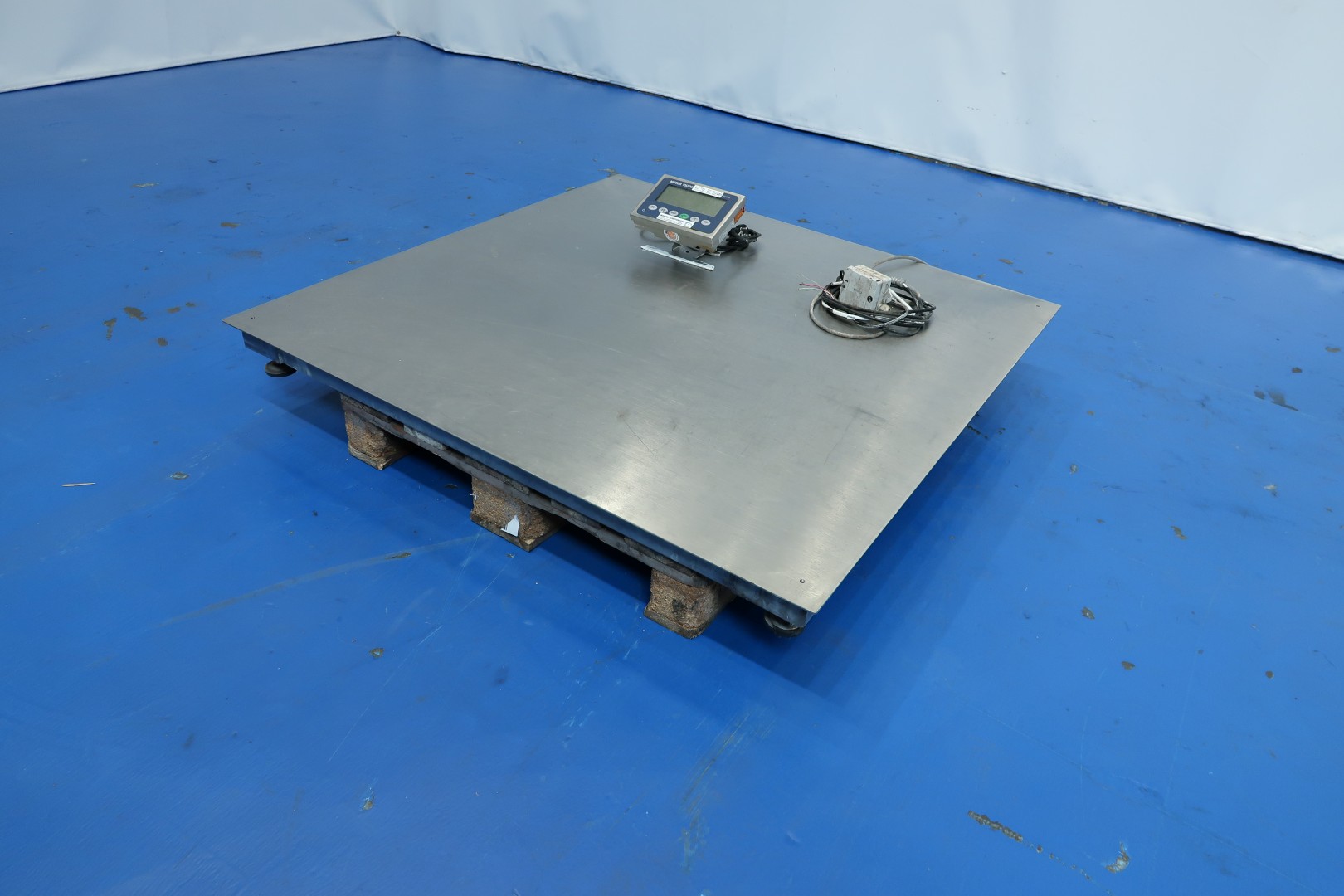 Floor weighing scale, stainless steel pallet platform to be mounted in the floor with display. Dimensions of weighing platform: 125x125 (lxw) cm. Thickness 10 cm, previously mounted in factory floor. Weight: 120 kg.