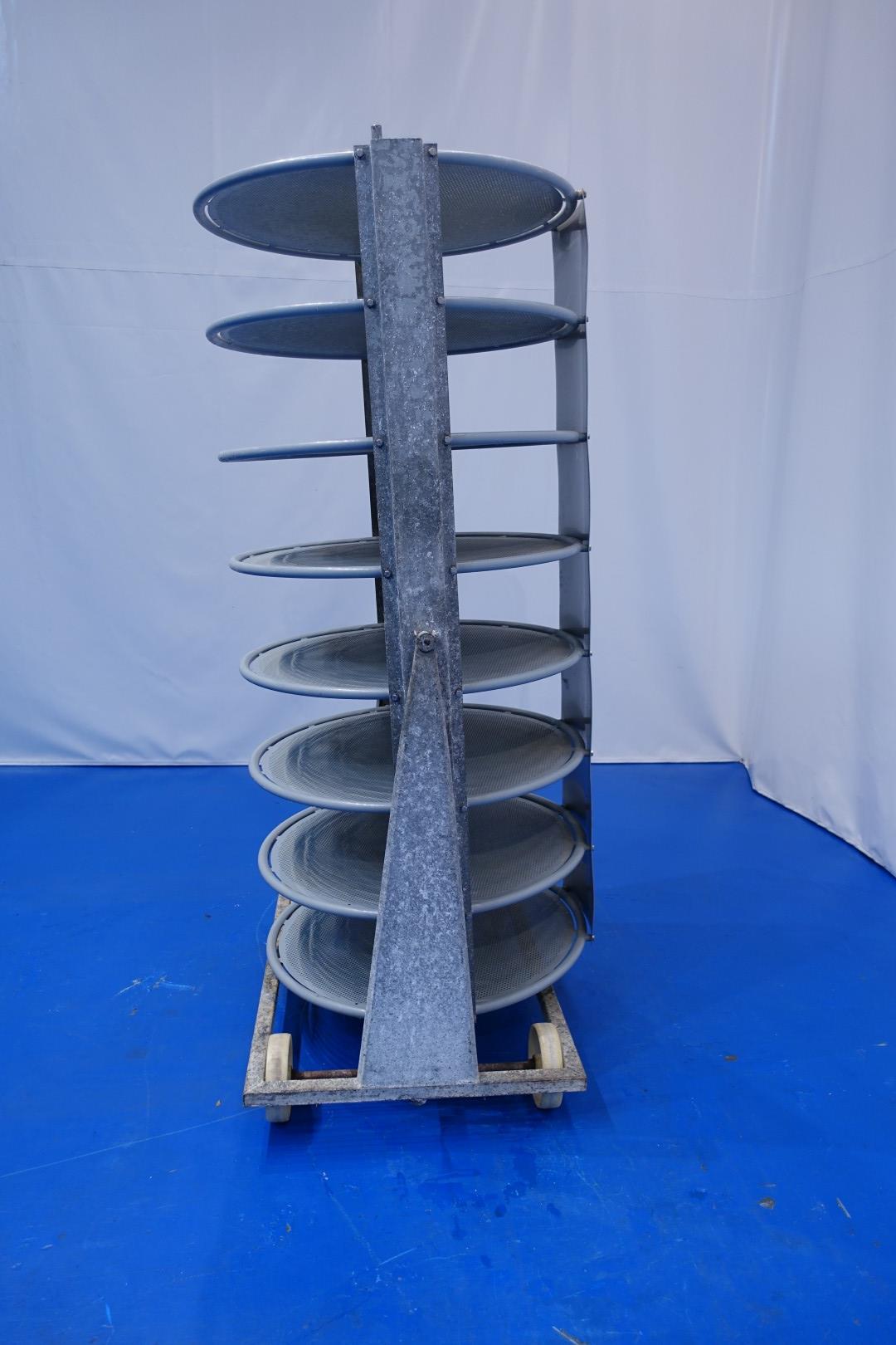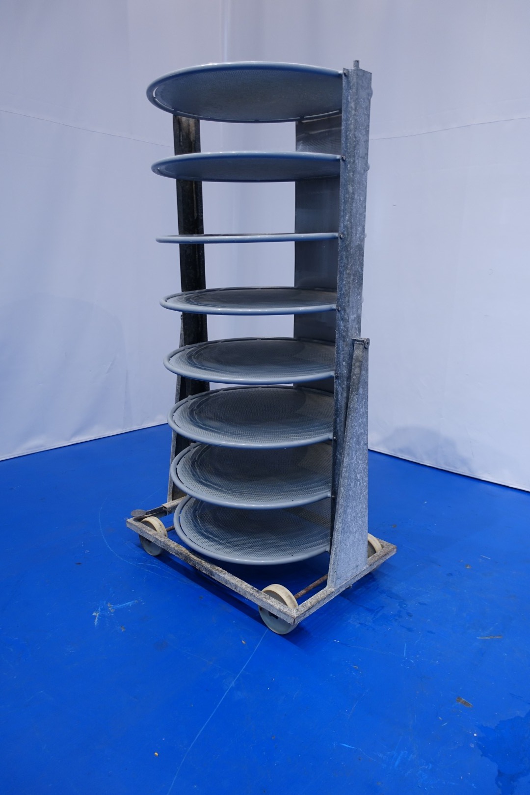 Cheese storage trolley for the maturing room, but specially for heavy round cheeses (up to 90kg round 75- 85cm), on mobile steel frame (round), Turnable. Used for Emmertaler cheeses. 7 cheese per rack placed inside. Each plate with perforated holes. Space between layers 25-26 cm. In total 4 complete sets. Dimensions: 115x80x218 (lxwxh) cm - weight: 115 kg per piece.
