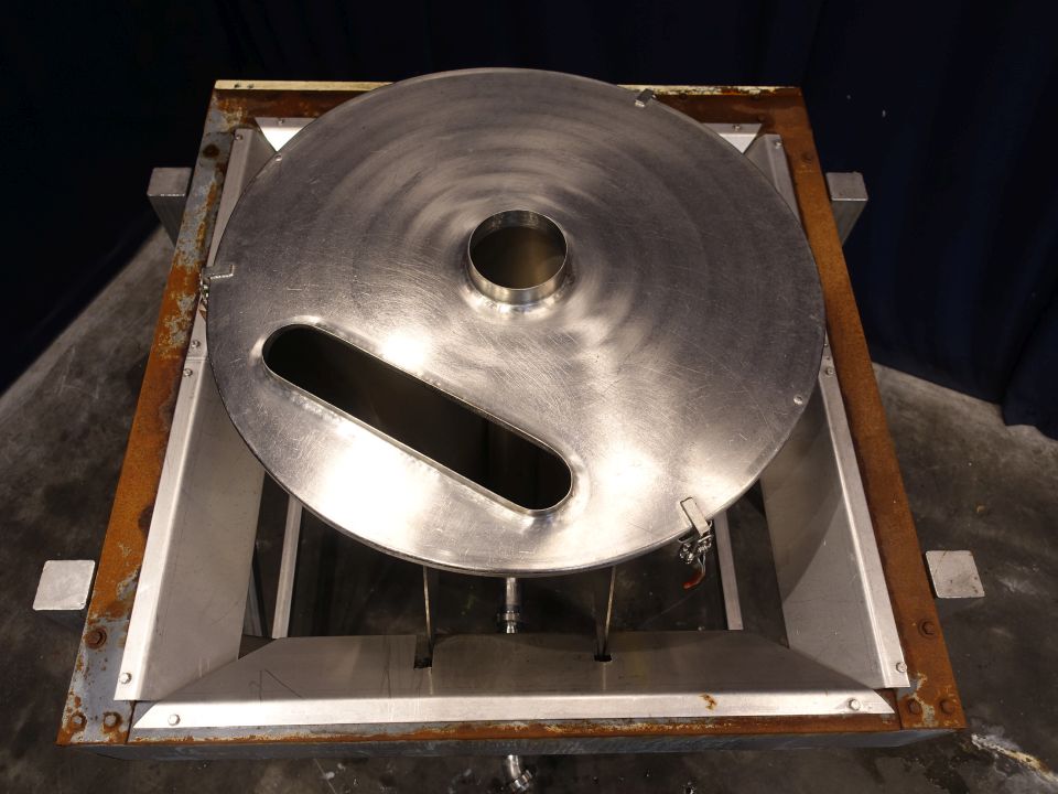 Hopper with open top. Complete conical, DN65, DIN, outlet height: 36 cm. 4 Adjustable feet. Inside dimensions of hopper: diameter 85 cm and height 120 cm. Hopper is hanging in a steel frame. Total dimensions: 150 x 150 x 200 cm.