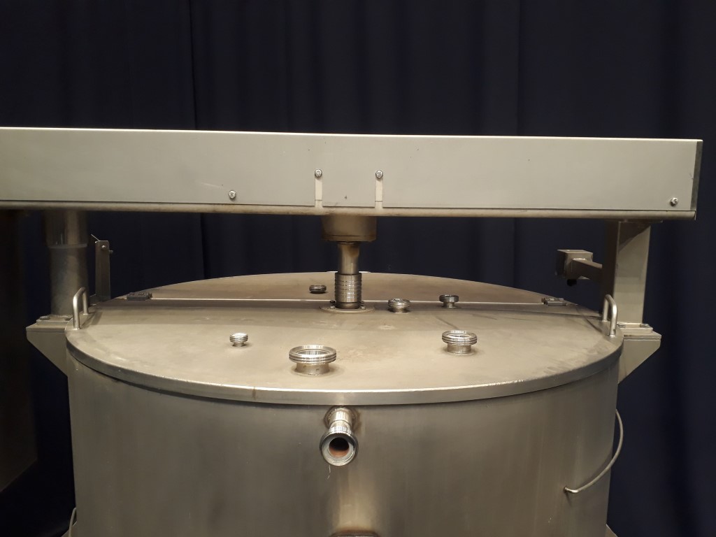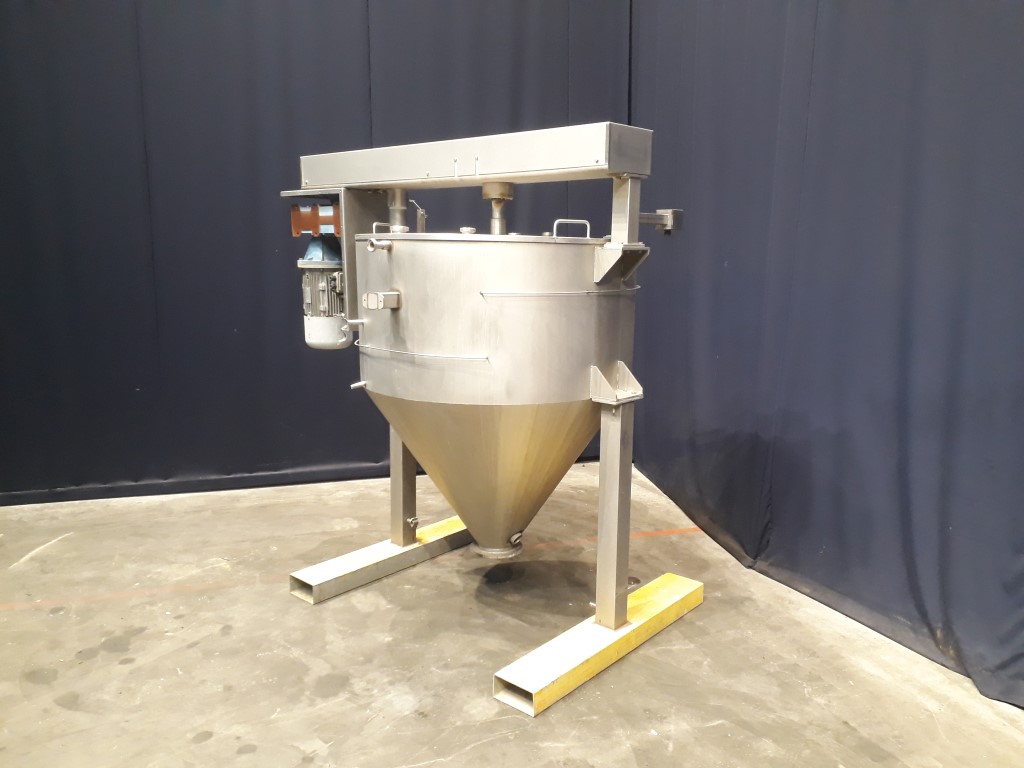 Conical hopper with top driven scraper agitator. Motor: ± 5 kW - i: 31,5 - n2: ± 44 rpm Double jacketed side and bottom. Pressure in jacket: unknown. Pressure in tank atmospherique. Conical botom. bottom flange with bearing and outlet missing. 2'' connections on the side, height: 30 cm. 2 CIP spray bowls. Half open top with cover. Hopper inside a stainless steel frame with 2 legs and inserts for easy movement with a forklift. Inside dimensions of hopper: Ø 120 cm and height 200 cm. Total dimensions: 230 x 160 x 220 cm.