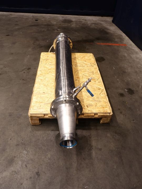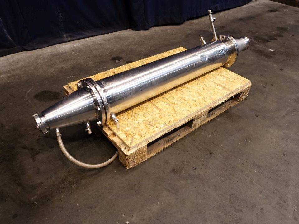 Resting tube for margarine. Double jacketed. Diameter 170 mm and length 1200 mm. Including sieve plate. Connections: DN65/DN100, DIN. Total dimensions: 190 x 30 x 30 cm.