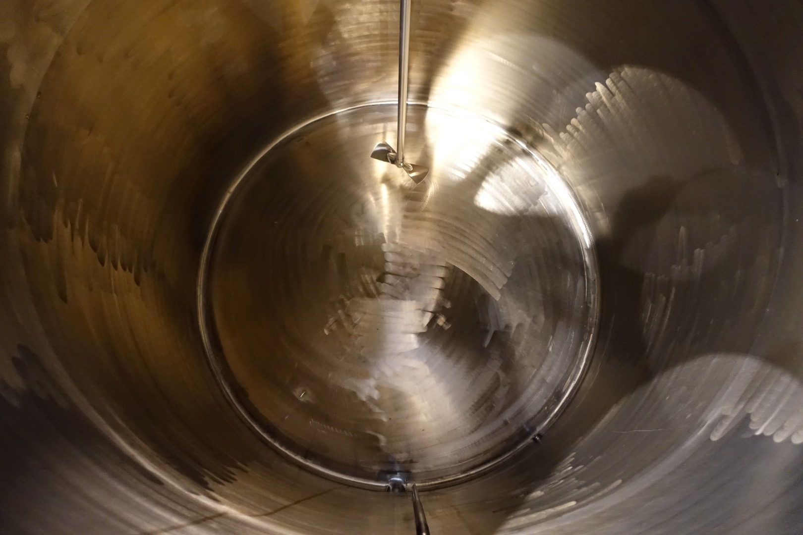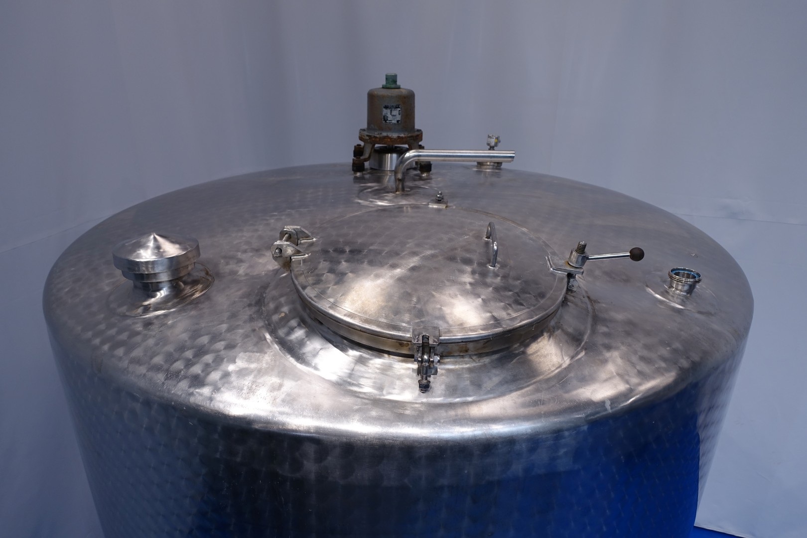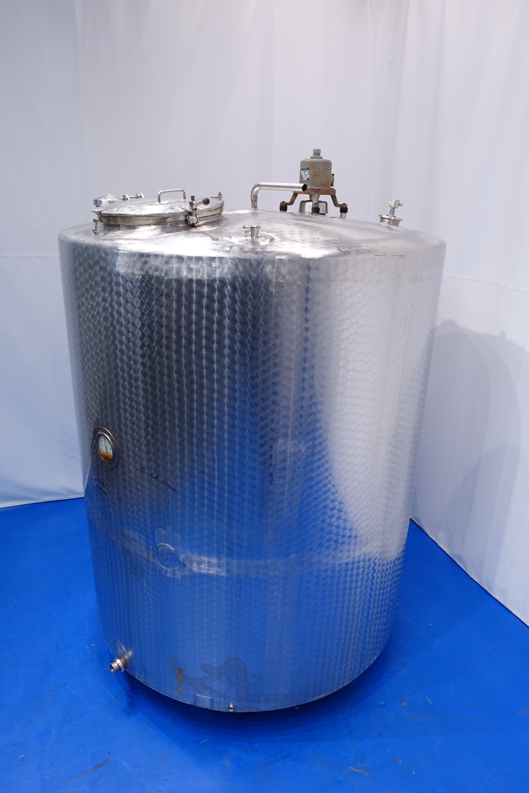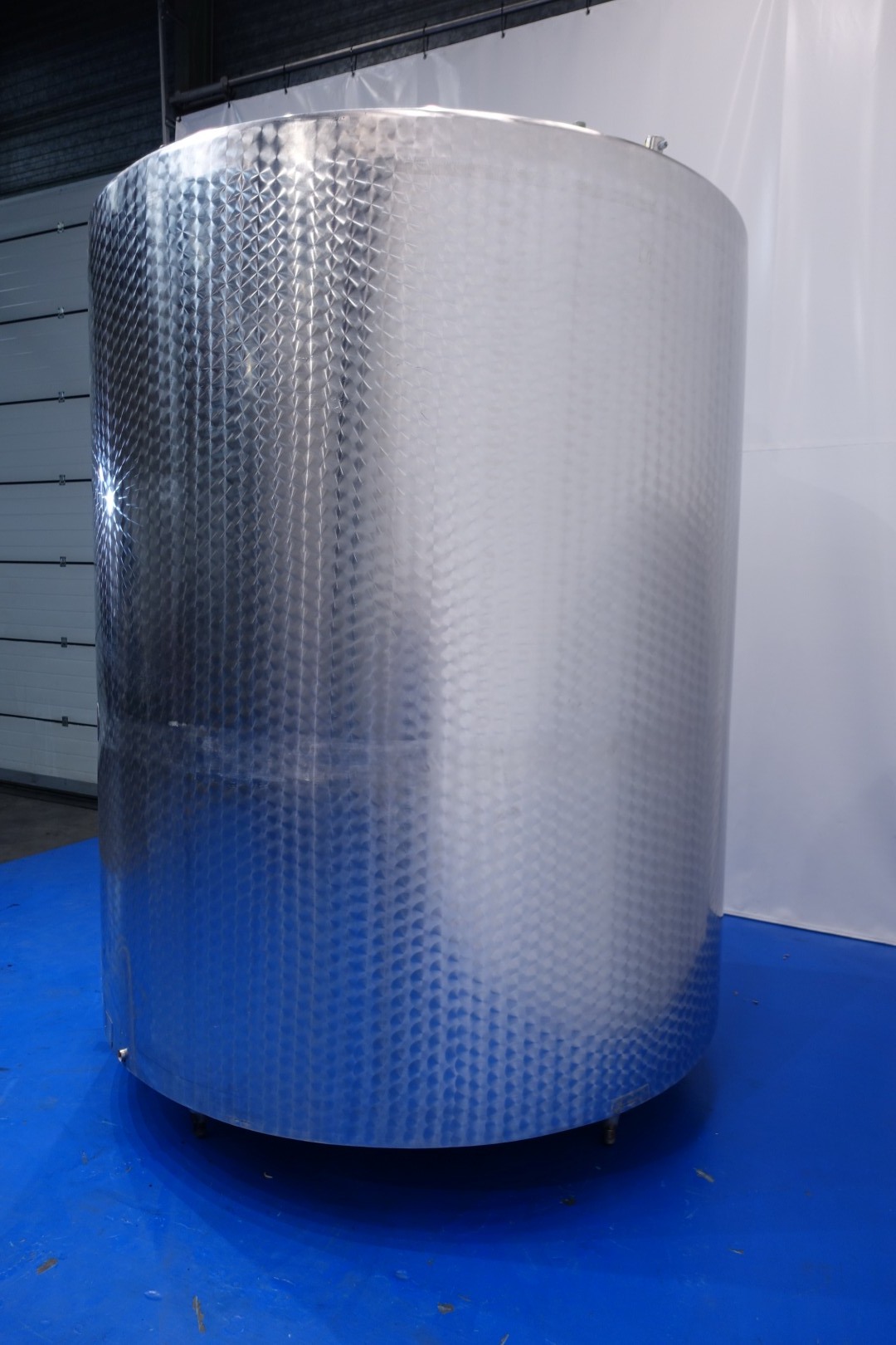 Verrtical, insulated storage tank with agitator. Nominal volume: 8.000 liter. Top driven propellor agitator. Motor: ca. 0,25 kW. Insulated side and bottom. Product outlet 2" Din. Outlet height: 29 cm. 1 x Level sensor in top and 1 x connection for level sensor low side of the tank. Breather. 1 CIP spray bowl. Manhole in top, round Ø 59 cm. 4 Adjustable feet. Inside dimensions of tank: Ø 220 cm and lenght 240 cm. Total dimensions: 220x220x330 (lxwxh) cm - weight: 1.410 kg.