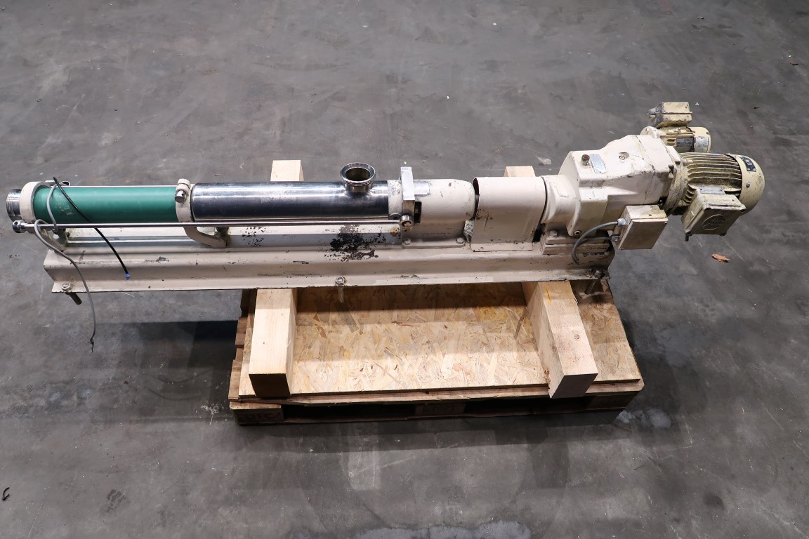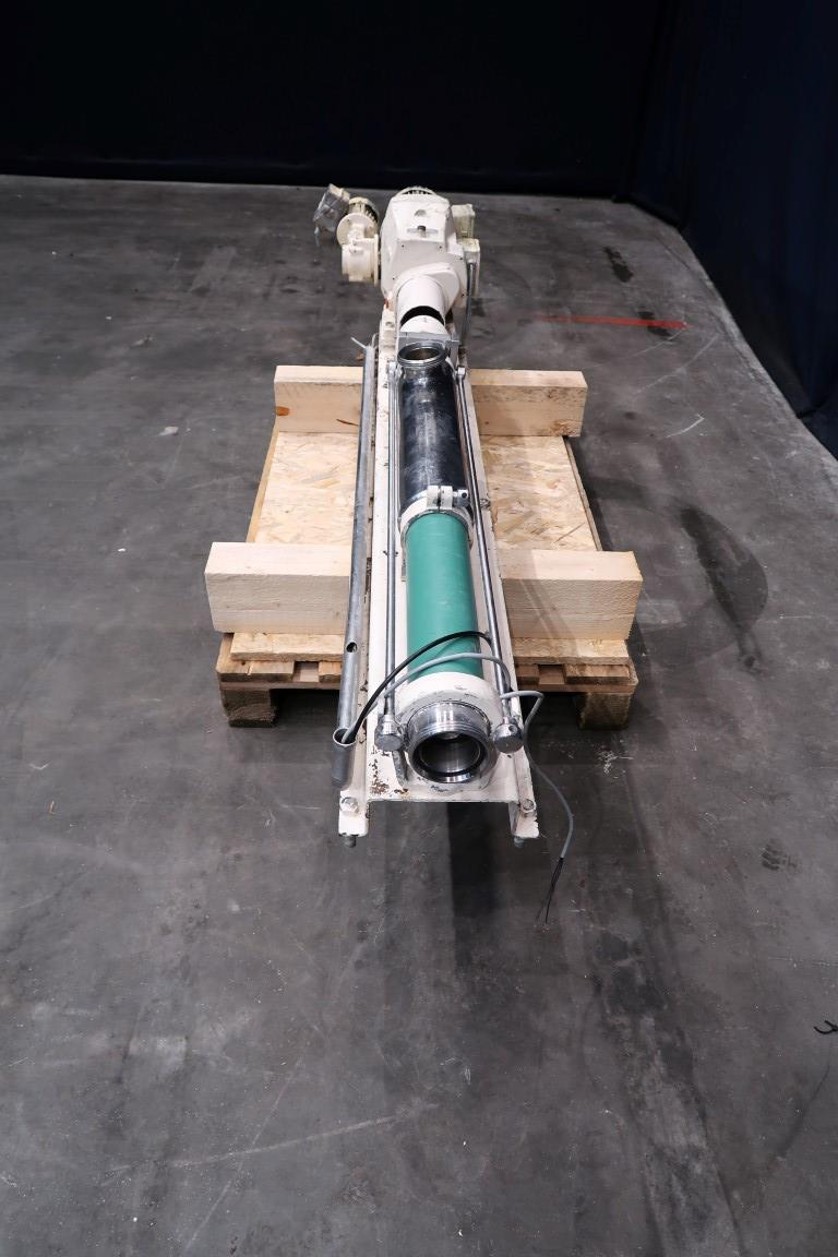 Screw / mono pump. Stator diameter 80 mm. Stator length 85 cm. Current motor: 2,2 kW - 8,3 A - n1 2820 rpm - n2 = 360 rpm. Steel frame mounted. Connections: DN80/DN65.