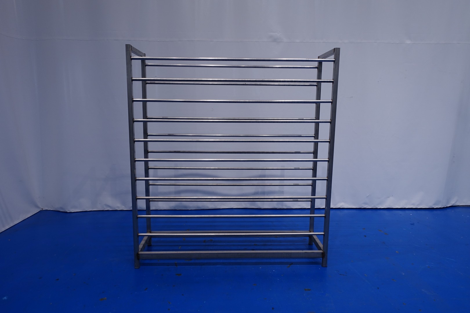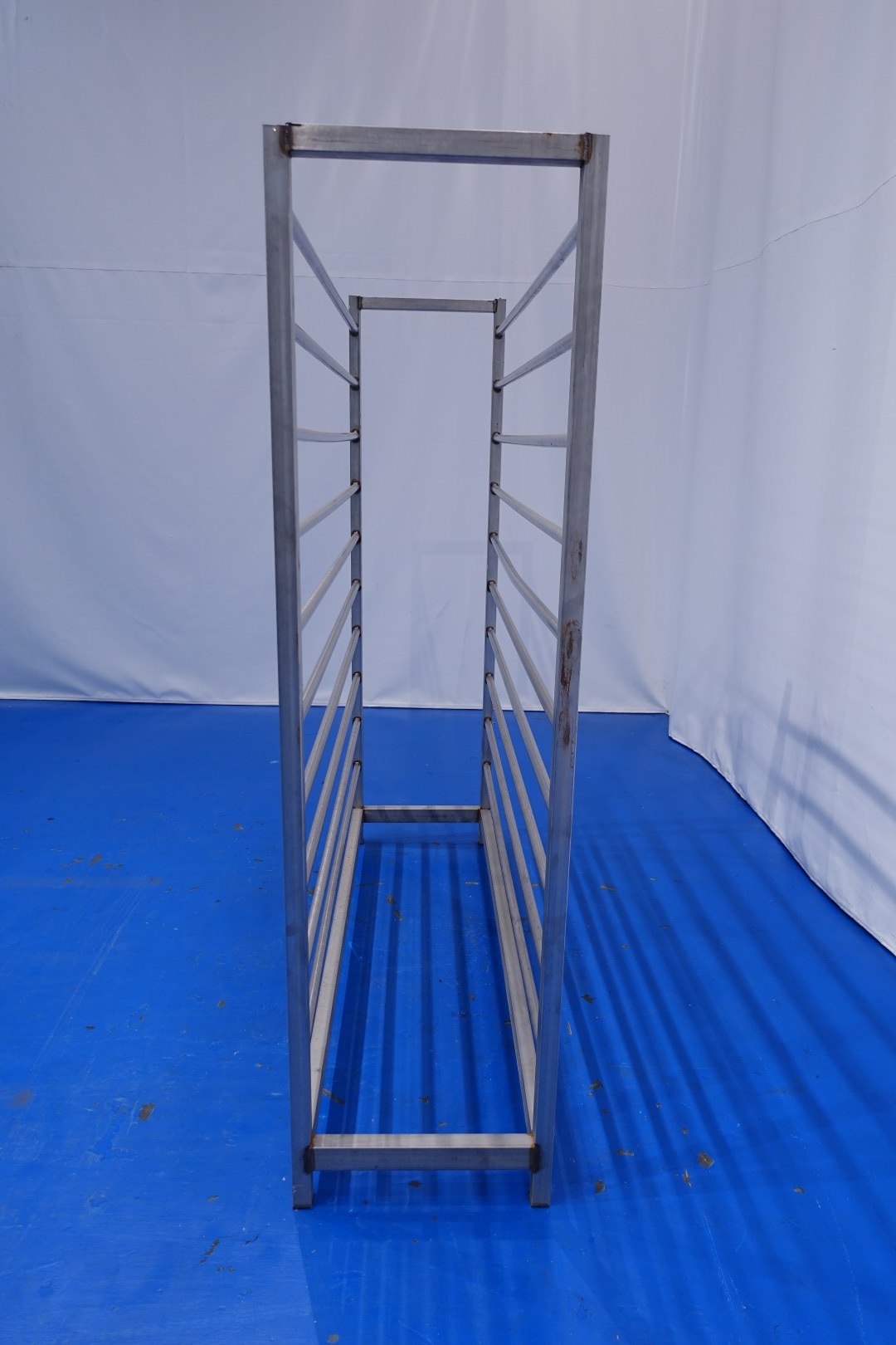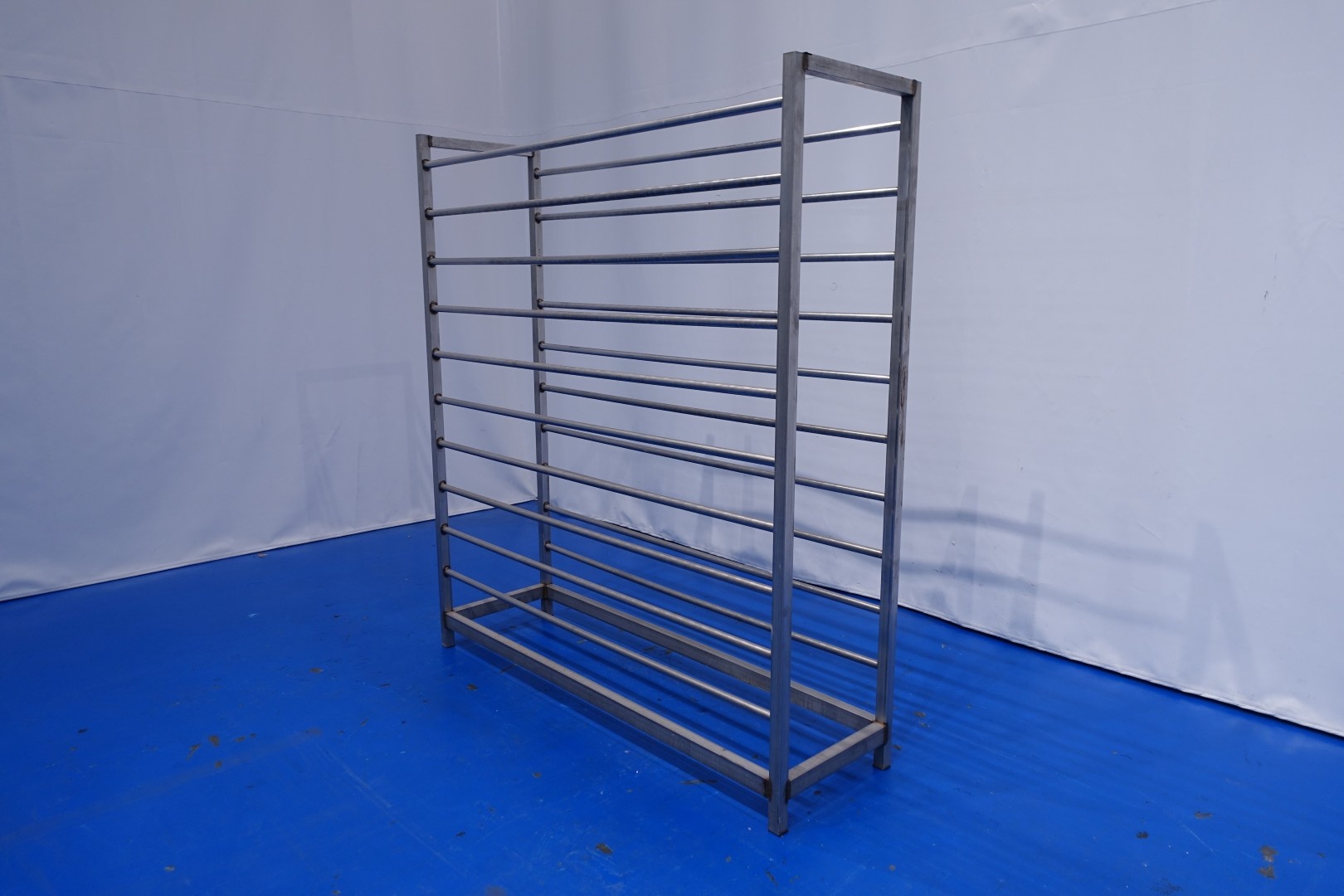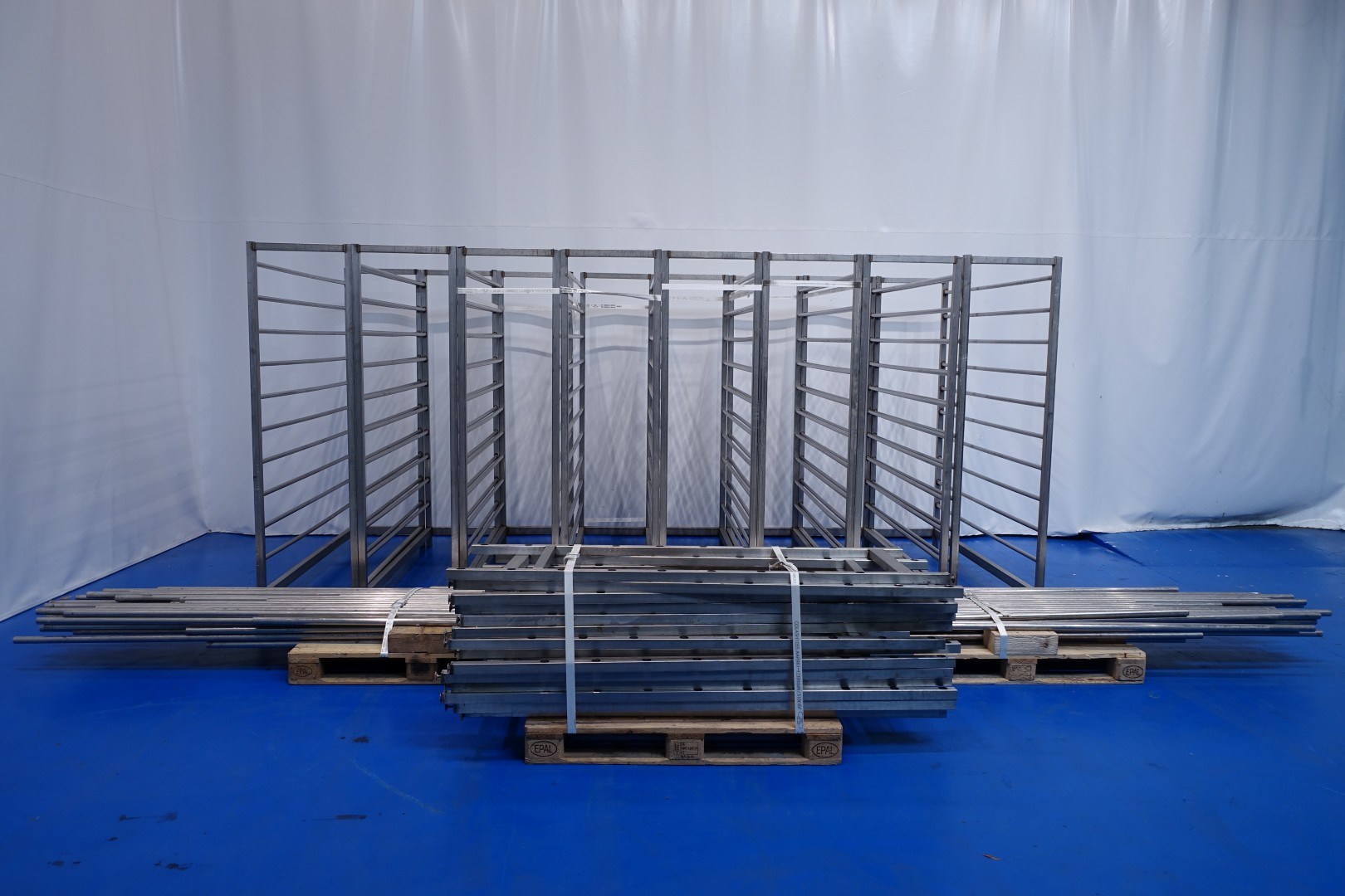 Cheese storage racking system, Holding system to put wooden or plastic shelves in. For cheese maturing room of apprrox 2200 shelves of 105x31,5 cm. Amount of layers per rack: 10, height between layers 15 cm, current length between uprights ca. 186 cm, depth: 47-55 cm. Consisting out of: 8 complete racks and 14 uprights. Weight per rack ca. 90 kg - total weight of all equipment: 1.862 kg. Other cheese storage rack system under STN15836 also available.