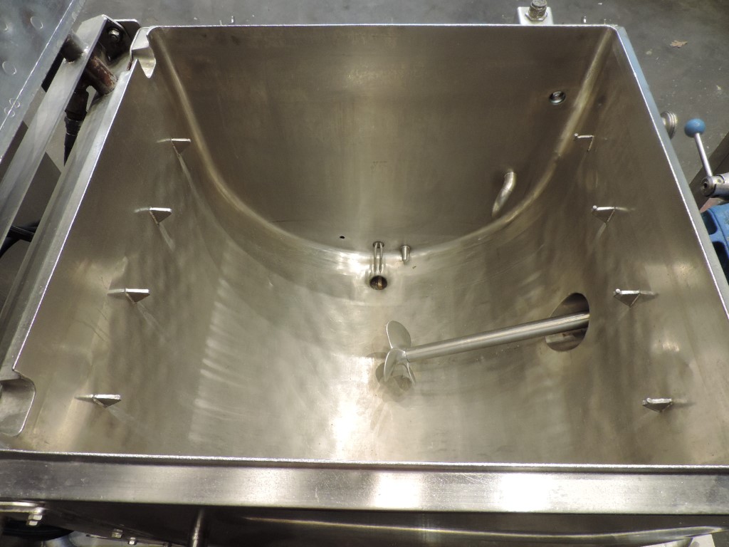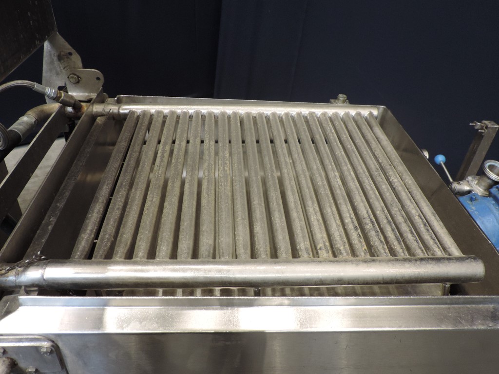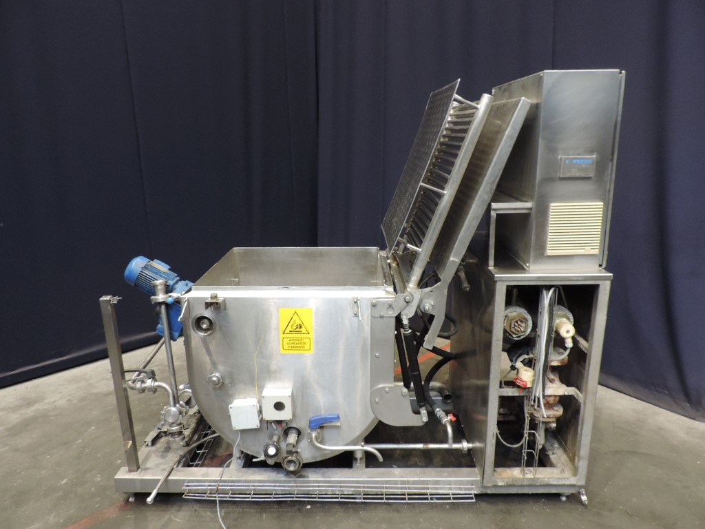 Skidmounted butter or blocks of vegetable fat melting unit including tank (double jacketed) with heated grid and top plate. The blocks are placed on the heated grid and melted. The liquid drops on a plate and afterwards in the collecting tank. The tank has a propellor agitator (motor 0,55 kW) in liquid fat (so also for vegetable fat suitable), cover, LLS and Temperature Transmitter. Electric heating system and hot water circulation pump, Control panel with Siemens S7-200 PLC, Siemens Simatic Touch screen opertor panel and Jumo registration unit. Project number: 02/01855. Total dimensions: 220 x 110 x 190 cm.