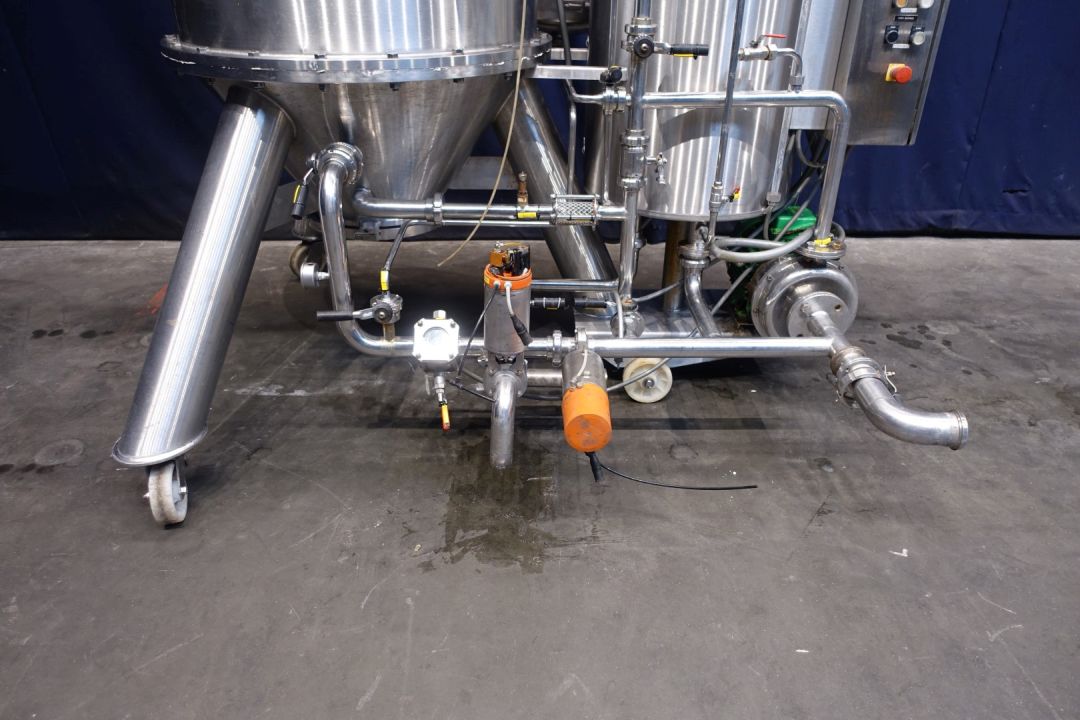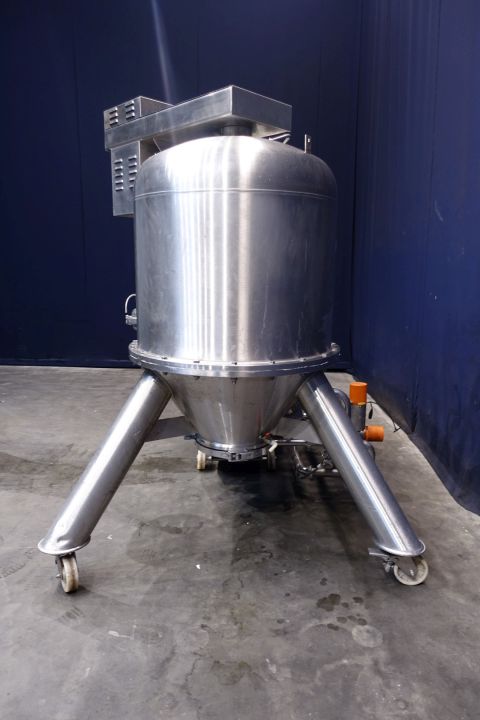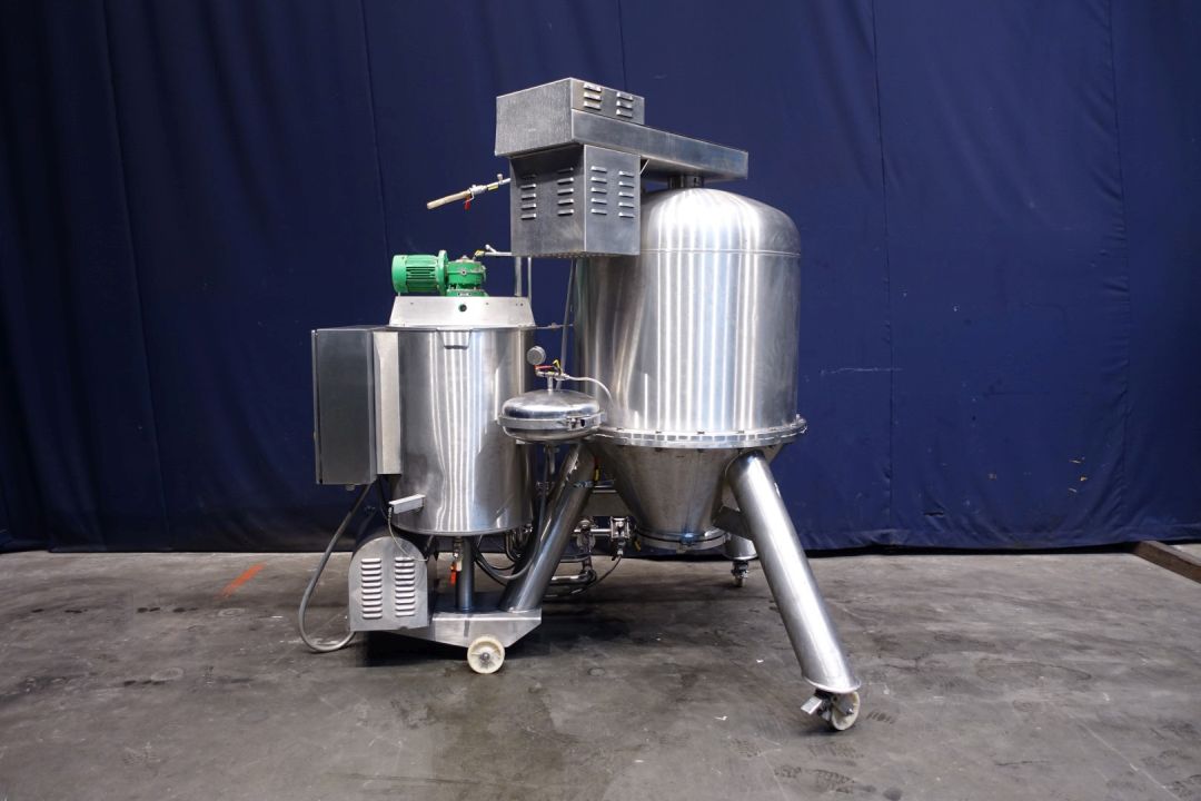 Padovan Pressure Leaf Filter, Model Green C 10 LAT. Sanitary stainless steel, 12 square meter, centrifugal dry cake discharge vertical tank, horizontal leaf pack design with a 7,5 kW top drive with hydraulic coupling for leaf pack rotation and dry cake discharge. Complete system to include: sanitary stainless steel feed pump, auxiliary plate filter for final residues, all piping and valves, precoat mix tank and controls. The filter is unitized on wheels for mobility. Total dimensions: 200 x 180 x 222 cm.