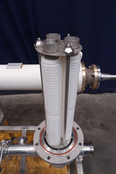 2 Air/gas filter housings in stainless on a frame each filterhous with 3 filters. With Total dimensions: 186x70x145 mm (lxwxh) - weight: 292 kg's. Cupper tubular heat exchanger to control air temperature.