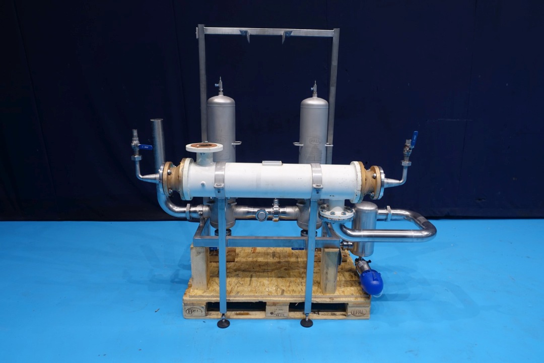Set with 2 x Pall air ss houding filter and valve. On stainless steel frame. With 2 x Pall air filter in SS housing. Each filter with 3 filters, temperature up to 140°C and 5 bar. Total dimensions: 180x73x183 (lxwxh) cm - weight: 310 kg. THE for air. Multitube, 1 compartment, Straight design, 151 tubes, 1 section, Length: 96 cm, outer diameter 180 mm. Inner diameter of tubes: 8 mm.