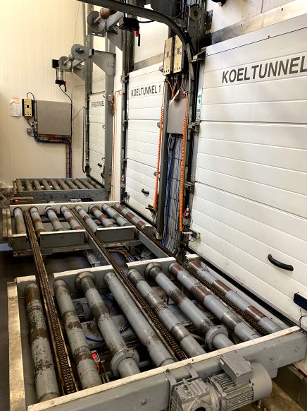 2 Cooling tunnels and 1 incubation tunnel for Euro pallets of 80cm width. Including rolling conveyors, position sensors, light, insulated panels and 30 transport motors (20x0.37/10x0.55kW). Incubation tunnel: 2 (inlet and outlet) electric heated with a temperature of 30/40°C with air circulation blowers. Heating 4 x 6 kW, 2 fans 220V. Cooling tunnel 1: Inlet door. Cooling by glycol water circulation, temperature approx: +1 to -4°C. 4 aircoolers with 5 fans each, total of 20 fans (3 kW each) for very high air circulation. Cooling tunnel 2: Inlet door, the tunnel is half open with contact to the coldstorage (the coldstorage itself not included in this offer). 3 Aircoolers with 4 blowers each, total of 12 blowers. The blower can run in 2 directions to blow air through the pallets or blow in the direction of the coldstorage. Including Independent HMI, Etop. Software of PLC and HMI: Hitachi. Components from the MCC (motor control centre). Excluding: PLC, MCC box. Electric scheme and program available. Used on set and stirred yoghurt and pudding products. Electrics, sensors, panels, and the doors are manufactured in 2009. The air coolers and fans are rebuilt in 2009.Tunnel still in dairy, can be seen running on request.