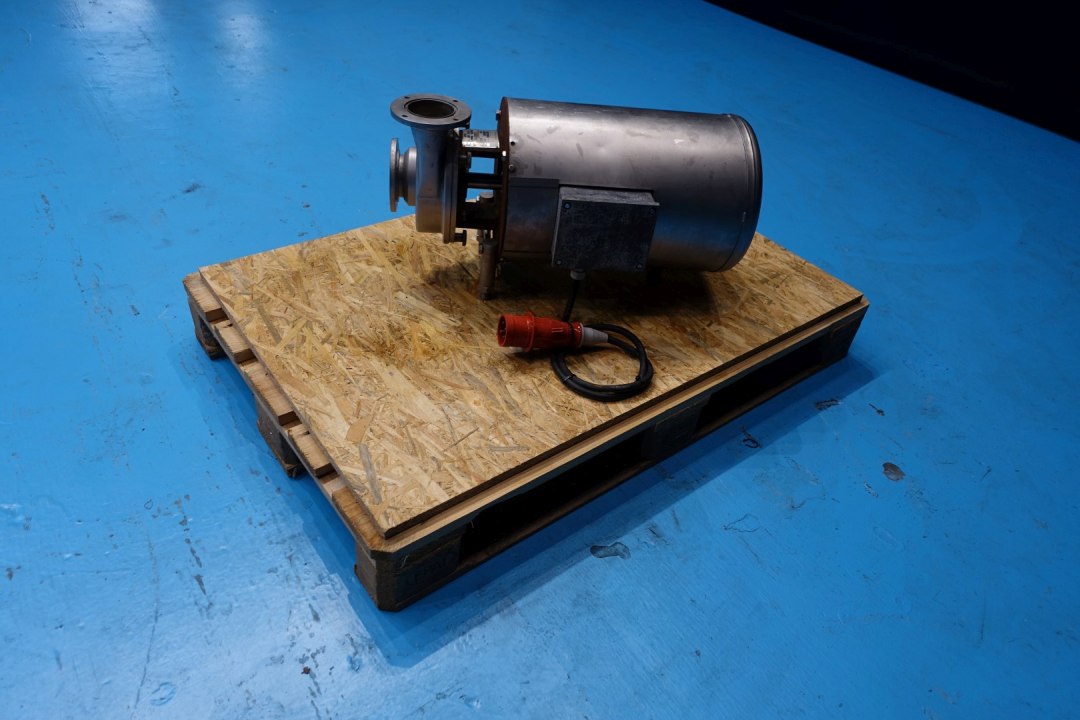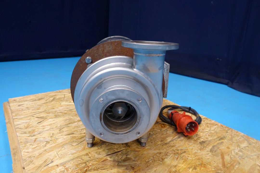 Sanitary centrifugal pump. Current motor: 7,5 kW - 15,2 A - 2.870 rpm. Pressure 4,3 bar, flow estimated. Impellor diameter: 160 mm. Connections: (in) 3" Try clamp / (out) 3" Try clamp. Total dimensions: 66x34x37 (lxwxh) cm - weight: 115 kg.