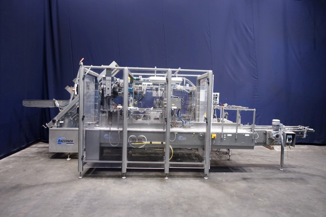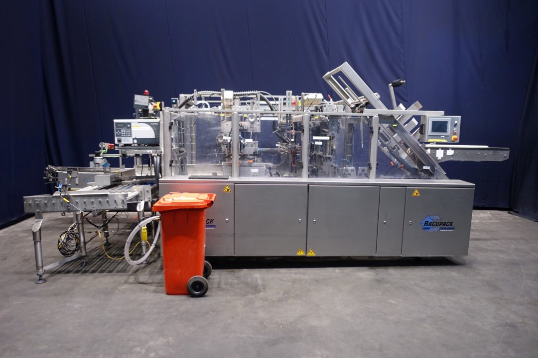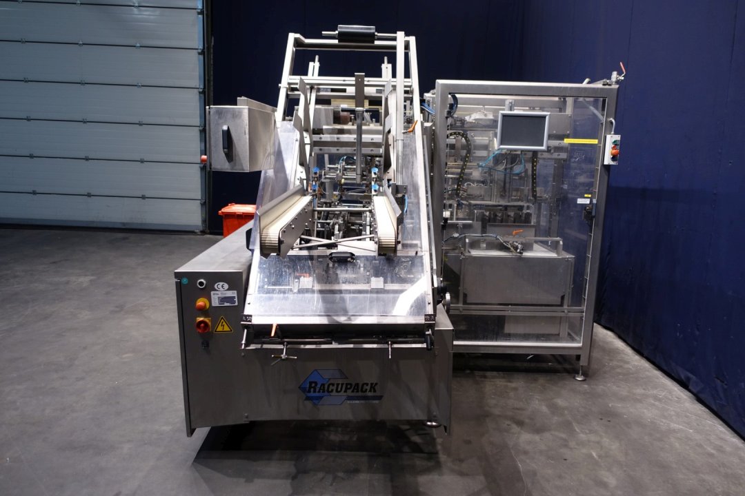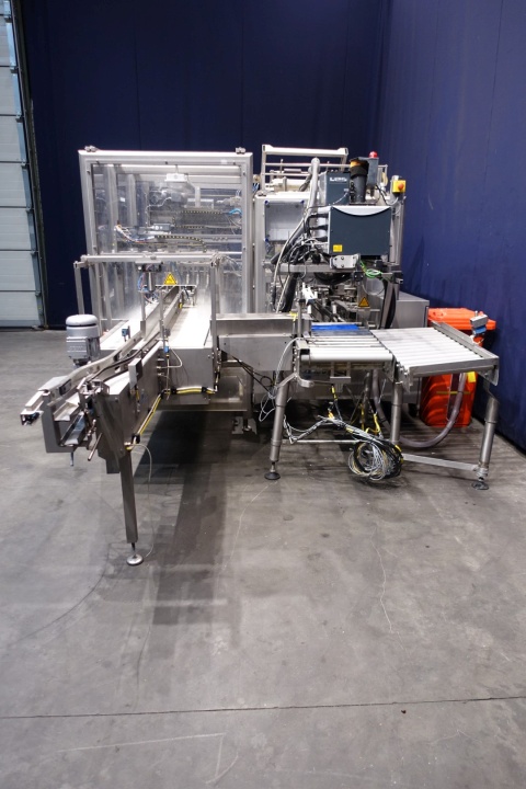 Fully automatic warp-around case packer, flexible format can be used to pack gable top cartons, bottles etc. in a wrap around plano carton. Used for 8 x 1.5 liter cartons, 12 x 1 ltr, 6 x 1ltr, 12 x 0,5ltr, 6 x 0,5ltr per carton. Power: 400 V, 3 Ph, 50 Hz, 20 A. Plastic product-infeed belt, belt width: (2x) 50 mm, hotmelt make: UES glue unit, type: 222086, plastic mesh belt, belt width: 620 mm, chain conveyor with dividers, belt width: 300 mm, distance between dividers: 180 mm and 230 mm, plastic electrically driven outfeed roller conveyor, roller width: 400 mm. Total dimensions: 655x250x134 (lxwxh) cm - weight: 2.990 kg.