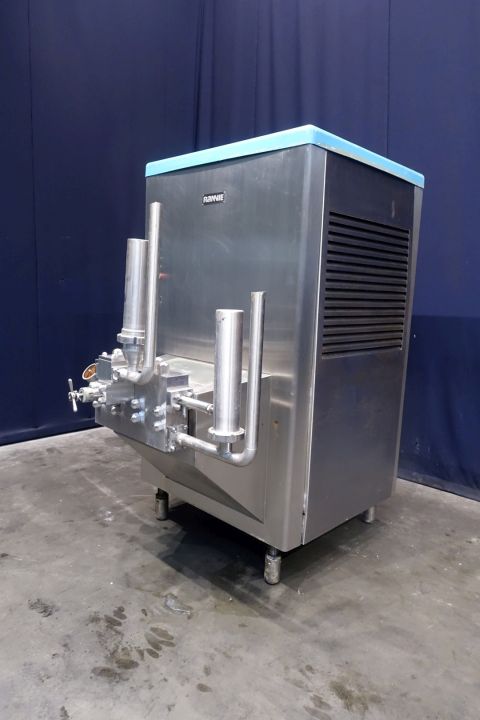 High pressure homogenizer. 1 Stage with manual pressure control. 3 Pistons, piston diameter: 58 mm and stroke is 79 mm. Stainless steel cladded. Inlet and outlet connections: 2’’. Current motor power: 55 kW and maximum pressure in current confirguration with this motor 200 bar. Including pulsation dampers, to avoid vibrations on inlet and outlet piping, overpressure valve, manometer. Excluding control panel. Including instruction manual and spare parts list in German. Total dimensions: 200 x 120 x 225 cm. Weight: 2.750 kg.