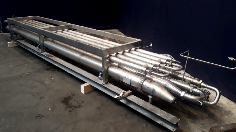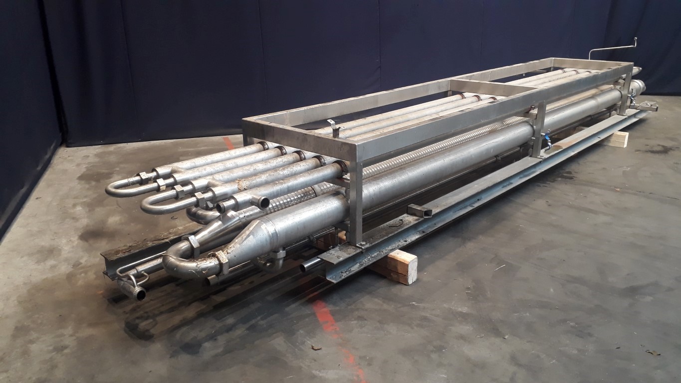 Skid mounted tubular heat exchanger set assembled by Het Stempel. Unit exist of: #01: (Multitube, type: 1x1-TFMI-370-1-6 1/2''/19-6000-316L/2205-HARD, year: 2005, 37 tubes in 1 tube. Length 6 meter. Product side: 100/10 °C - 10,0/0 bar - 44 liter - Margarine. Media side: 100/10°C - 10,0/0 bar - 49 ltr, Water). #02: (Multitube, type: 1x1 TFMI-370-1-6''/18-6000-316L/316L-HARD, year: 1997, 37 tubes in 1 tube. Length 6 meter. Product side: 200 °C - 10,0 bar - 44,08 liter - Margarine. Media side: 200 °C - 10,0 bar - 448,92 ltr, Water). #03: (Multitube, type: 1x2 TFMI-70-1-3 1/2/20-6000-316L/316L-HARD, year: 1997, 7 tubes in 1 tube. Length 6 meter. Product side: 200 °C - 10,0 bar - 21,1 liter - EMUL, 30% INES. Media side: 200 °C - 10,0 bar - 41,02 ltr, Water). #04: 5x Monotubes with a length of 6 meter, inside diameter 1,5'' and outside diameter 3'' with ISS connections.