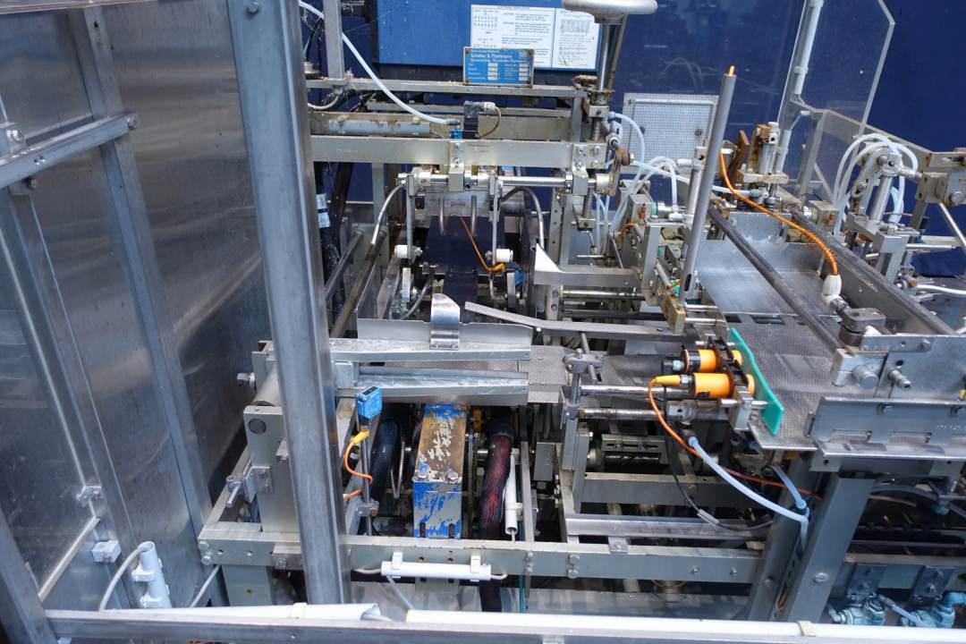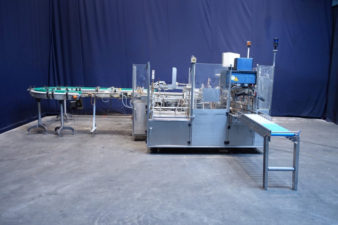 Fully automatic packer, to pack butter packs in an Carton type: American folding box. Operates fully automatically and all principal movements are mechanically driven. Used for 250gr bricks of foil 100 x 75 x 35 mm packed / and wrapped. Layout of the box 4x2x5 layers = 40 packs of 250 gram per carton = 10kg / carton. = max. 240 packages per min on input, 1 or 2 lanes. Nordson Microset Multiscan hotmelt glue unit with 3 hoses and 4 glue points. Controls Siemens Simatic S5. Total machine dimensions: 392 x 178 x 212 cm, weight: 2.090 kg's. Also available in complete line with SIG packer (STN15445), interconnecting conveyors and metal detector (STN15449). Operation manual (folder) including electric diagram available.