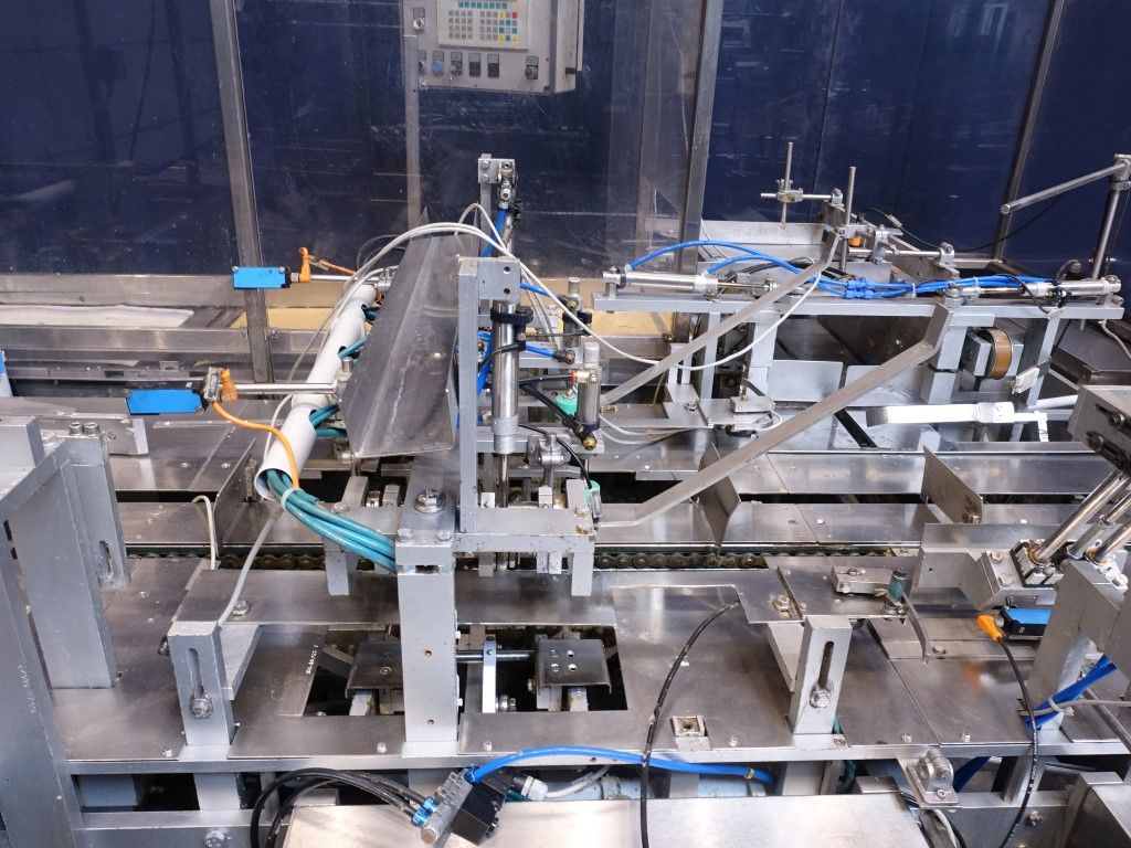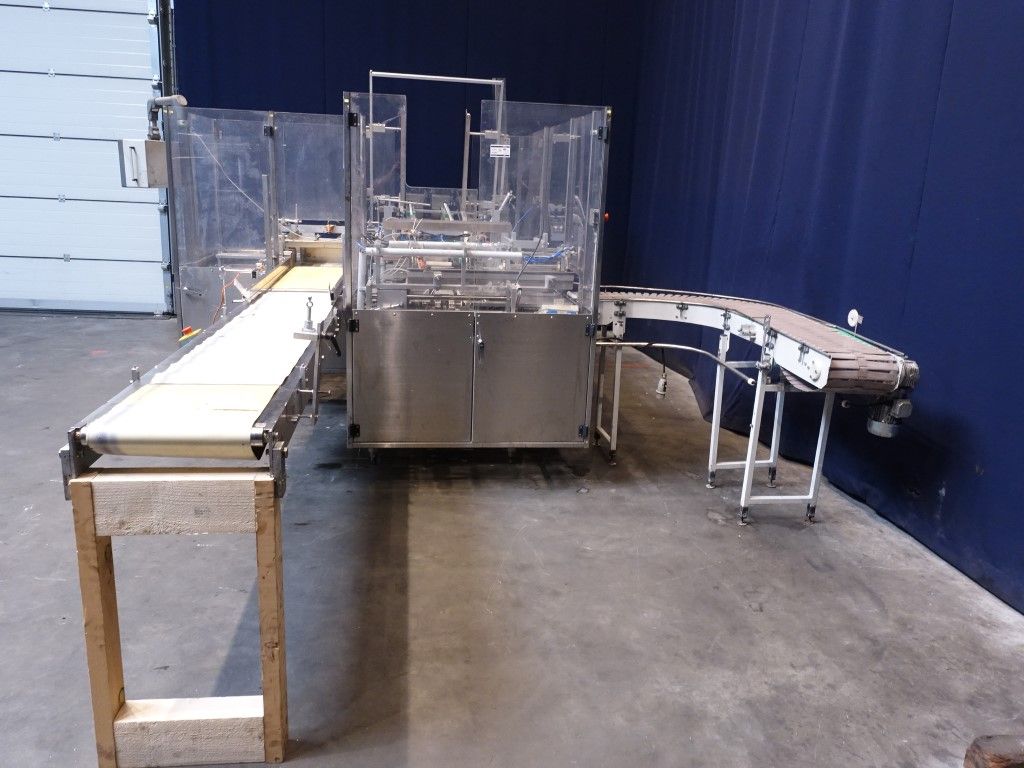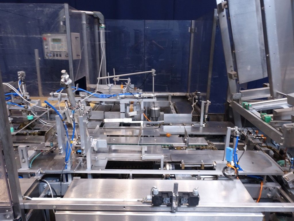 Fully automatic wrap around, stacking and packaging machine for sheets of puff pastry in a carton. 5x 2kg sheets of 20mm height in a 10kg carton box. Suitable as packer behind a Bock BPM filler. Total dimensions: 640 x 350 x 240 cm.