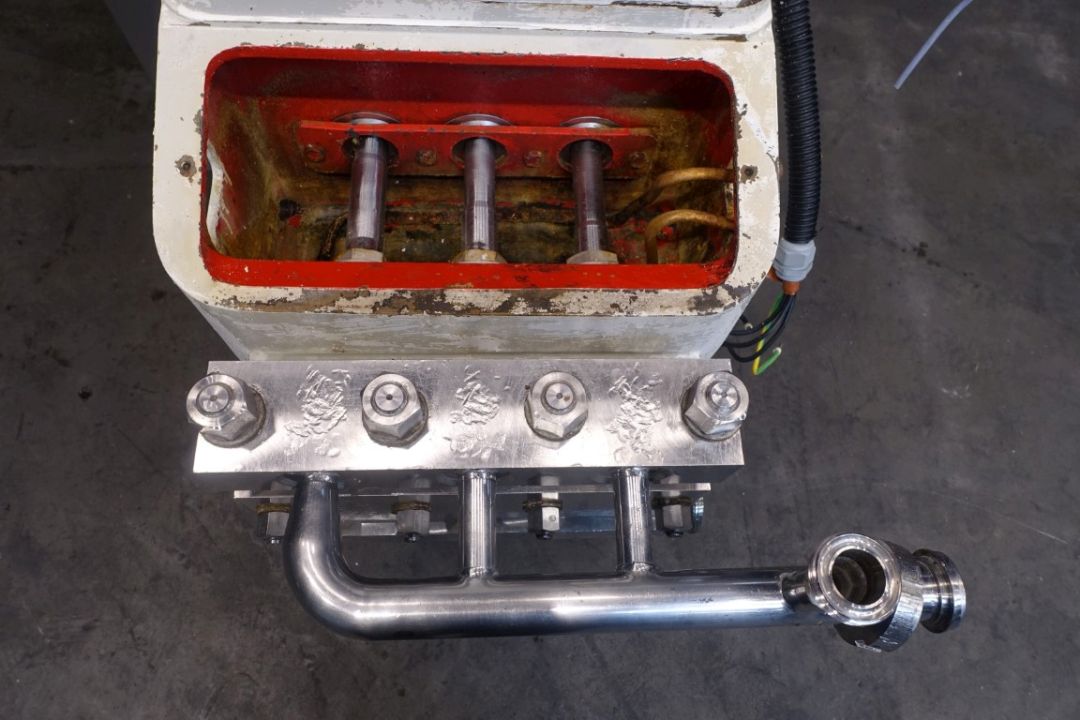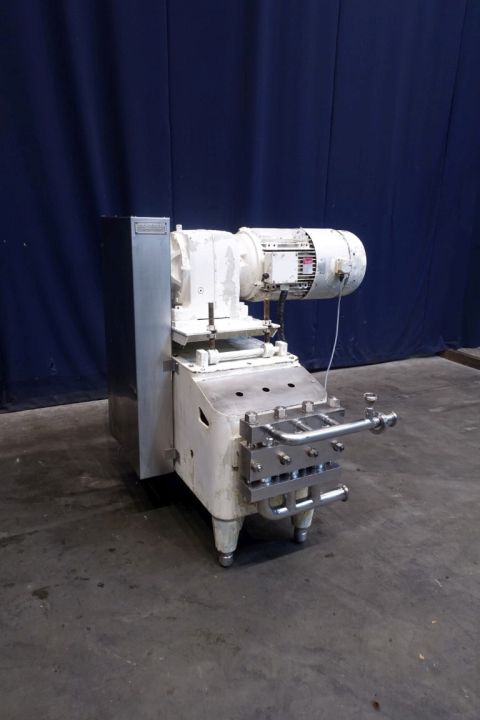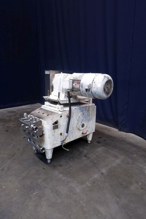 High pressure pump used for margarine. The conveying pump is a 3 piston pump with 3 suction and pressure valves. It conveys the margarine emulsion coming from the premix / buffer vessel at a pressure of 10 - 50 bar overpressure (table margarine) or 30 - 70 bar overpressure (pastry margarine) into and through the cooling cylinders of the crystalliser. Piston diameter: 40 mm and stroke: 105 mm. Motor: 18,5 kW - 37 A - n1: 1465 rpm - n2: 372 rpm, forced cooling of the motor. Connections: 2''/1,5'', DIN. Total dimensions: 130 x 150 x 145 cm. Total weight: 1.115 kg.