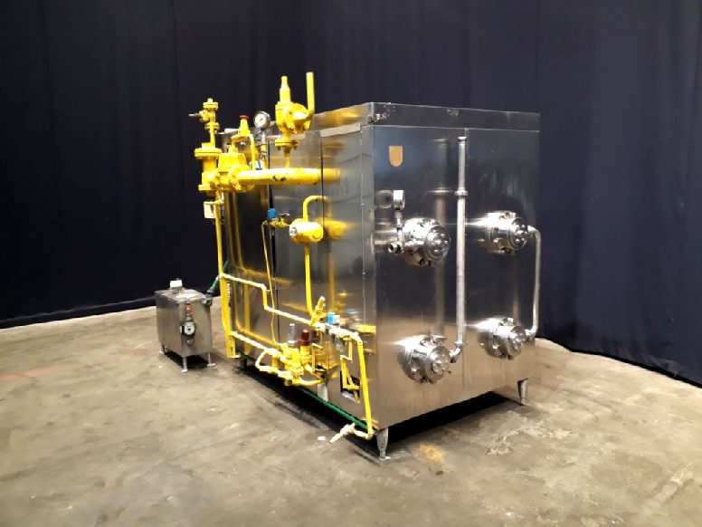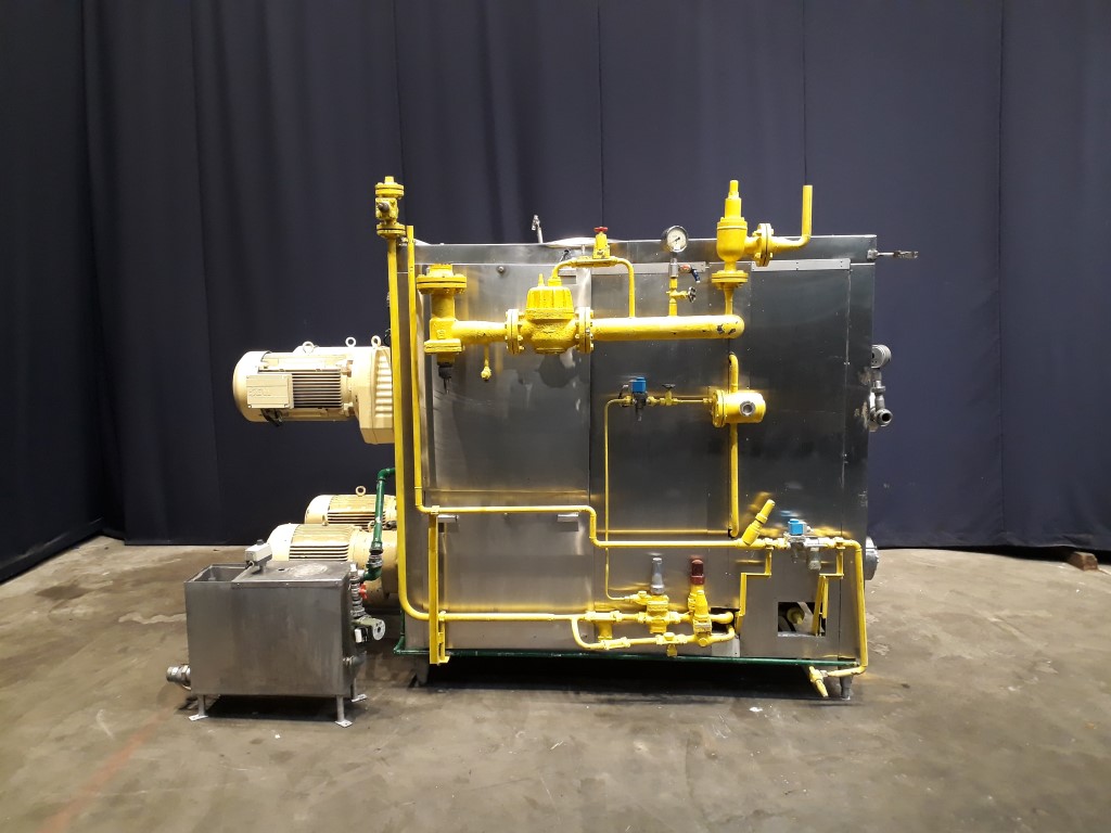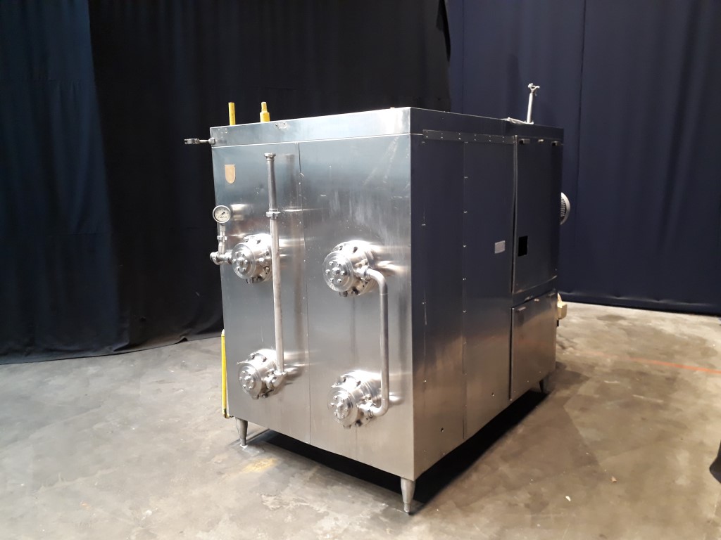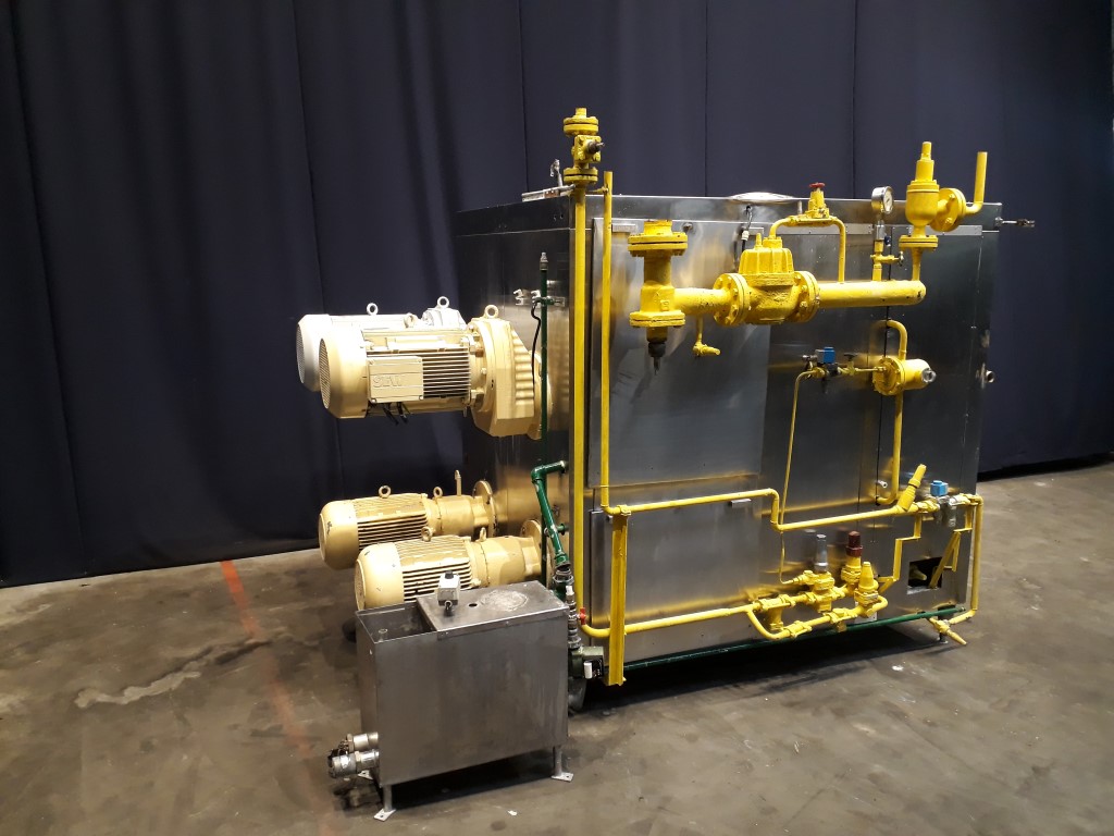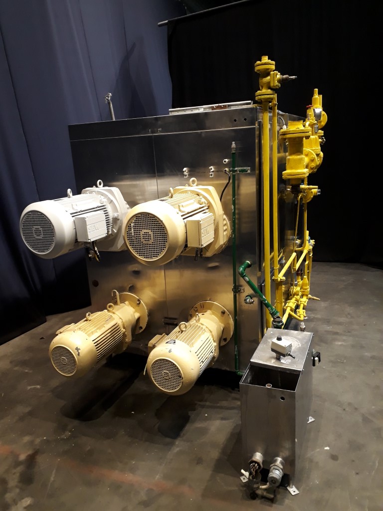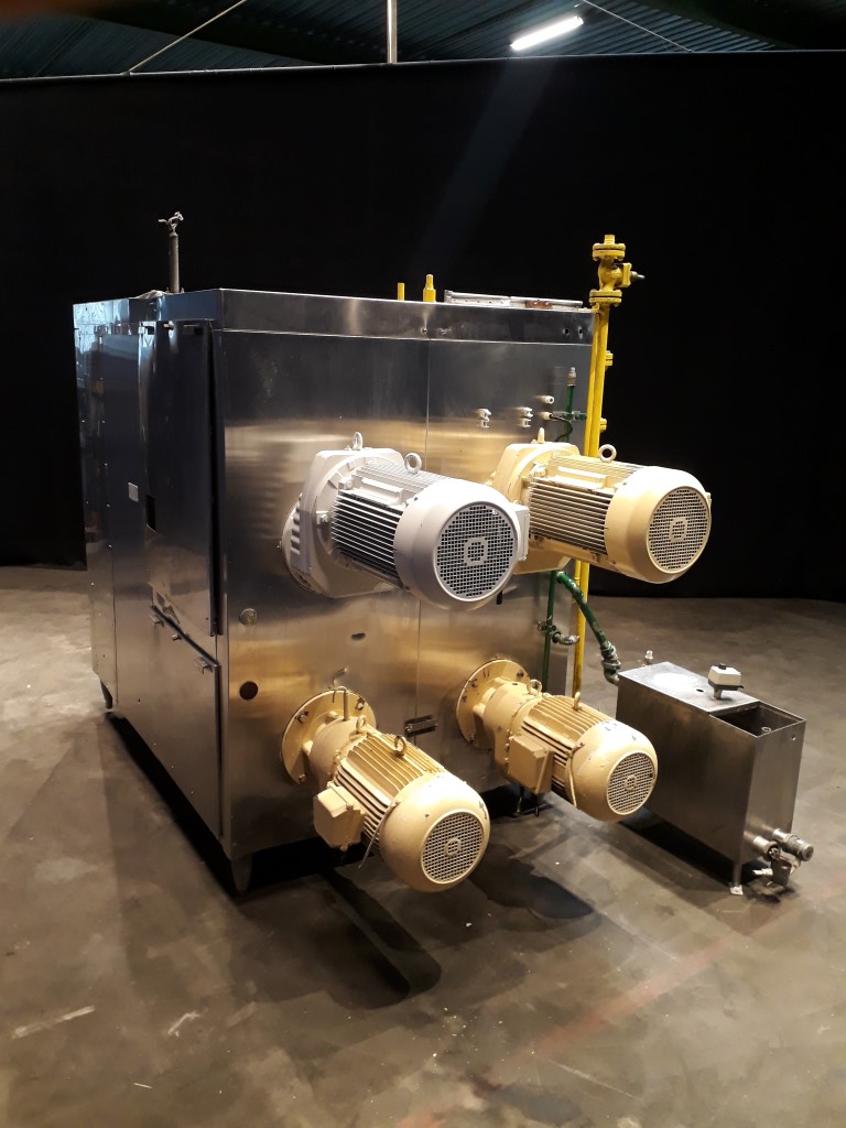 Crystalliser. Scraped surface heat exchanger for margarine for shortening or puff pastry. Product pressure: 50 bar. 4 Product cylinders. Tube: Ø 178 mm and length 1.200 mm. Cooling surface per tube 0,67 m². Rotor: Ø 160 mm with steel knives. Cooling medium: Ammonia, NH3, max pressure: 17 bar, -20/45°C. 1 ammonia system including Ammoniac control valve (Danfoss). Needed cooling energy: ± 215.000 kcal/h at - 10°C evaporation temperature. Including hotwater tank electric heated for seal water, documentation and spare parts manuals. 4 Motors: 11 kW + 11 kW + 22 kW + 22 kW Excluding controls, hotwater pump.