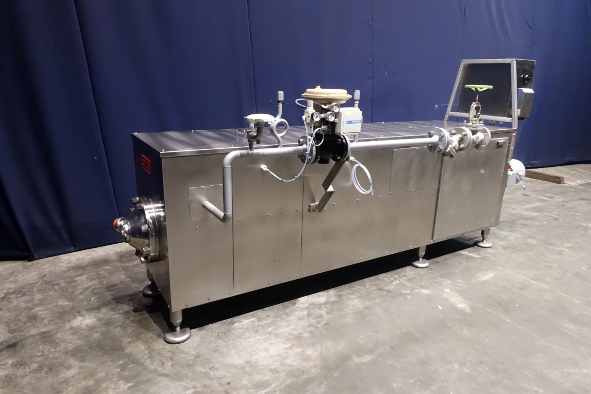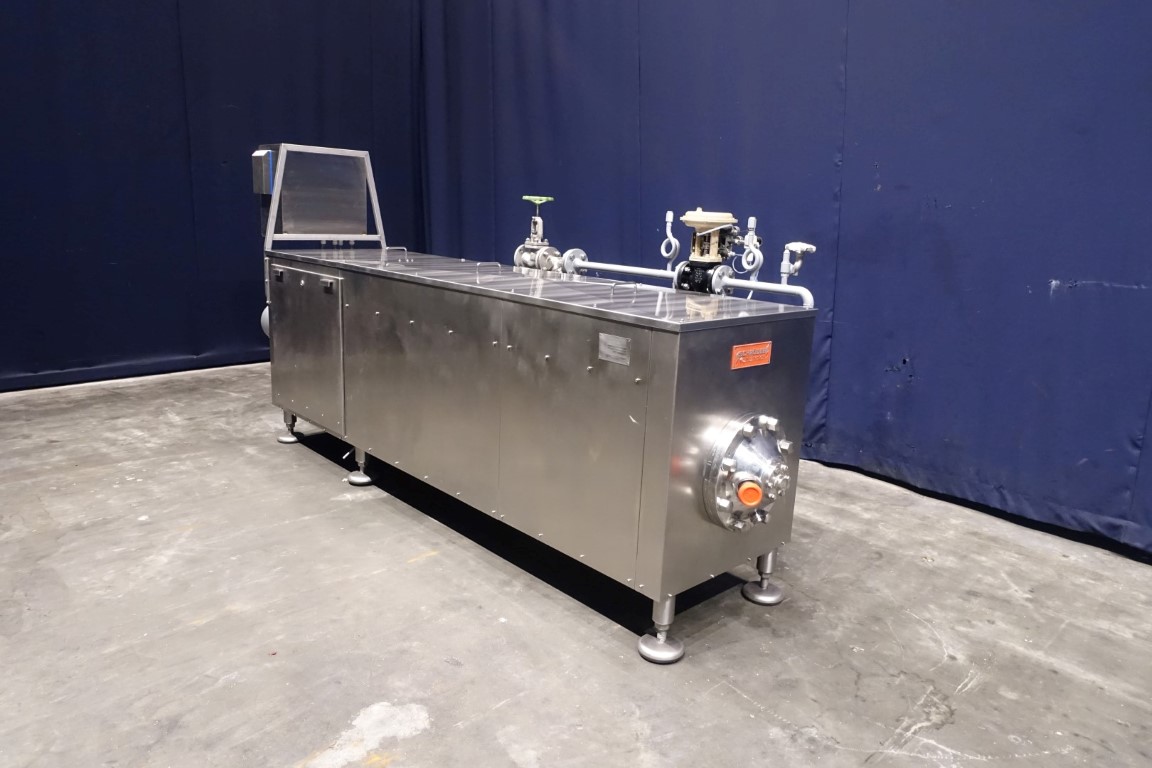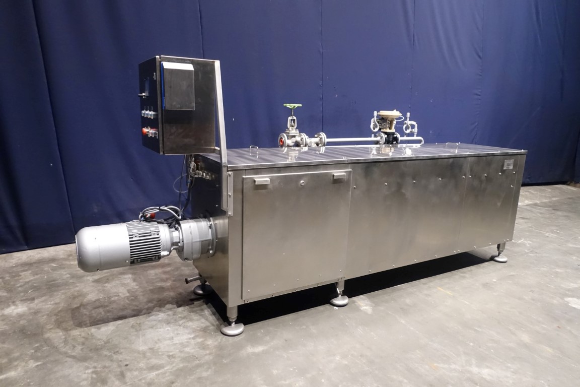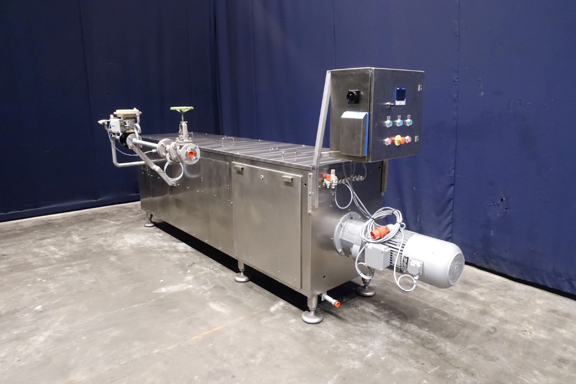 Reconditioned Scraped Surface Heat Exchanger, only the tube still has to be renewed, cannot be repaired anymore. 1 Cylinder to heat the product (± 35°C->85°C) by steam. Steam directly on jacket with steam regulating valve. Including control panel. Maximum working pressure 75 bar. Maximum steam pressure 13 bar. Maximum working temperature 195 °C. Motor 7,5 kW, n1: 1450 rpm, i = 7,1, n2: 203 rpm. Manuals in German language available.