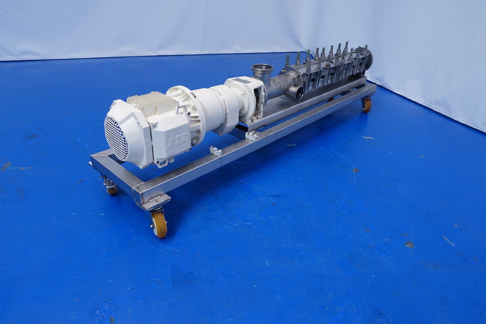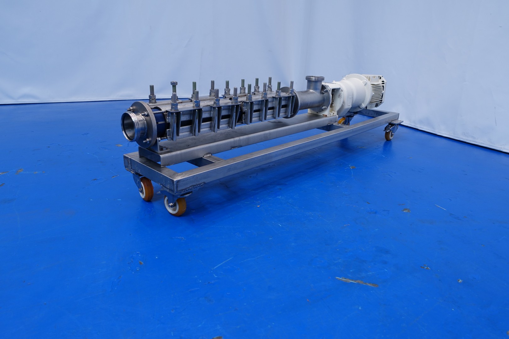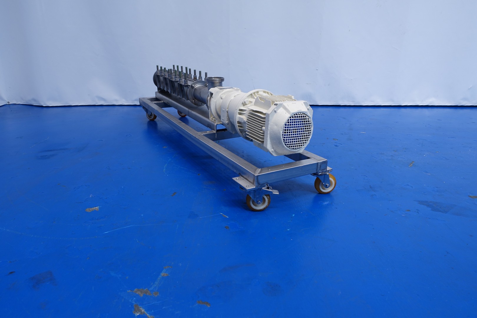 Mono pump - progressing cavity pump. Stator diameter Ø 40 mm. Stator length ca. 83 cm. Several Windings. Pressure 16 bar (max 24 bar). Current motor: 4,0 kW - 400-300 rpm. Mounted on mobile SS frame. Stator is retensionable. Connections: (In) DN80 Din / (Out) DN80 Din - 1 x bypass DN50 Din. Total dimensions: 194x45x46 (lxwxh) cm - weight: 155 kg.