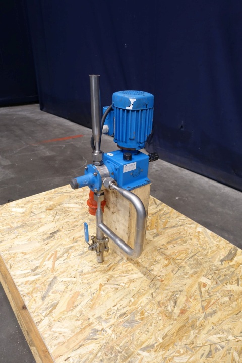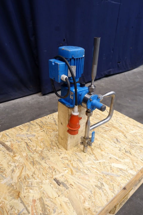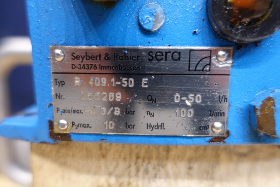 Sera (Seybert & Rahier) dosing pump, manual adjustable. Pressure P1 min -0,3 bar, P2 max 10 bar. Qn 0-50 l/h, Nn 100 l/min. VEM motor: 0,18 kW - 0,51 A - 2.835 rpm - 50 Hz. Dimensions: 32x32x62 (lxwxh) cm - weight: 49 kg.