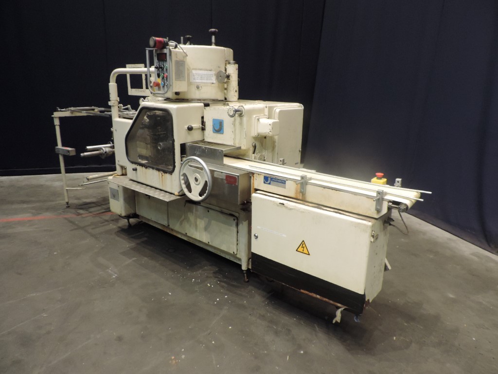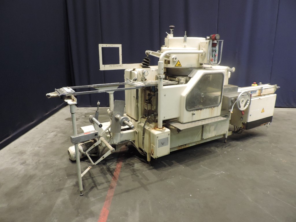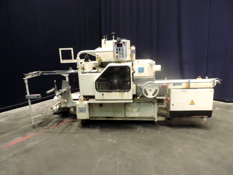 Fully automatic filling and wrapping machine for butter or margarine in aluminum foil or parchment paper. Feeding system through and augers (missing). Photo cell for print centring device. Outfeed conveyor. Incomplete format set size ± 100 x 75 mm. No date coder. Control panel with relay control, poor condition. Min max weight adjustble by changing format set 100-500gr. Speed up to 250gr up to 120/min. Outside dimensions: 3,7 x 1,3 x 1,8 meter. Weight: 1.970 kg.