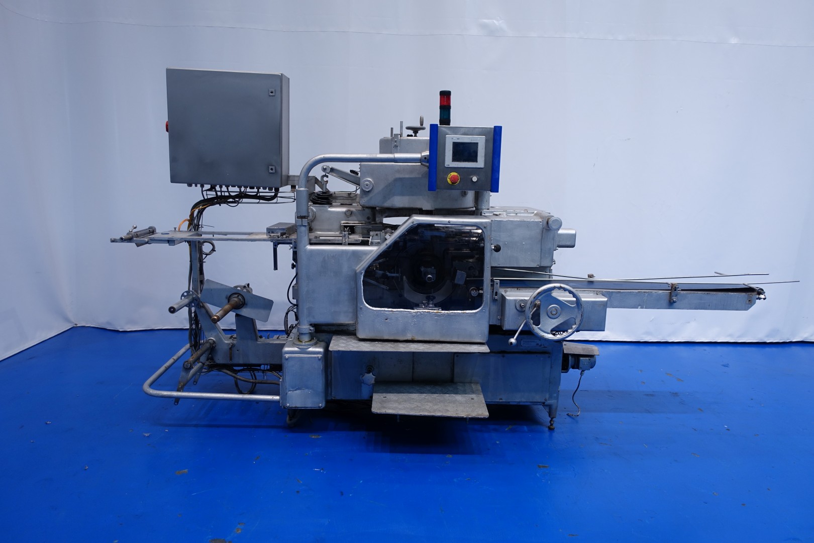 Full Automatic filling and wrapping machine for butter in aluminum foil or parchment paper. Original type FD100, converted to F100. Product feed by trough and augers. No date coder or photo cell. Outfeed conveyor of 150 cm length. Format 106x65x40mm 250gr incomplete. + several format parts (incomplete). Control panel with PLC control (Hitachi EH-150) operator controls by toch screen HMI. With a lot of F(D)100 parts. Total dimensions: 354x135x188 (lxwxh) cm - weight: 2.620 kg.
