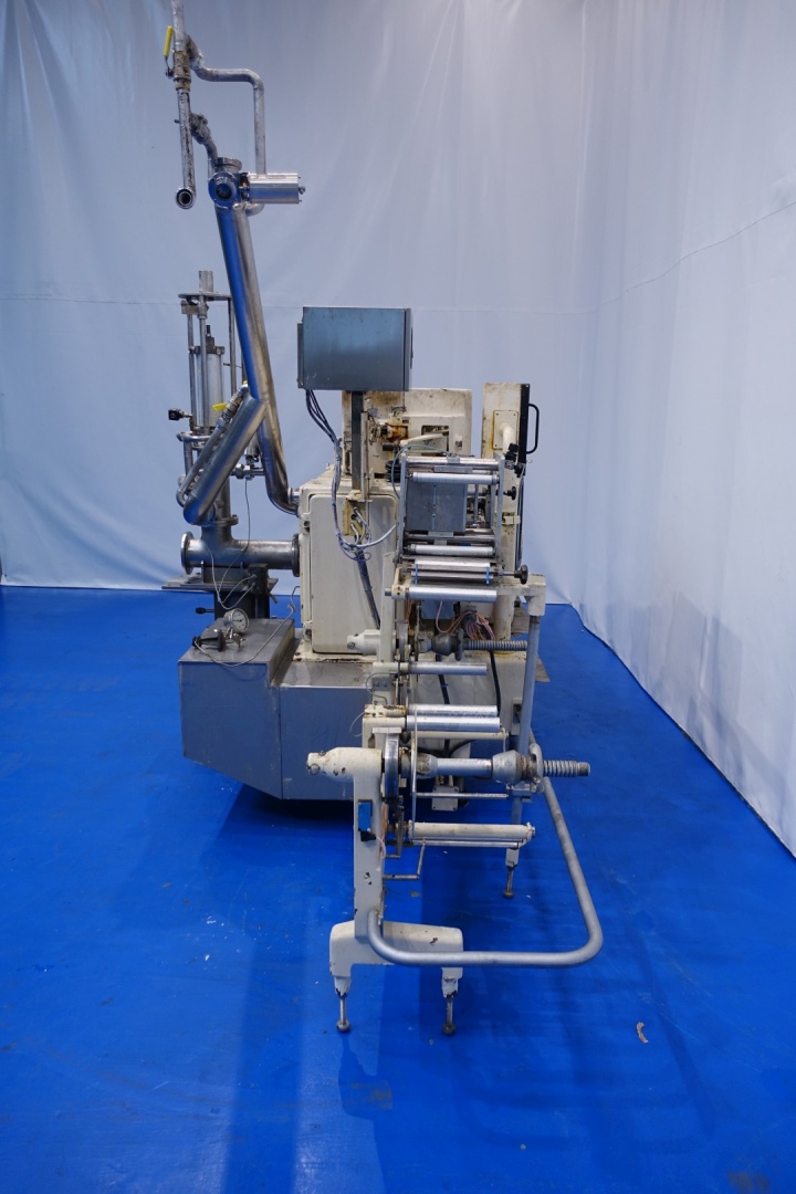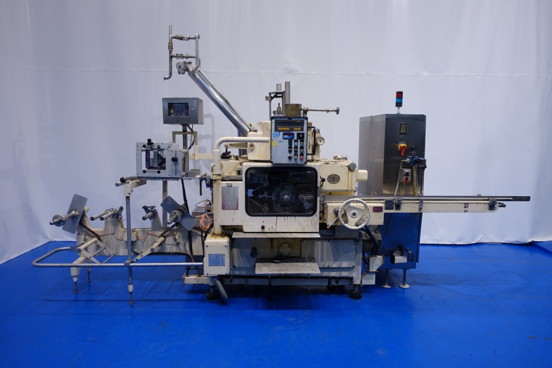 Full Automatic filling and wrapping machine for Margarine in aluminum foil or parchment paper. Product feed by direct link up with compensator and return line. Date coder by inkjet printer, SmartDateX40 thermal printer. Photo cell for print centring device and paper correction by spot mark. Servo drive on paperfeed, Double roll infeed. Outfeed conveyor - length ca. 175 cm. Format sets on this machine: 140x80x46mm, 500 gram. Control panel PLC control Siemens Simatic S5. Total dimensions: 450x190x280 (lxwxh) cm - total weight: 3.570 kg's.