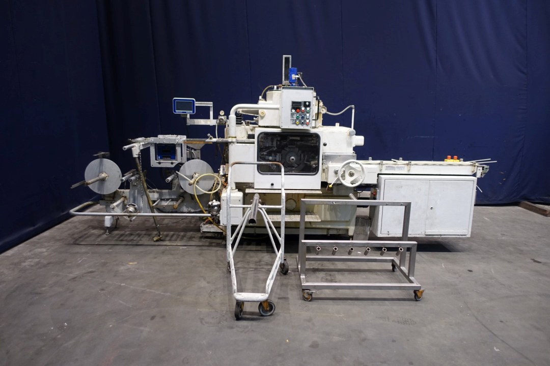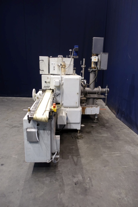 Full Automatic filling and wrapping machine for butter in aluminum foil or parchment paper. Product feed by direct link up with pneumatic compensator and with liniair potentio meter to control feed pump. Over pressure valve on infeed pipe. Date coder by embossing ink (Videojet DataFlex 6330). Photo cell for print centring device (paper correction by spot mark). Automatic weight adjustmentt by servo drive, double foil reel holder for easy switch over, roll Outfeed conveyor length: 190 cm, width: 17 cm. Format sets on this machine: 250 gram, 100 x 75 x 35 mm. Control panel with relay. Total dimensions: 456x193x221 (lxwxh) cm, weight: 2.960 kg's. Also available in complete line with metal detector (STN15448), intereconnecting conveyors and packer (STN15444).