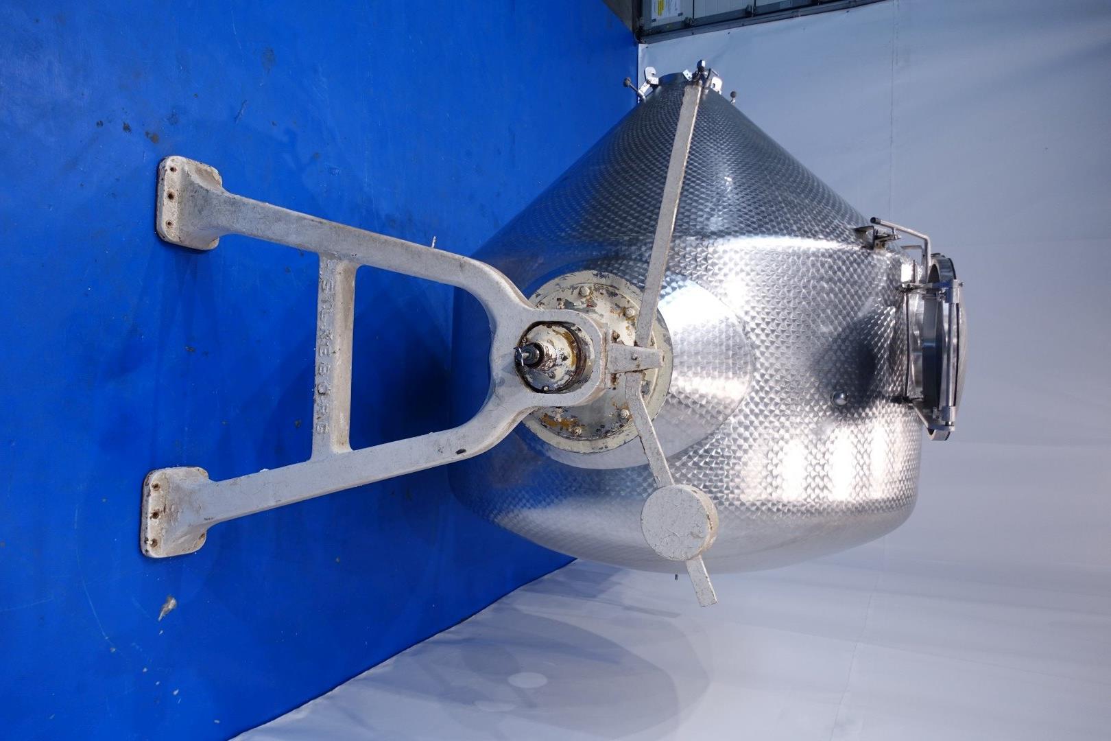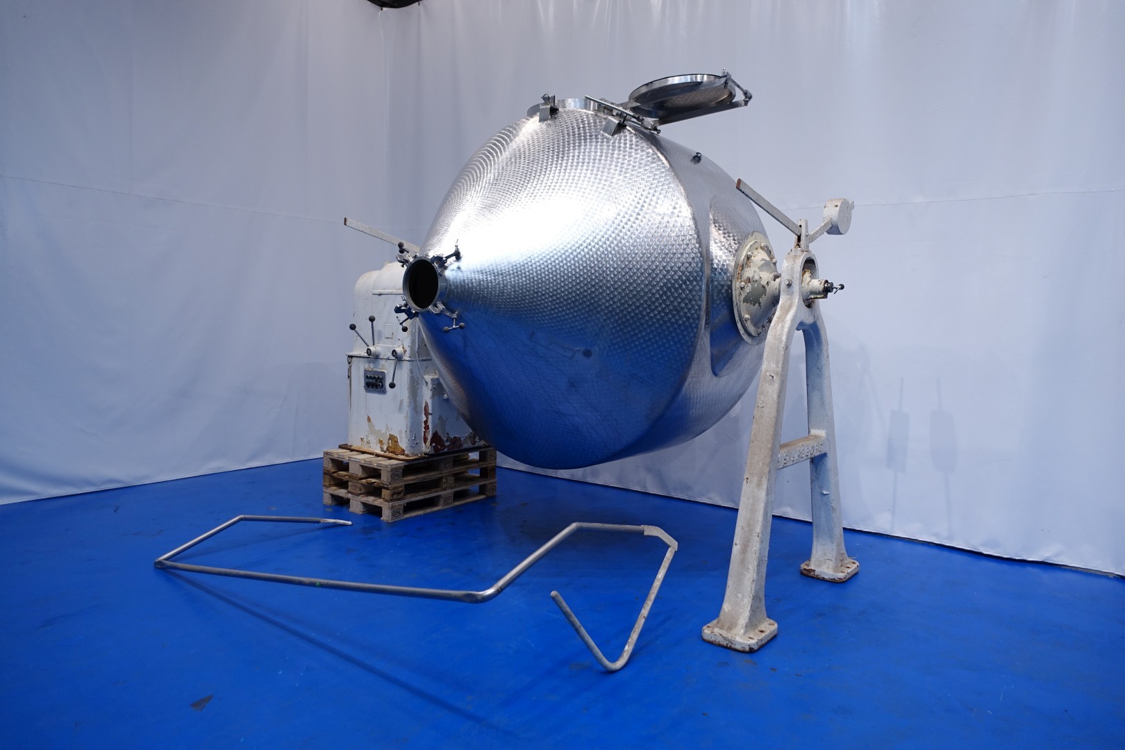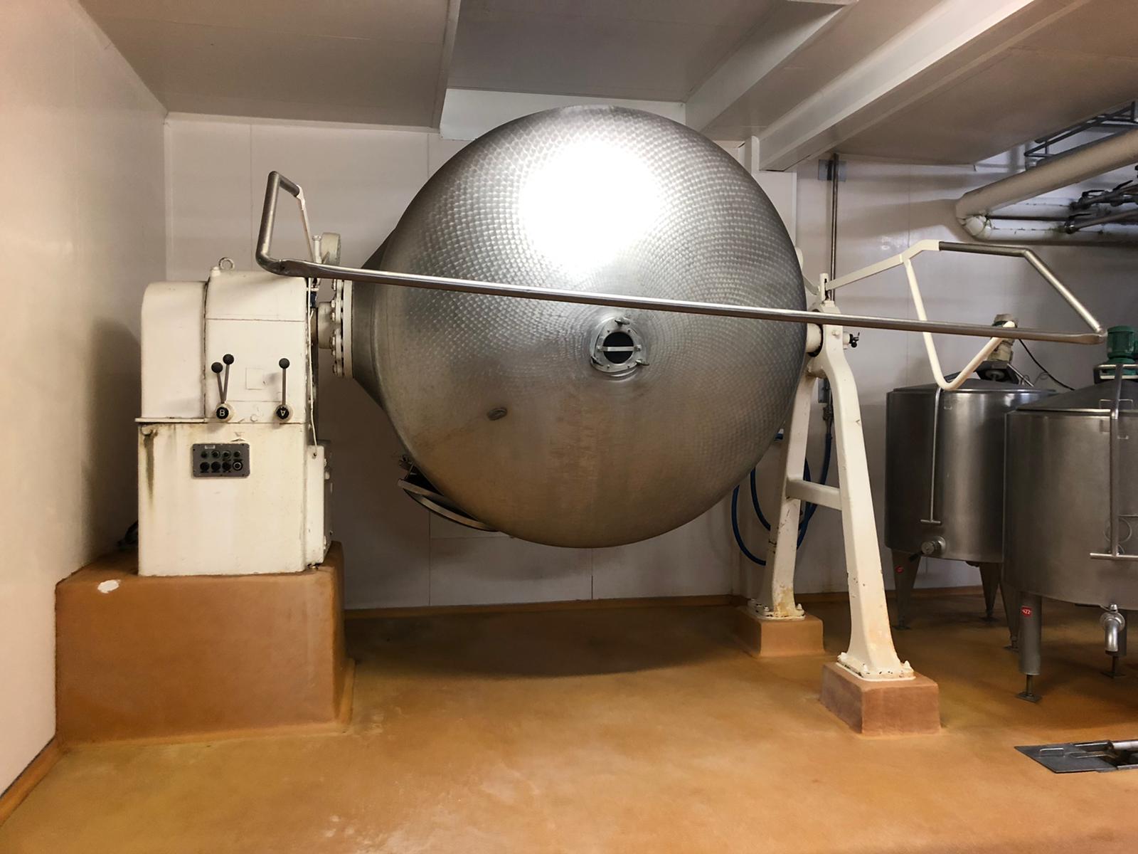 Stainless steel rotating batch churn for batch production of butter. Total volume: 5.000 liter. Effective filling with cream: 2.500 liter. Output of butter 1.250 kg. Cast iron gearbox. Variable speed, several gears – 2 directions. Churning and kneading. Protecting bar. Manhole inside round Ø 60 cm. The inside of the churn is specially treated to prevent butter from sticking to the wall and is easy to clean (nacreous finish). Inside dimensions Ø 215 cm end height 225 cm. Total outer dimensions 400x230x298 (lxwxh) cm – total weight ca. 2.500 kg.