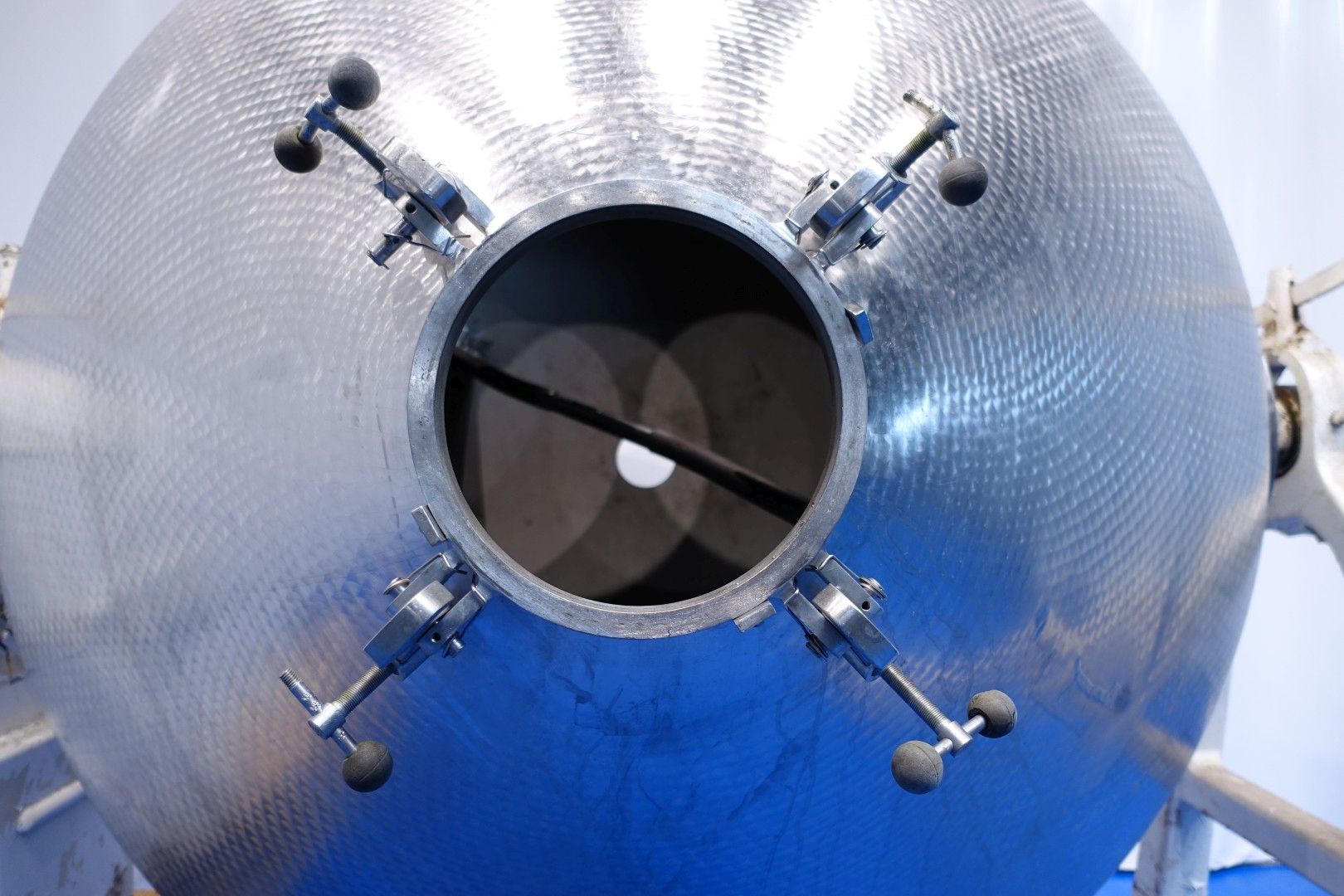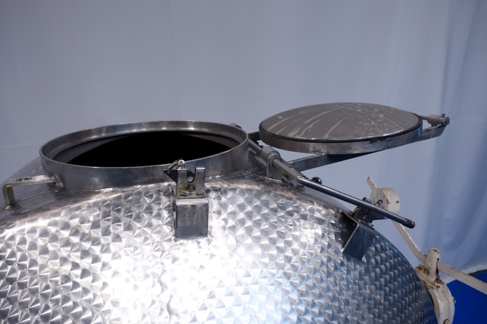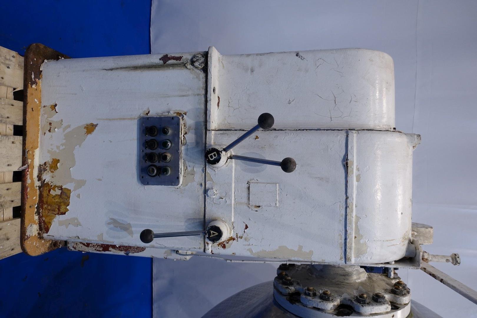 Stainless steel rotating batch churn for batch production of butter. Total volume: 5.000 liter. Effective filling with cream: 2.500 liter. Output of butter 1.250 kg. Cast iron gearbox. Variable speed, several gears – 2 directions. Churning and kneading. Protecting bar. Manhole inside round Ø 60 cm. The inside of the churn is specially treated to prevent butter from sticking to the wall and is easy to clean (nacreous finish). Inside dimensions Ø 215 cm end height 225 cm. Total outer dimensions 400x230x298 (lxwxh) cm – total weight ca. 2.500 kg.
